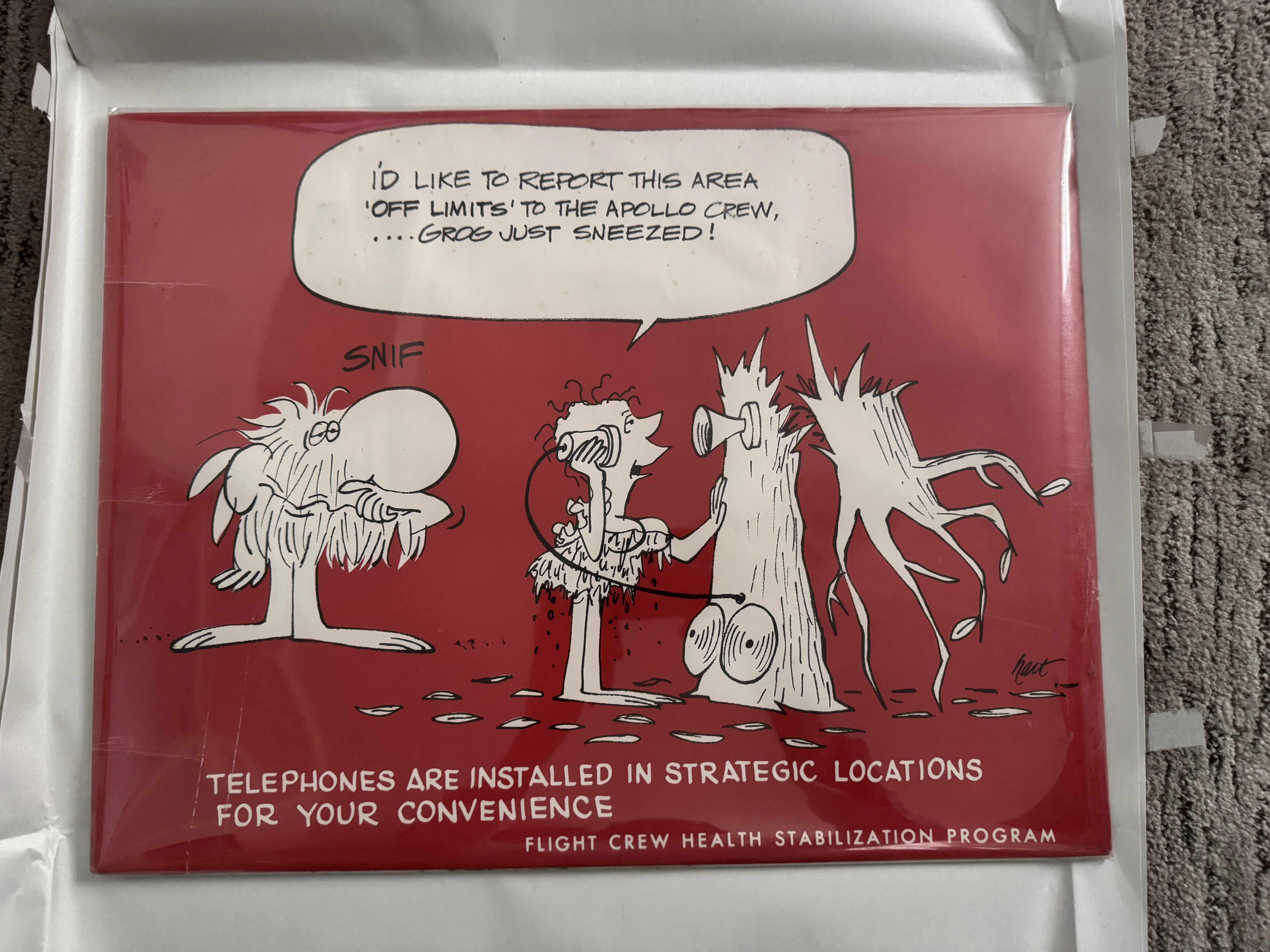 Picked this up at an antique store near me. Johnny Hart, creator of BC Comics, made these for the Apollo crew health program. I can’t find much on the internet about this specific illustration, but apparently Johnny Hart contributed to Apollo 12, 13 and 14 and he was presented a NASA public service award in 1972.