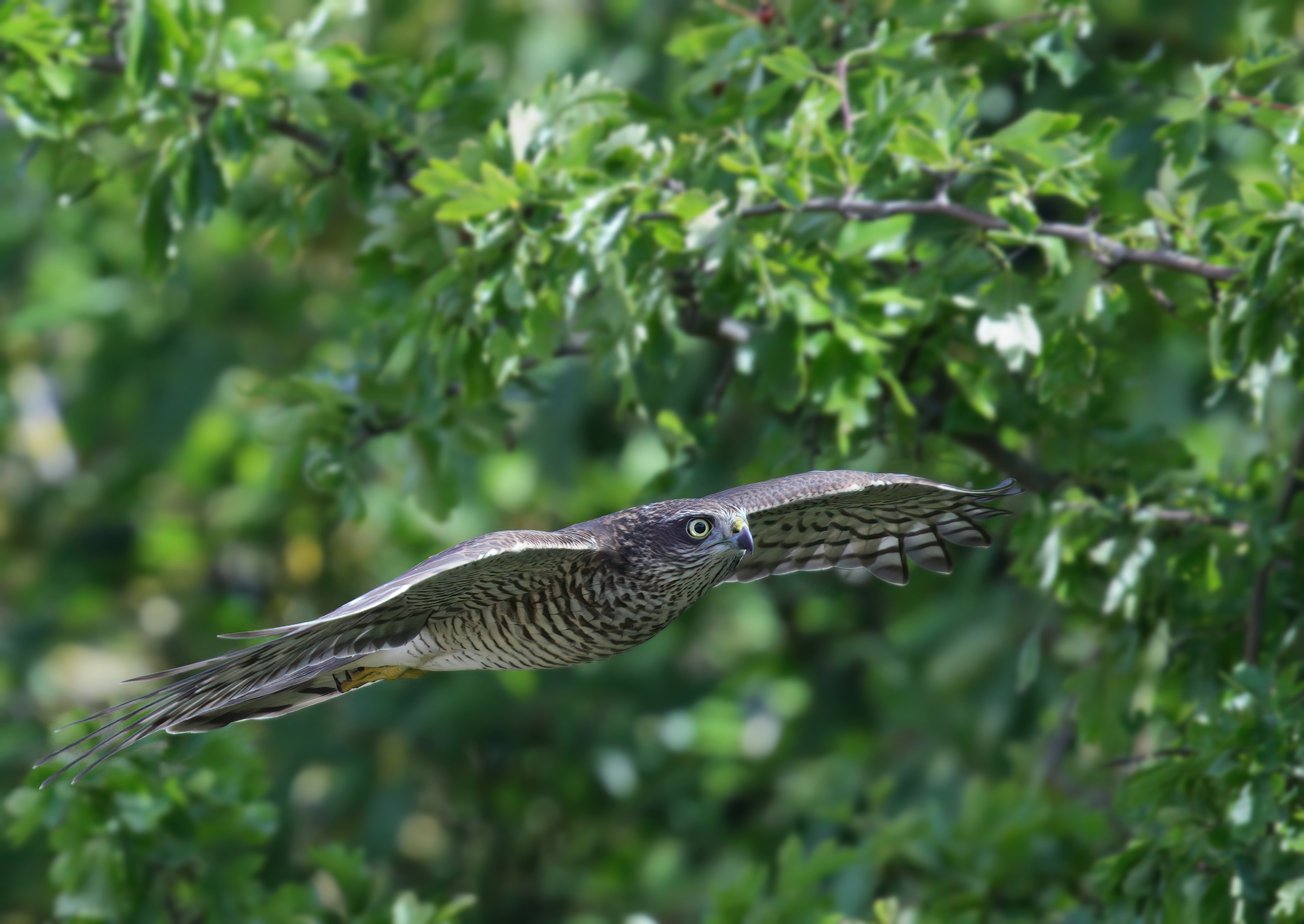 My sister... lives in a very steep-sided tree-lined valley and has a feeding table for the passerines. The Sparrowhawks will dive in almost vertically, grab their lunch and be out of there
