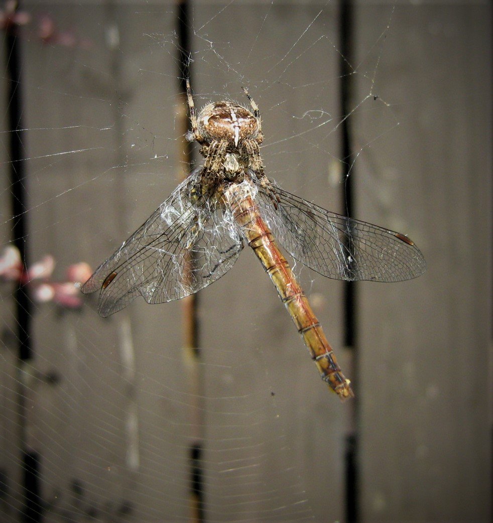 Myself and my wife were doing some gardening when she spotted this poor Brown Hawker Dragonfly being digested by a big brown spider.