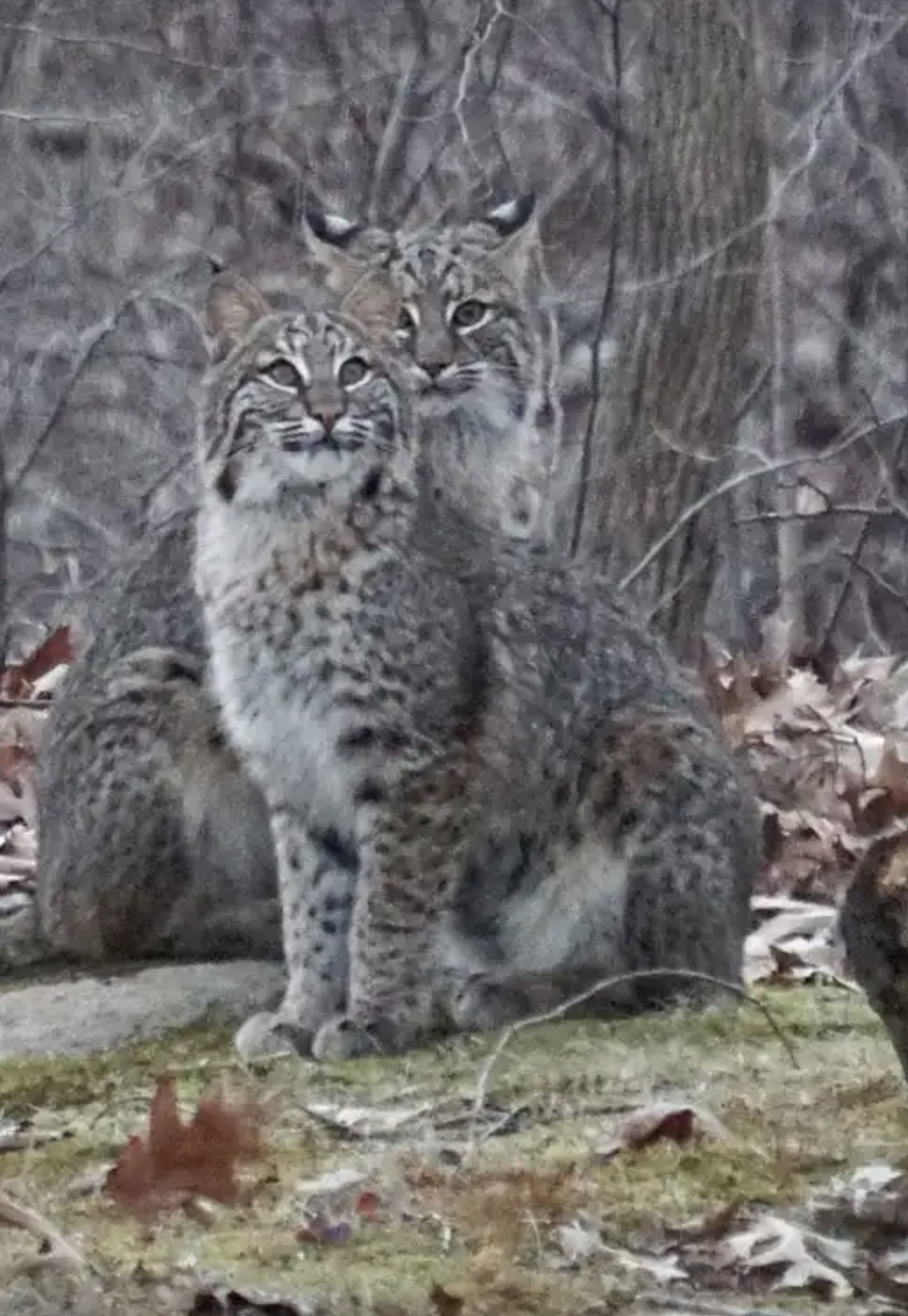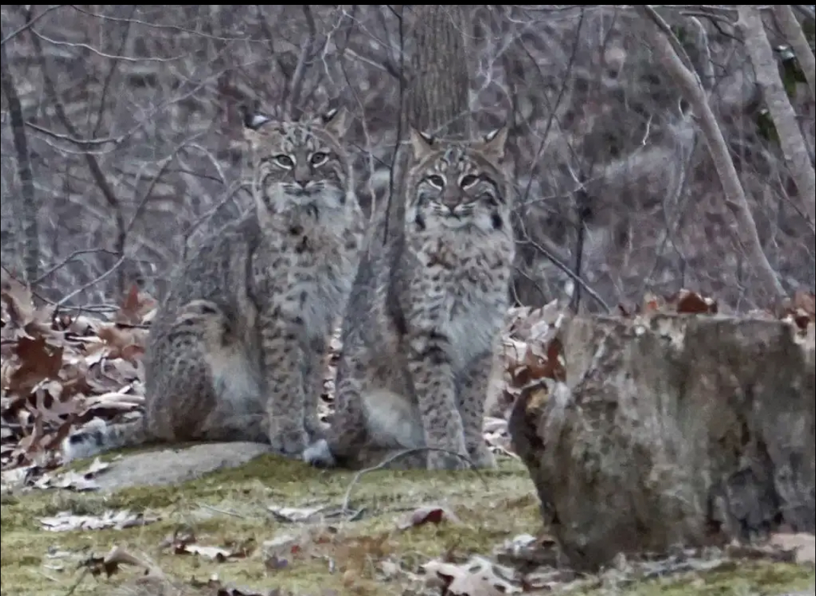 I don't think two grown males would be "romping and playing", bobcats are solitary most of the time and very territorial. Plus these two look different in size to me. However playing is typical pre-mating behaviour, so I hope we get your friend's photos of some cute kittens in a few months time.