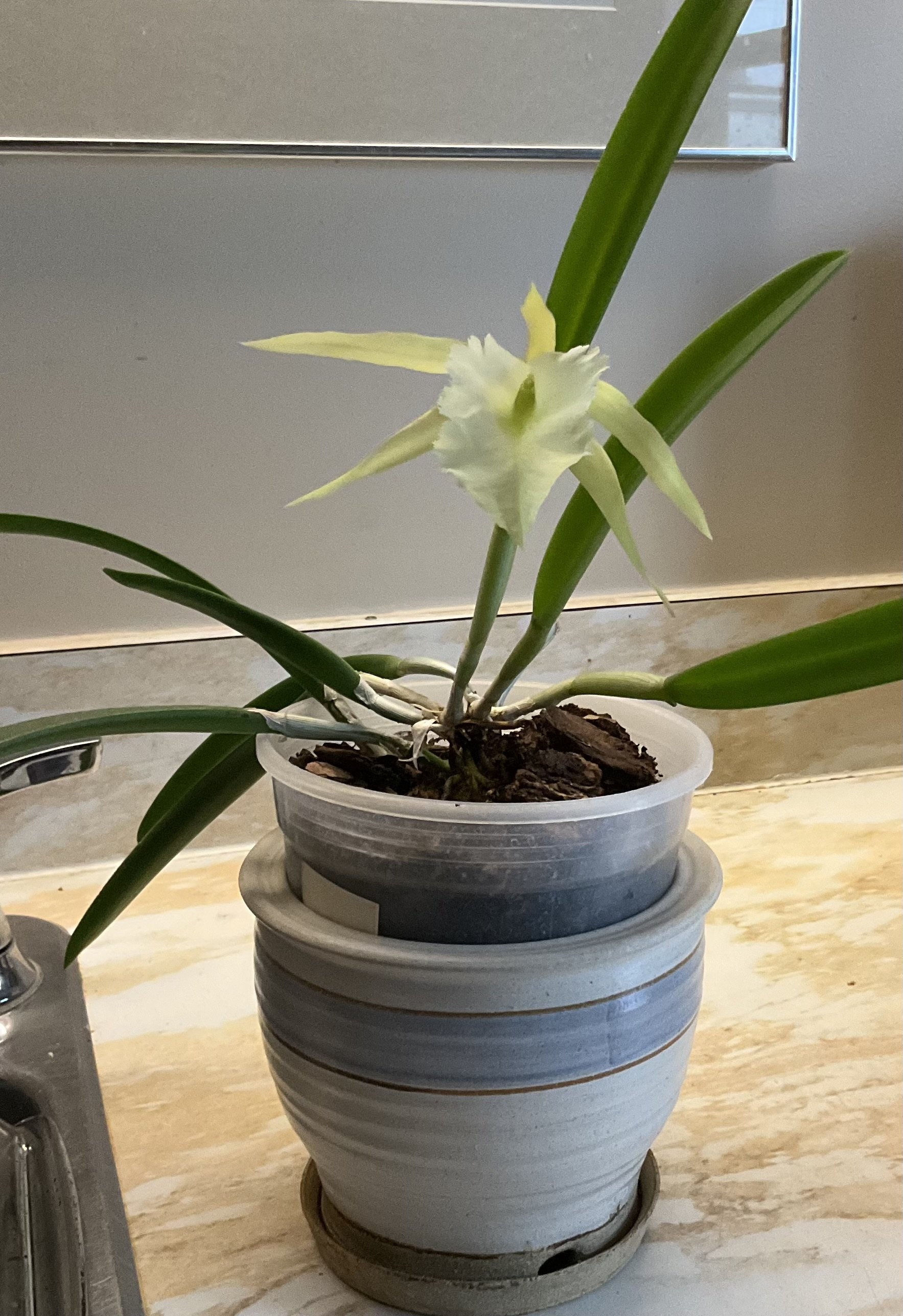 One thing you learn about orchids is that they have a mind of their own as to when and how often to bloom. This one hasn’t bloomed for 5 or 6 years. But it is important to not give up! My spouse knows the species name for this one, but IIRC, it is called “Tinker Bell”. We were hoping it would be in bloom for her ladyship’s birthday on Oct. 16.