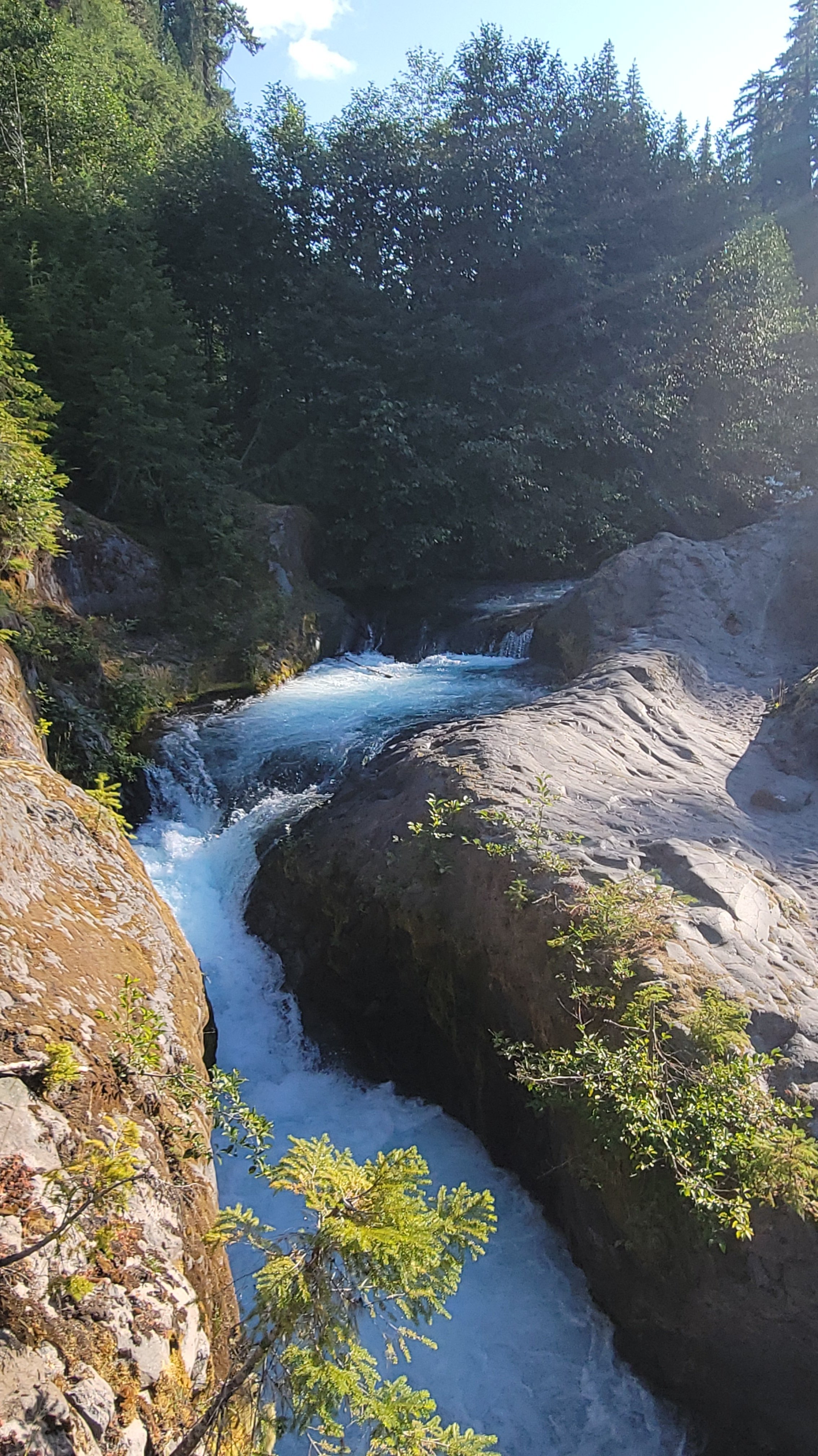 The snow melt from the mountain cuts through a much older lava flow leaving behind a series of waterfalls. This water is moving incredibly fast!