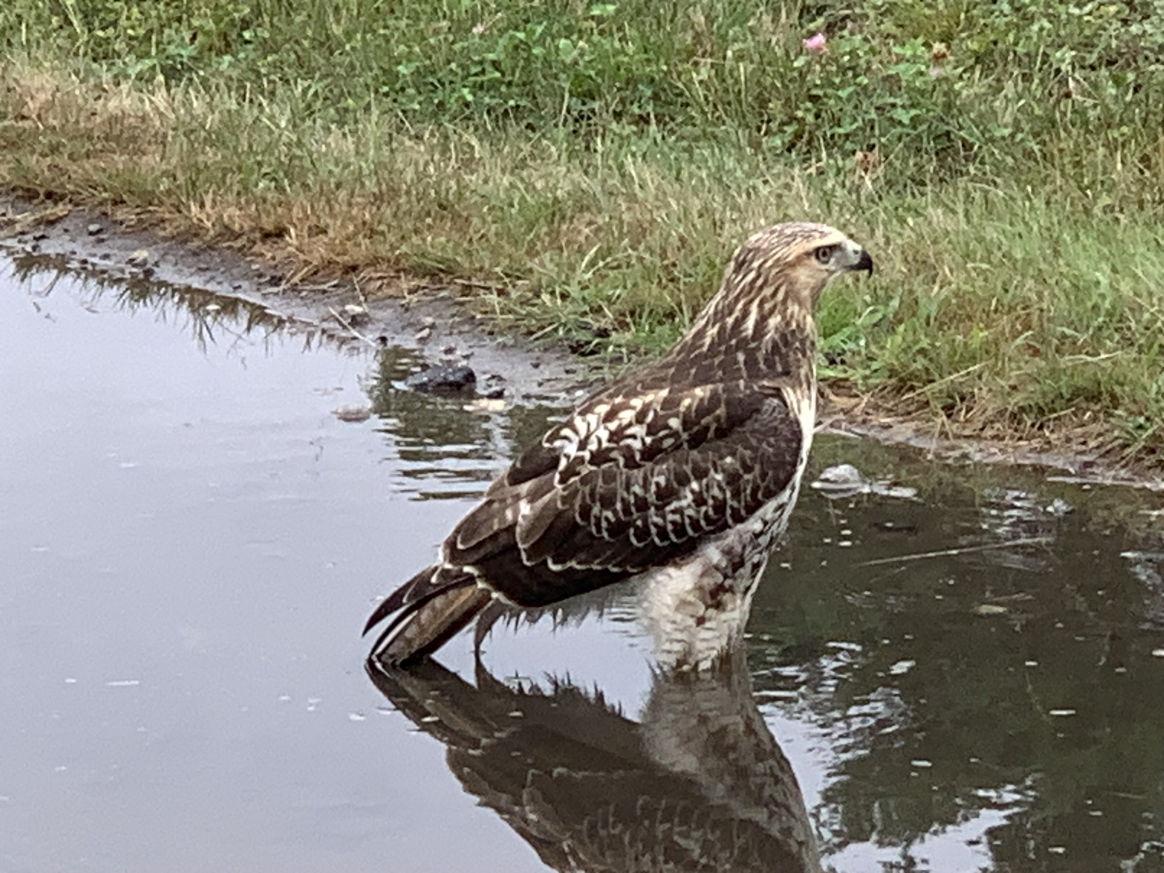 My wife and I have been following the development of three Cooper hawk fledglings that hatched in the city woods/forest across the street from our house. It鈥檚 been awesome to watch these young hawks over the past month or so, and yesterday a neighbor sent me these pics; one of the fledglings found its way to a fresh rain puddle at a neighboring cemetery. Neighbor Matt, aka Matty Ice, said he stood there and talked with the hawk for several minutes as it bathed itself in the puddle.