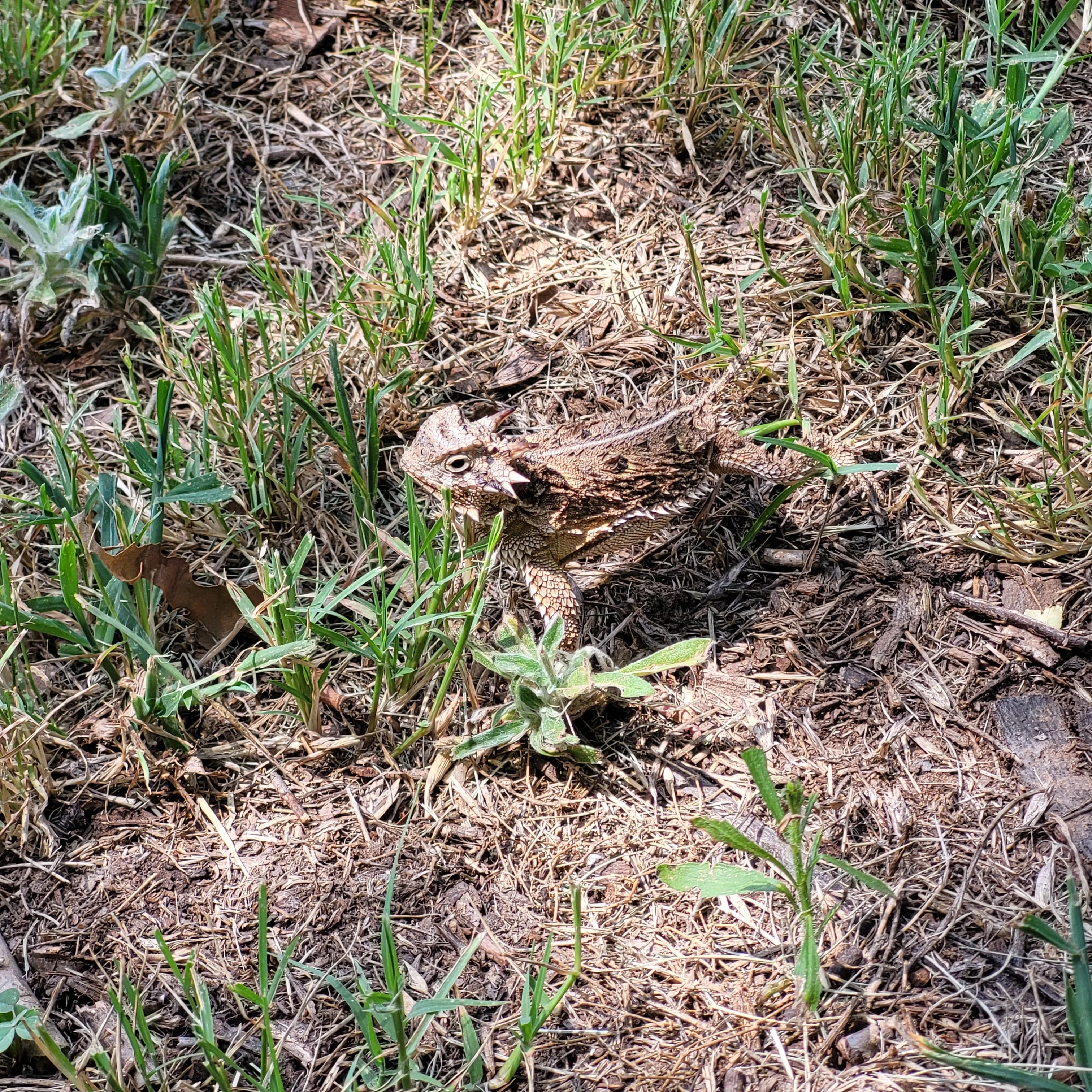 We have a colony of horny toads at my house. Pesticides have devastated their numbers in the past few decades; so when I first moved in (about twenty years ago) and found out we had a colony here I swore I would never spray my yard. We have a robust ant hill in the back, and the horny toad colony has thrived over the years. When she was little my daughter was terrified I would run one over when I mowed, so she would go around the yard and catch as many as she could before I would mow. Once I had a suitably large part of the yard mown, she would release them over to that spot. I still get a kick out of finding them in the yard and have way too many pictures of them saved on my computer. Yes I'm aware that their proper name is the Texas Horned Lizard, but I tend to prefer colloquial names.
