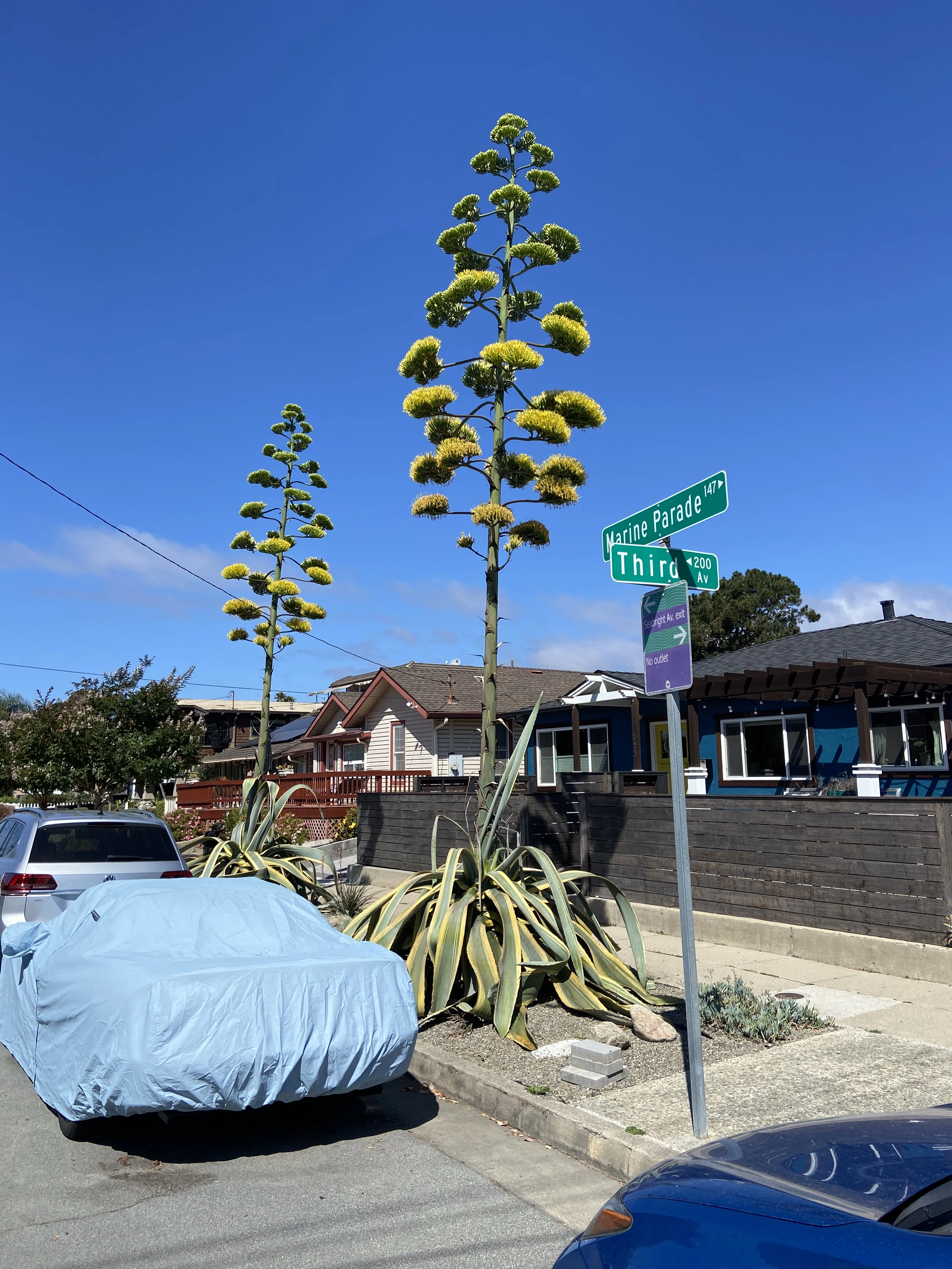 These agave’s have been at the end of my street for a couple decades now. Sadly they only flower once in their lifetime, pre-death. The plants themselves were about 2m tall before the blossom and droop of the leaves. The blossoms are towering above the power pole so 8-10m tall currently.
