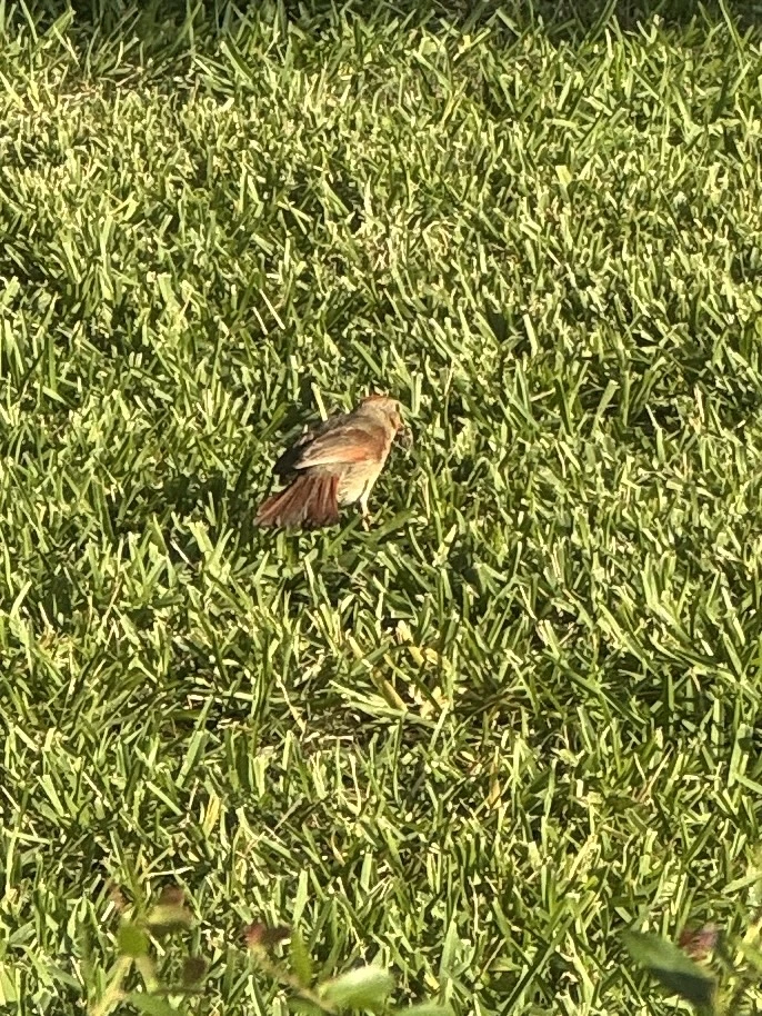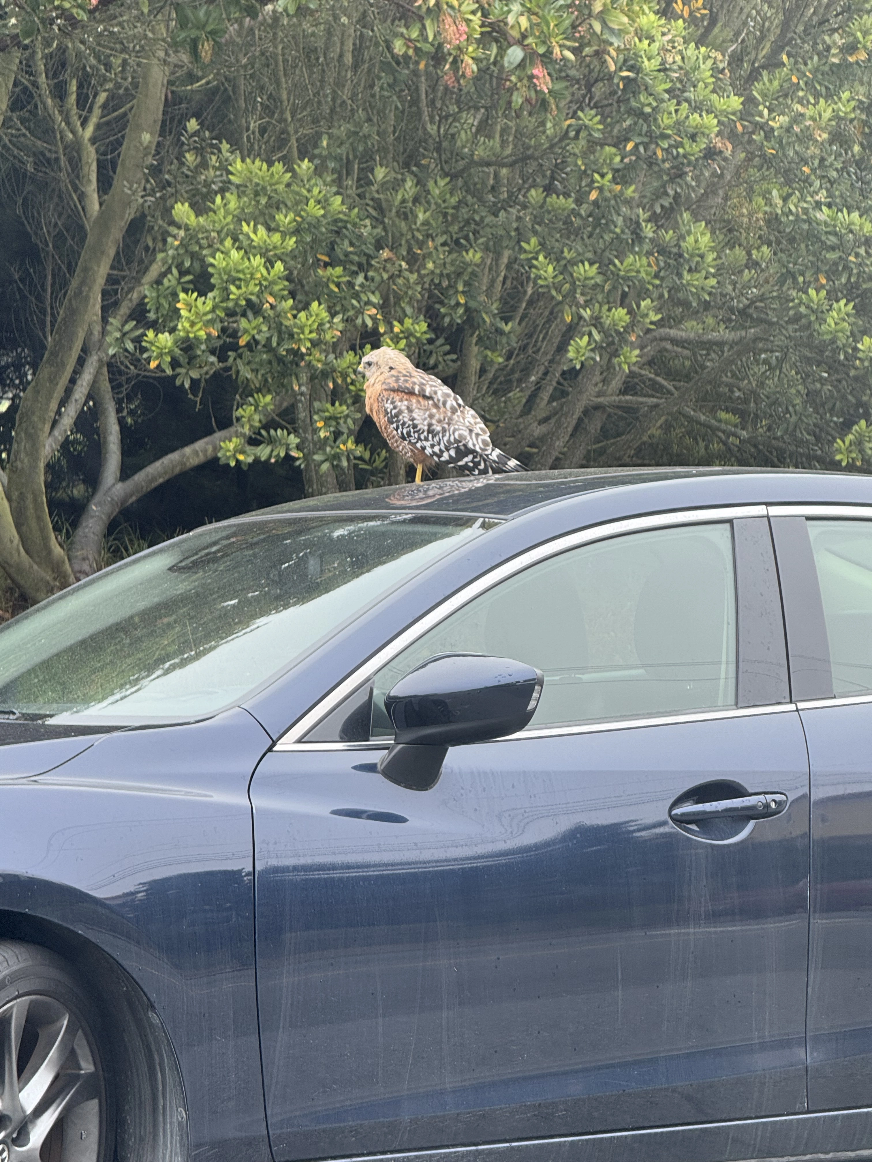 Seen on my drive home. I think it was tracking its dinner in a thicket of trees separating the street from a golf course.