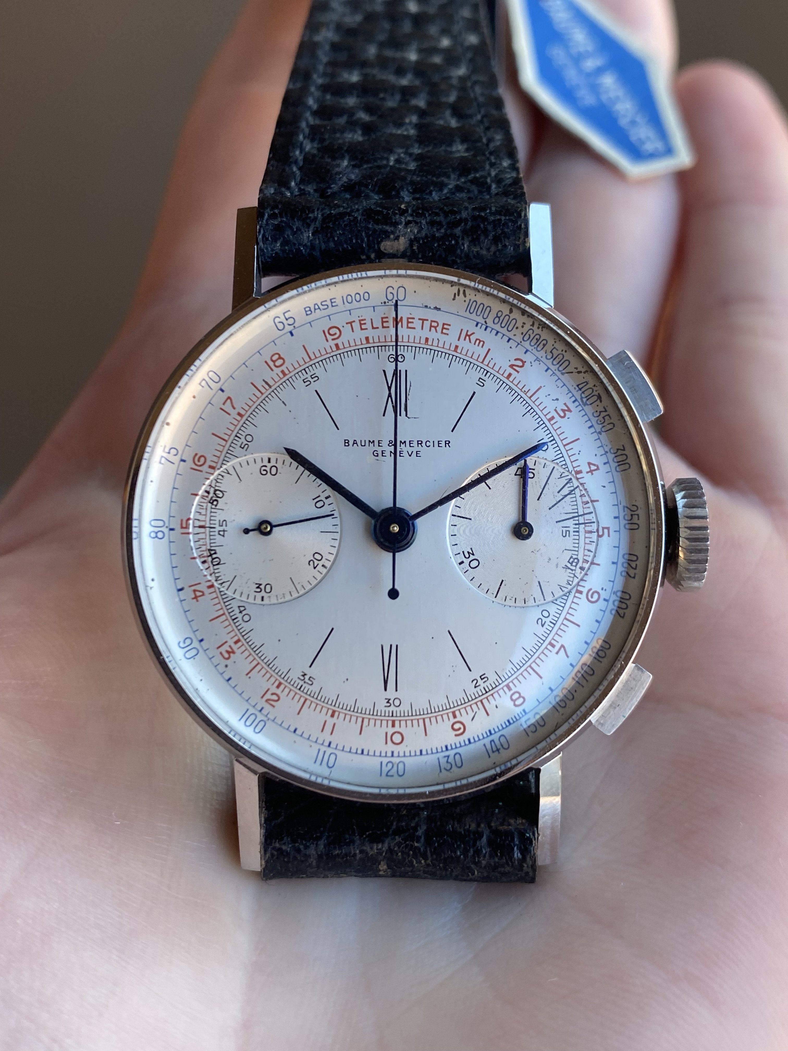 ·Up for sale is a nearly NOS 1940s Baume & Mercier chronograph. It doesn’t get much better than this - a nice sized 36mm steel case, powerhouse Valjoux 22 movement, fully original and untouched case and dial (including remnant “purple snot” from new on the caseback), and original strap and hang tag. See below for full info, and don’t hesitate to message me with questions.