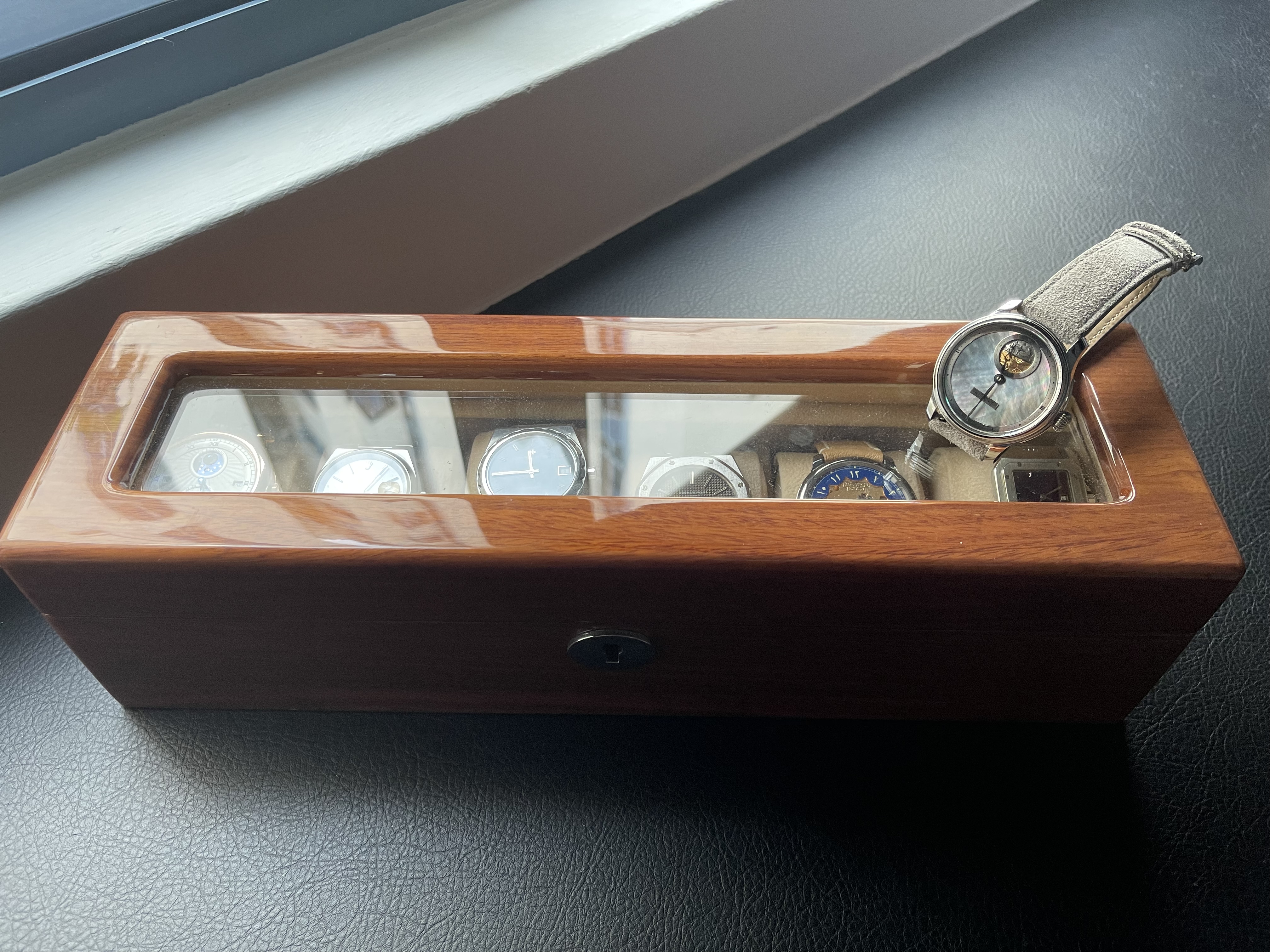 My original thoughts were to purchase a watch box that can keep watches both flat and with strap rounded (like in the photo) so that spare straps can be placed below, along with a small compartment for crowns, bezels, etc that were replaced, however I cannot find the perfect watch box