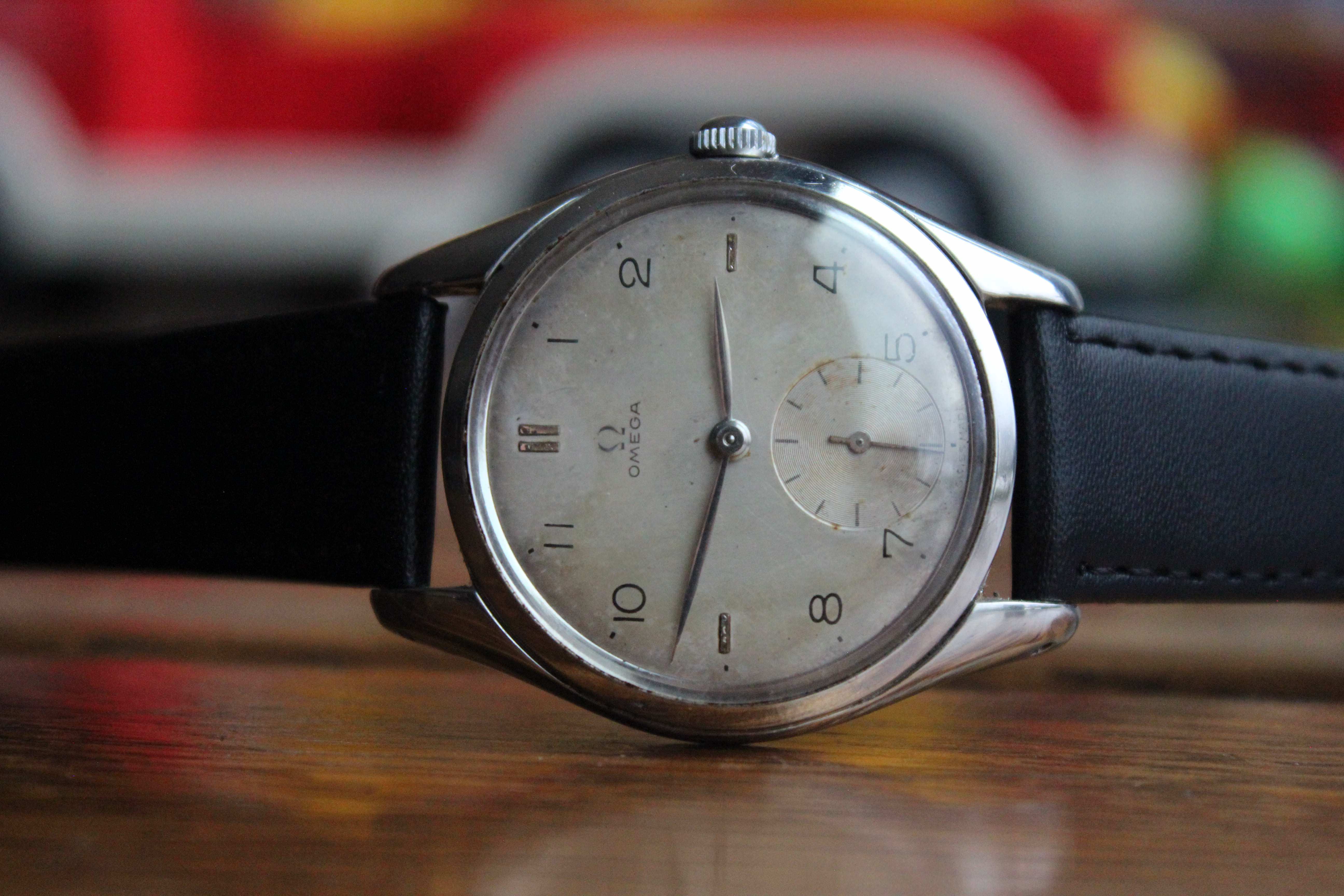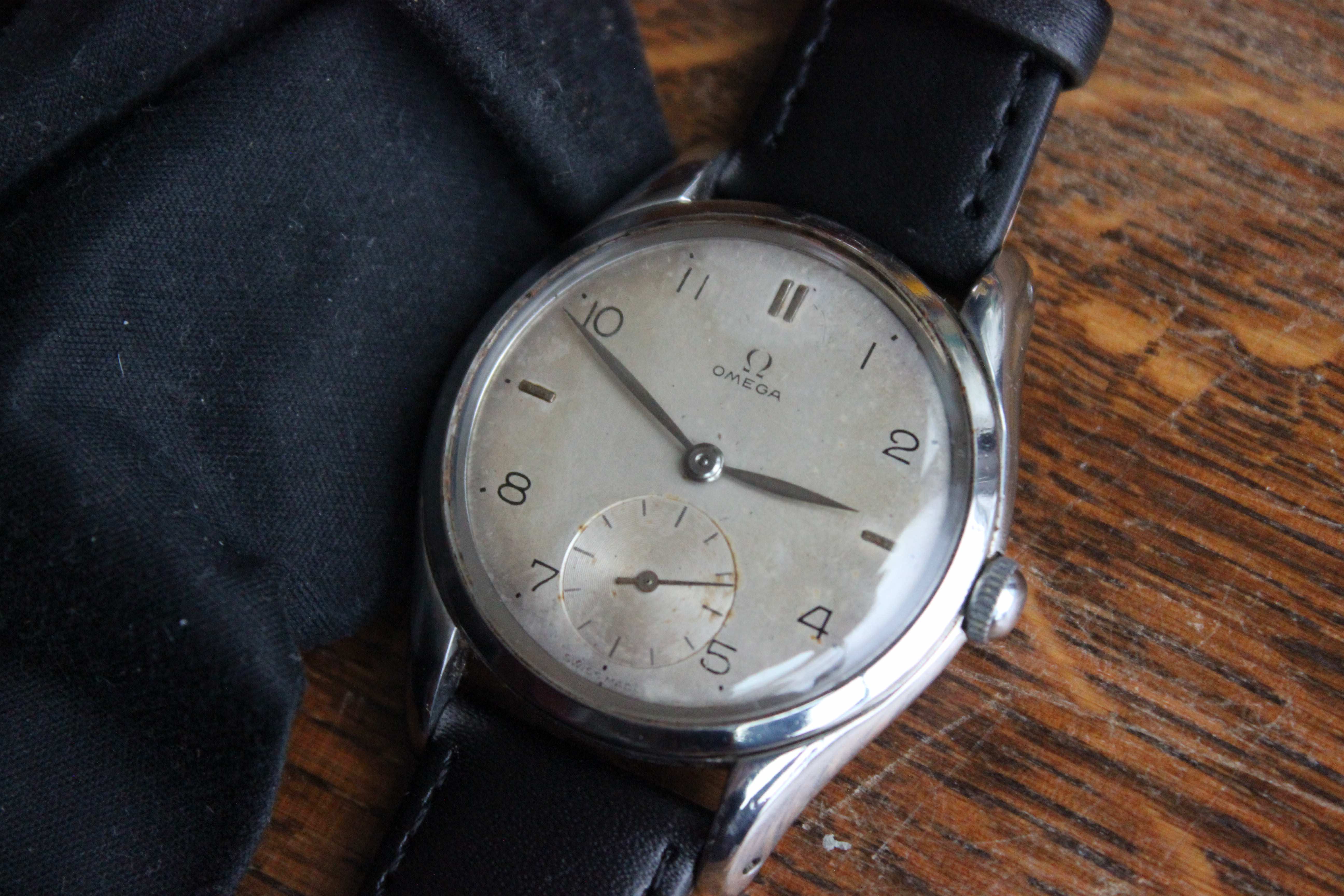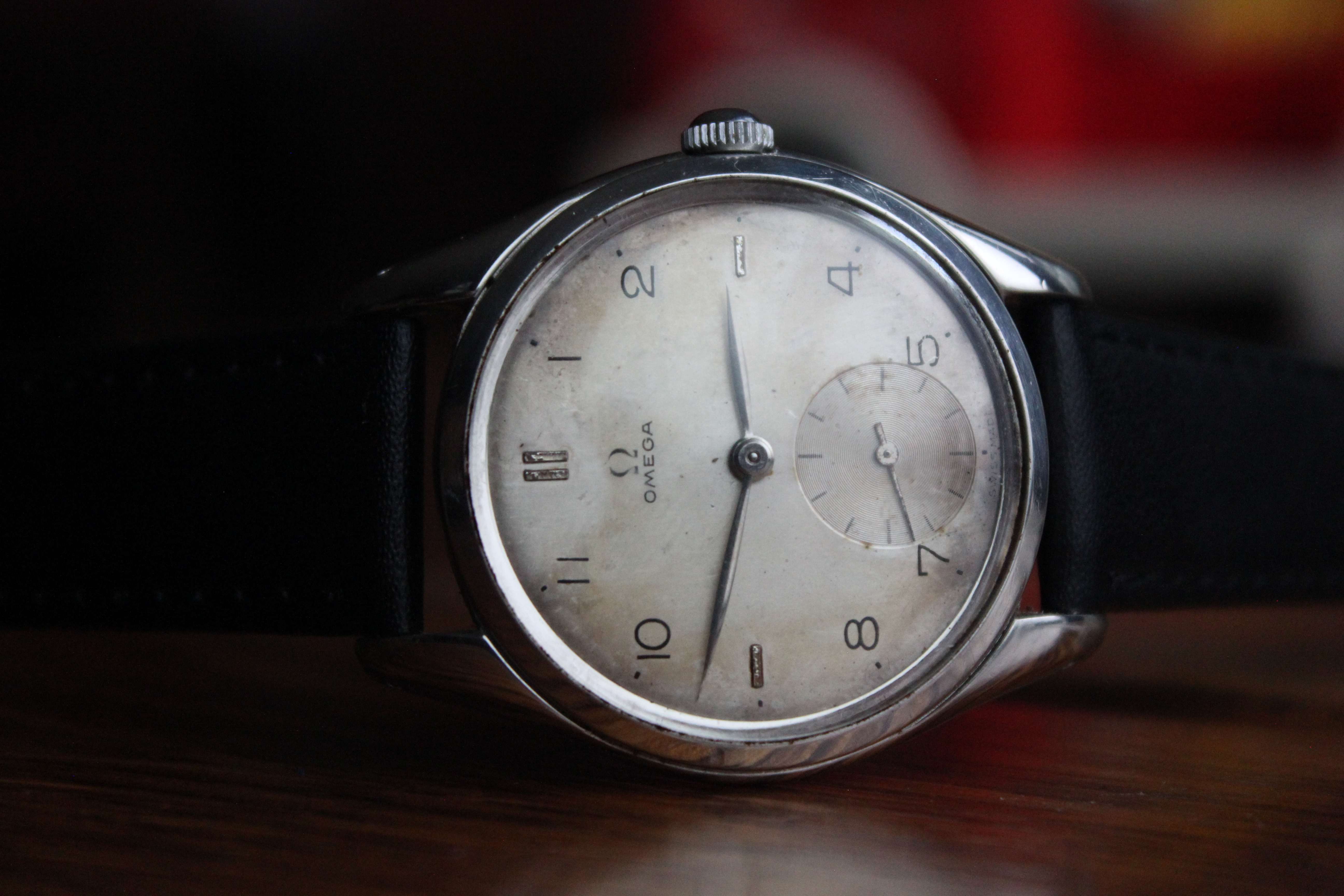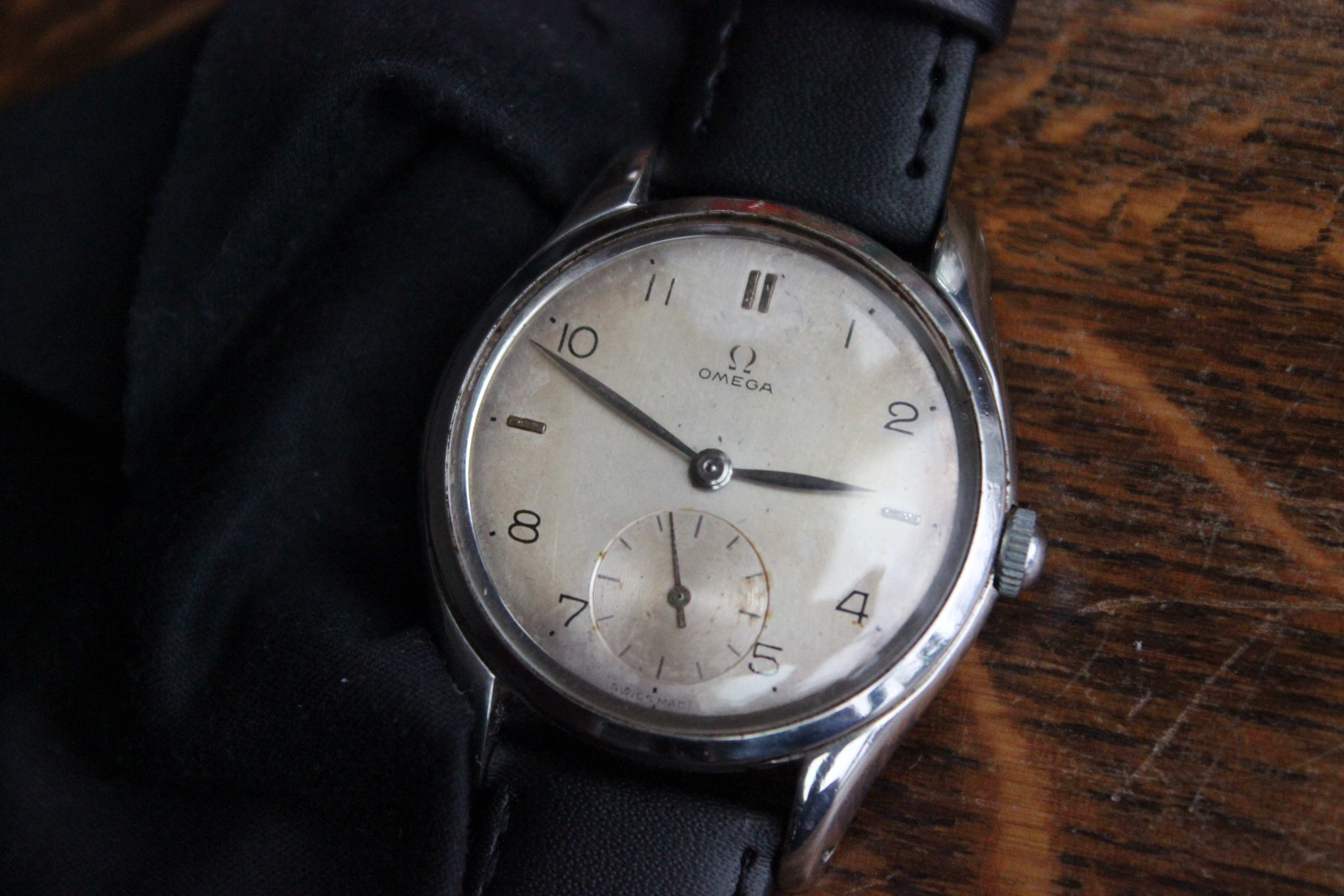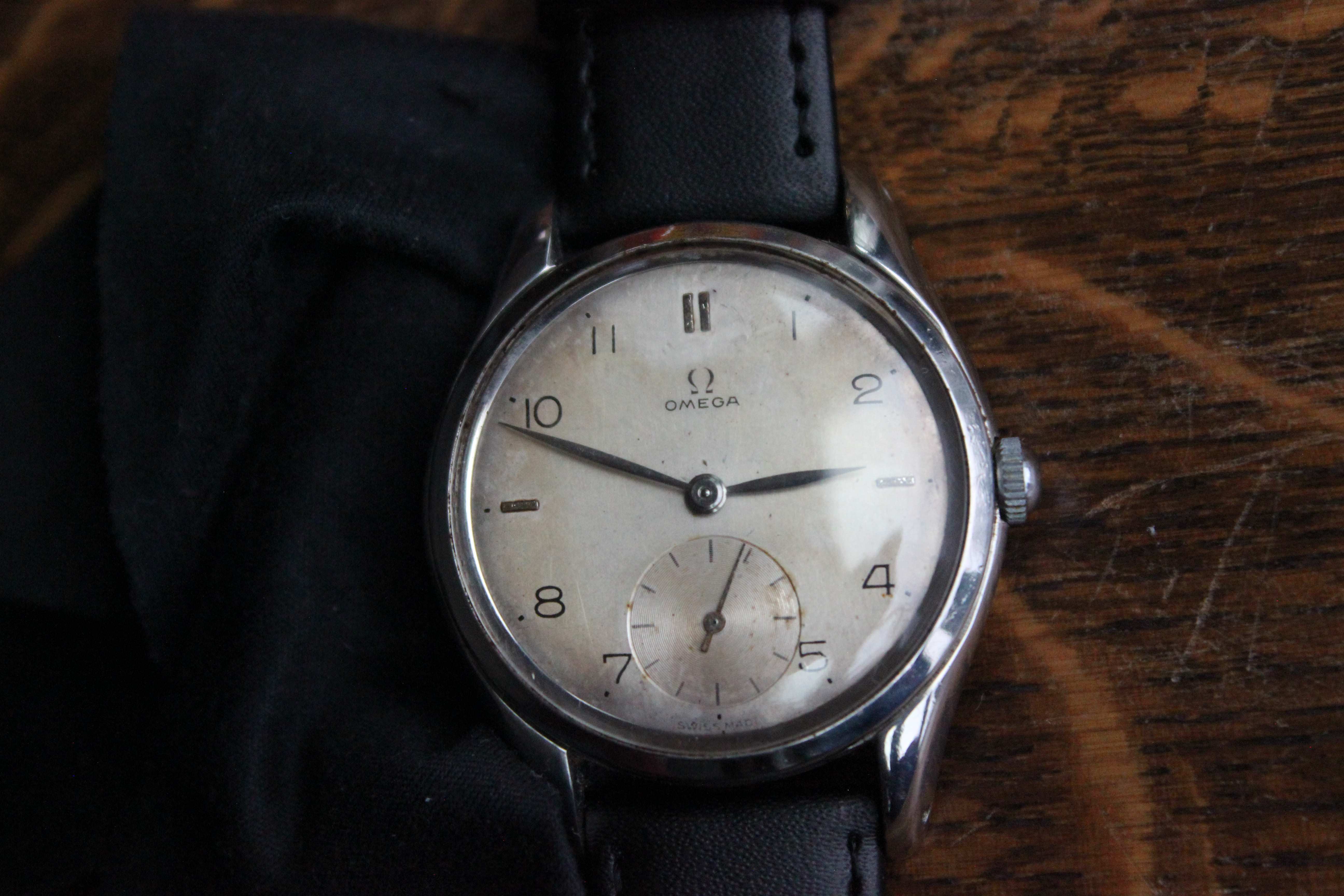 Omega subseconds 36,3mm - leaf hands - 1948 - The original silver dial is in good condition. It’s patinated throughout, with beautiful leaf hands to complete the look. The steel case is in excellent condition. The crown is unsigned. The watch is a ref 2503-6, powered by a manual wind cal 265 from 1948. Service history unknown, but the watch works perfectly and keeps good time. Measures 36,3mm diameter without crown, and 44,5 mm from lug to lug.