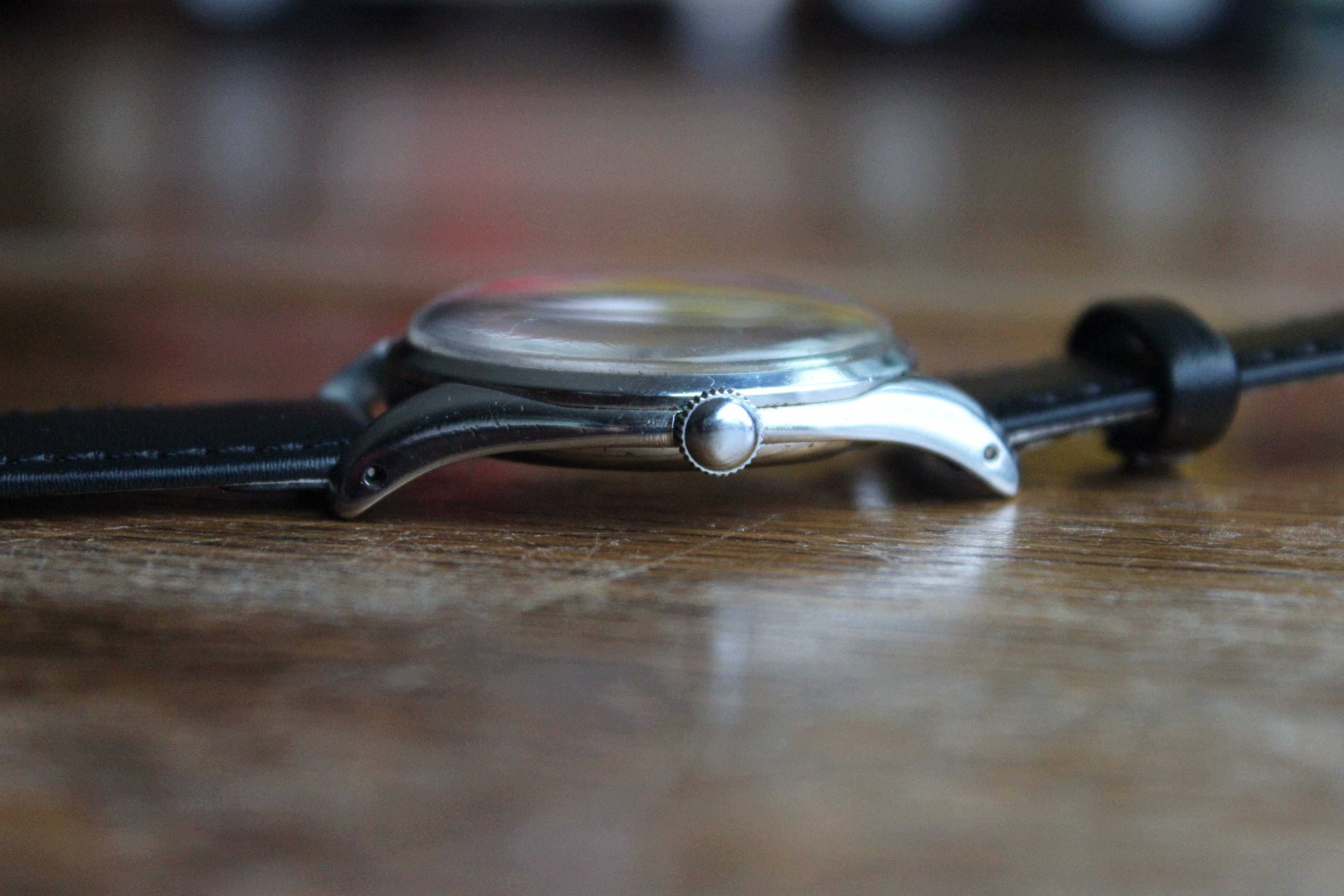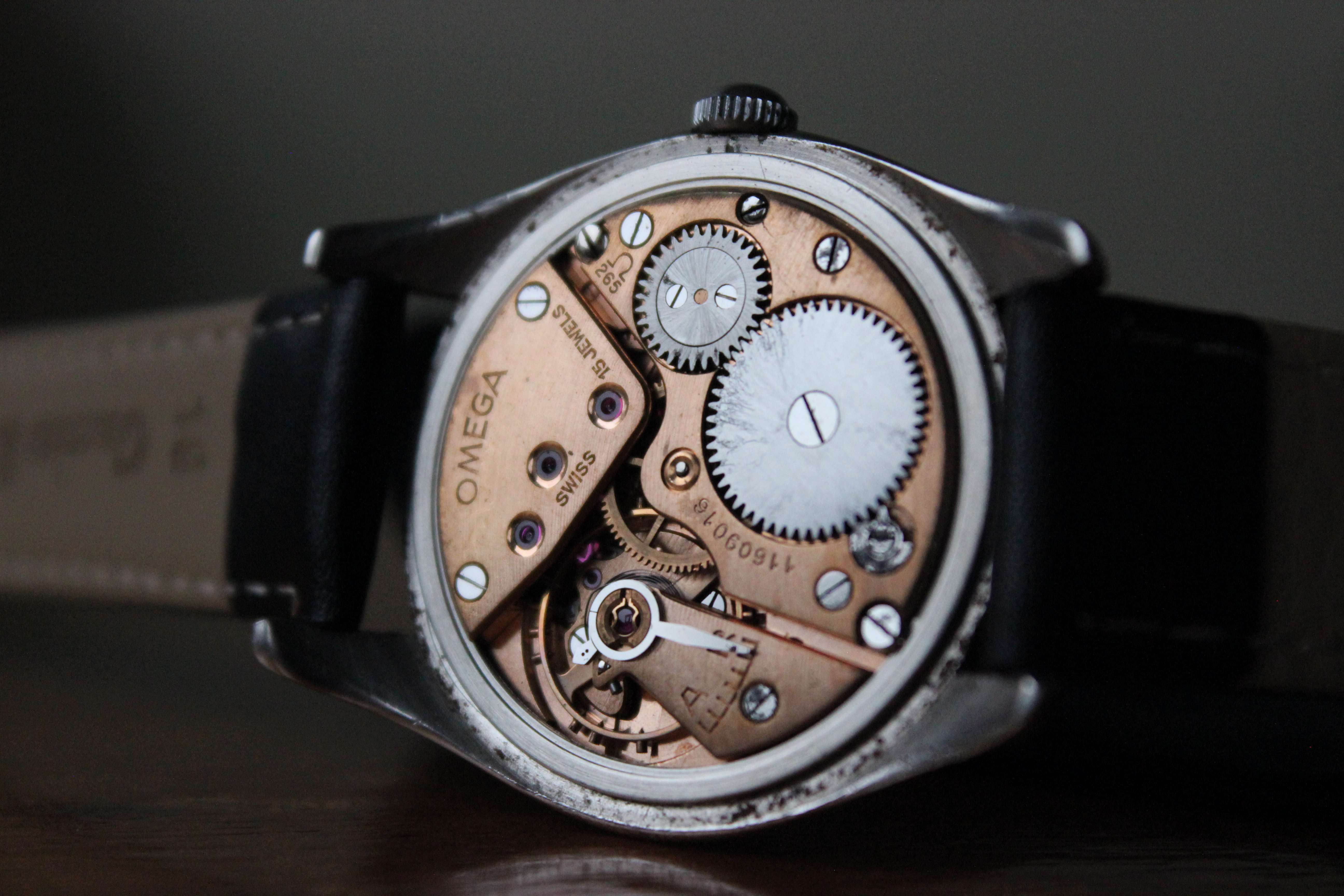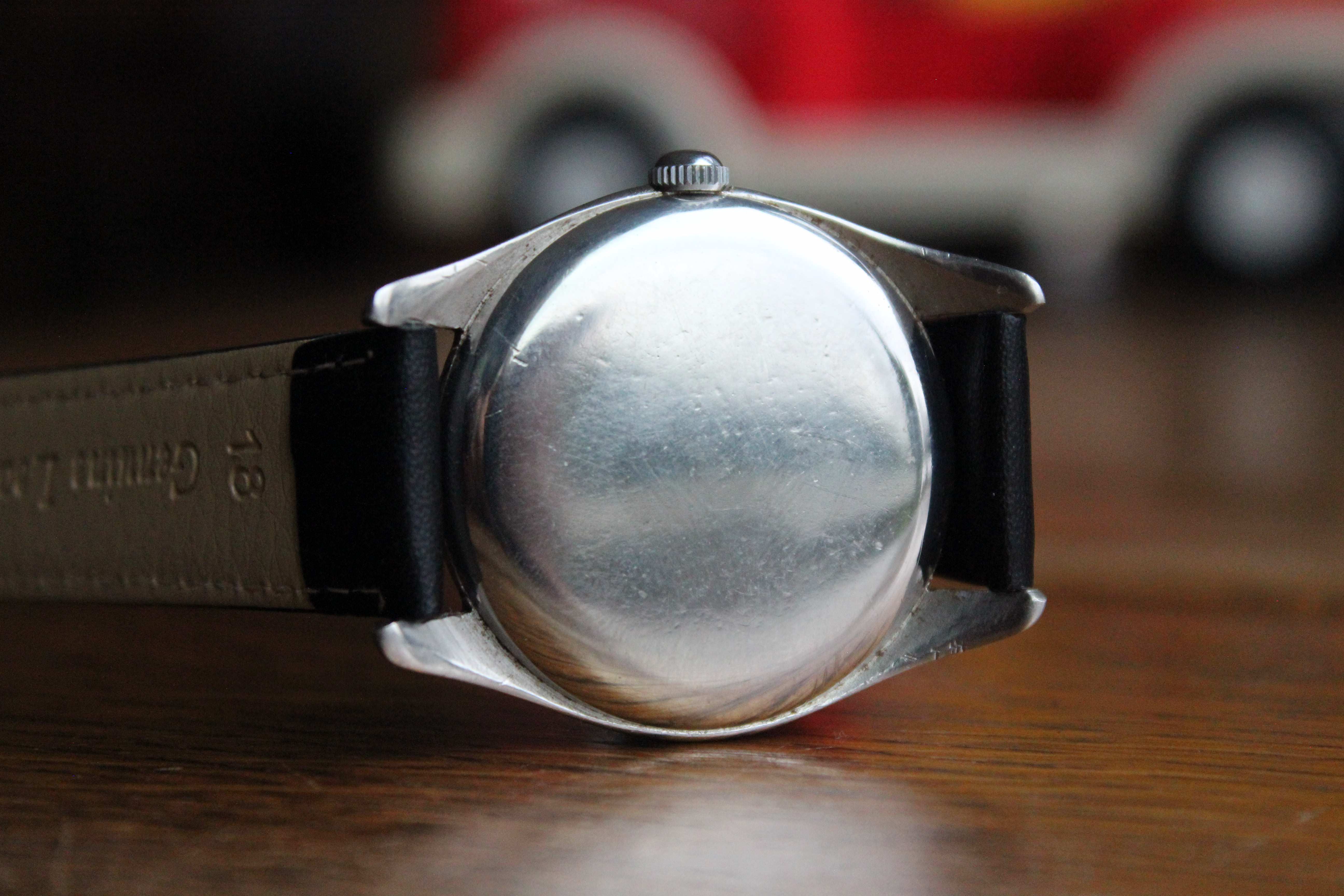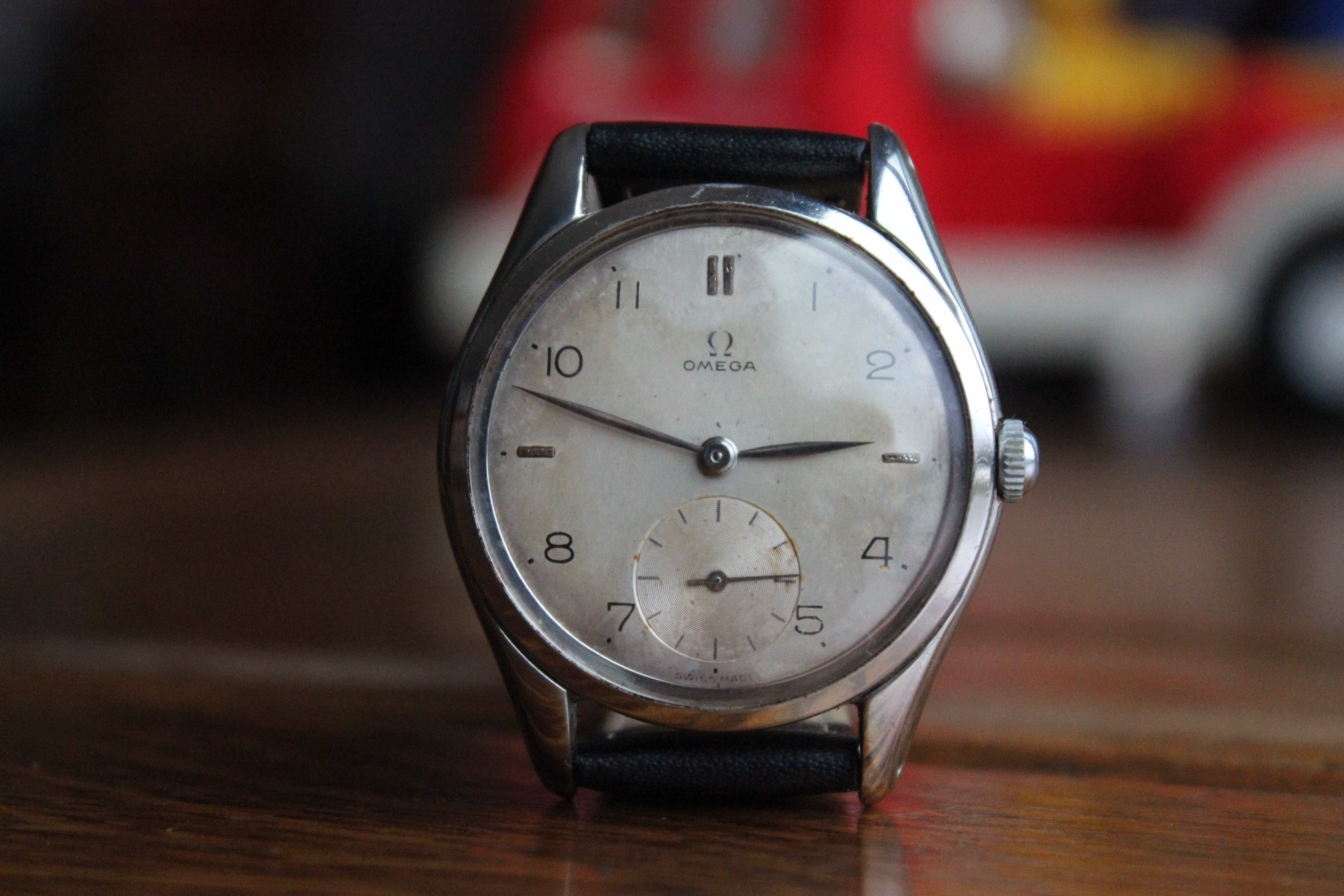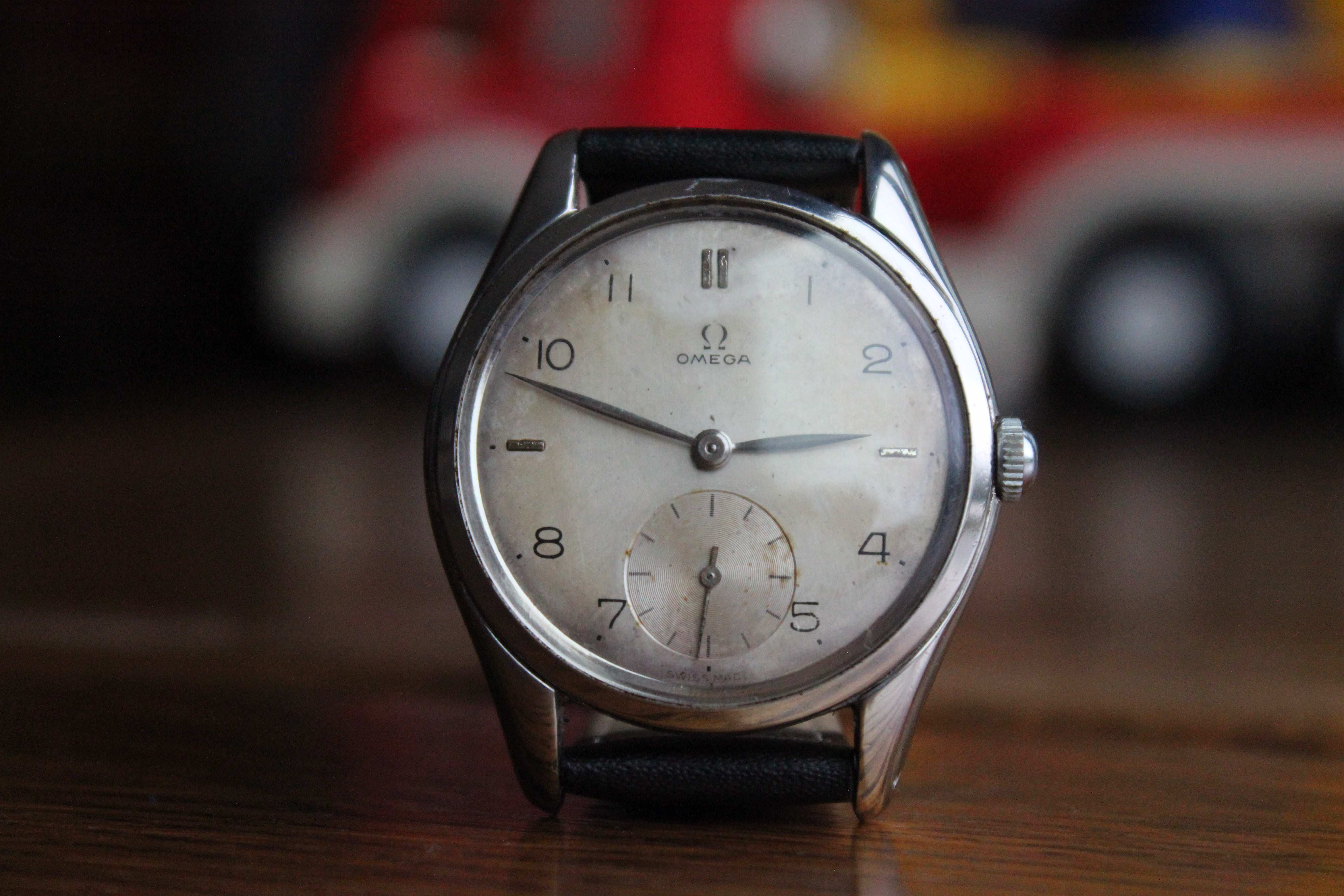 Omega subseconds 36,3mm - leaf hands - 1948 - The original silver dial is in good condition. It’s patinated throughout, with beautiful leaf hands to complete the look. The steel case is in excellent condition. The crown is unsigned. The watch is a ref 2503-6, powered by a manual wind cal 265 from 1948. Service history unknown, but the watch works perfectly and keeps good time. Measures 36,3mm diameter without crown, and 44,5 mm from lug to lug.