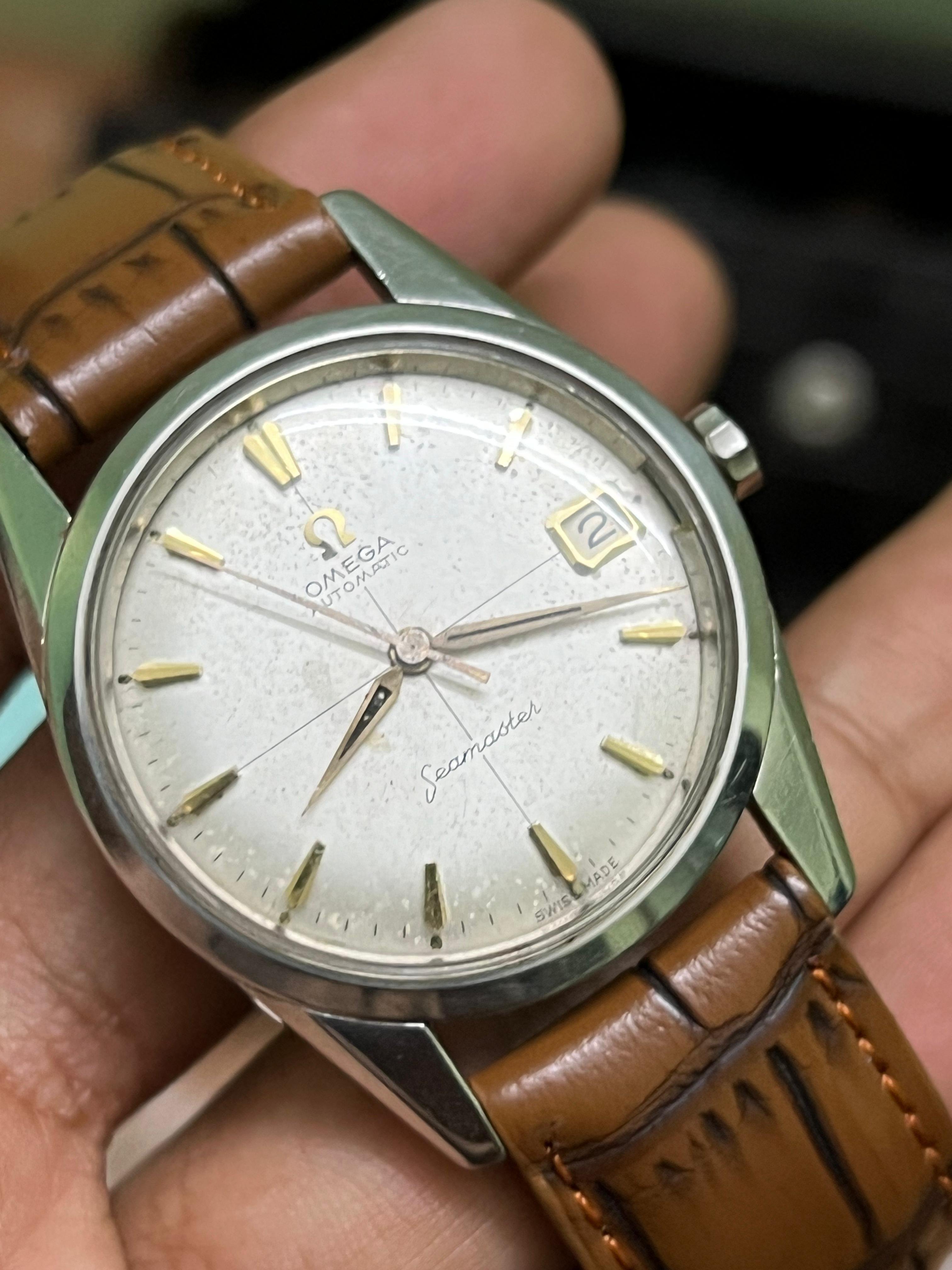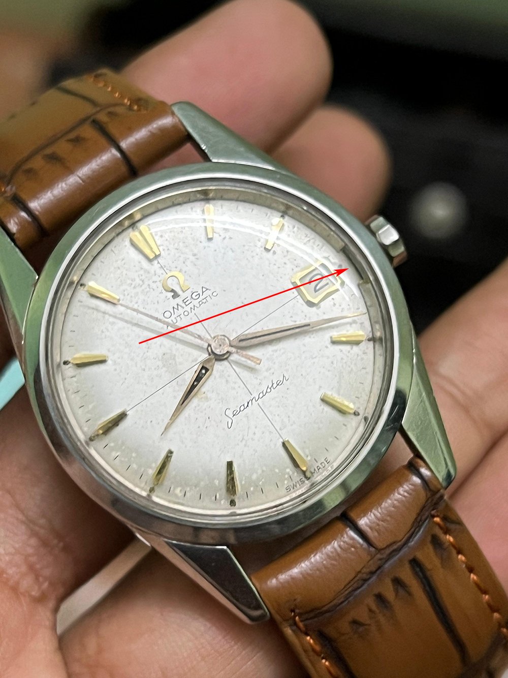 Dial is aged, but we've seen a lot worse, at least it hasn't been refinished. More concerning is the huge gap in the tension ring, not supposed to be like that. Case is very polished as well. This one's had a hard life.