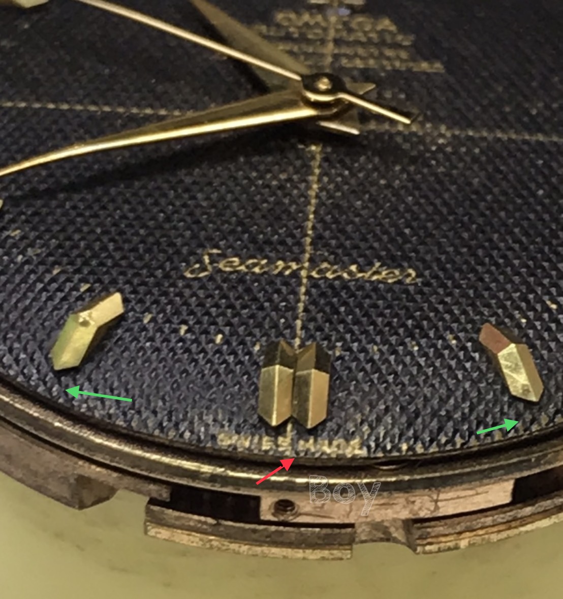 I compared my watch to my friend’s omega ref.2577-22 with original black chronometer in the usual case size, please see the smaller gap under the word “Swiss Made” (red arrow) and smaller gap next to the markers (green arrow)