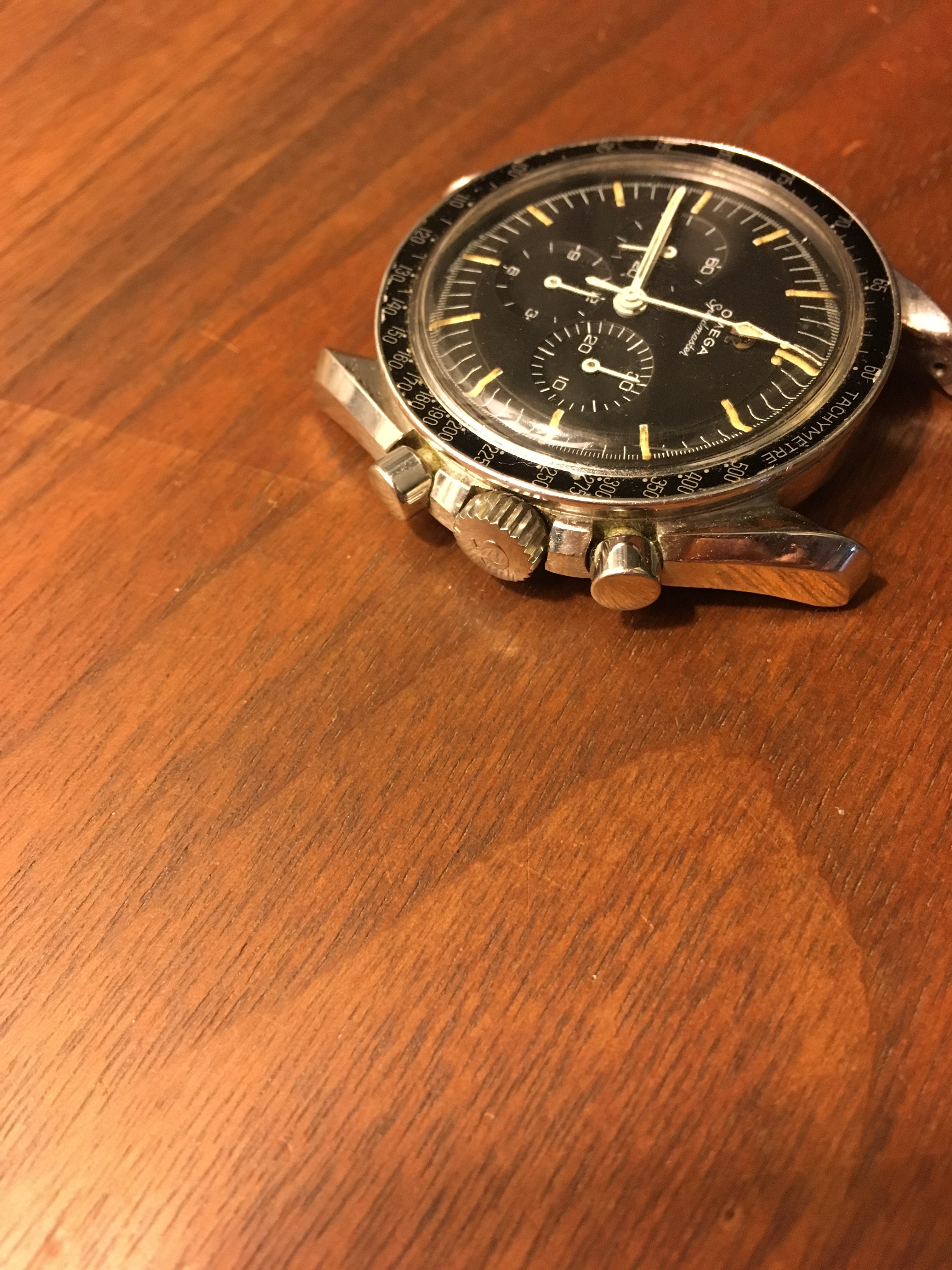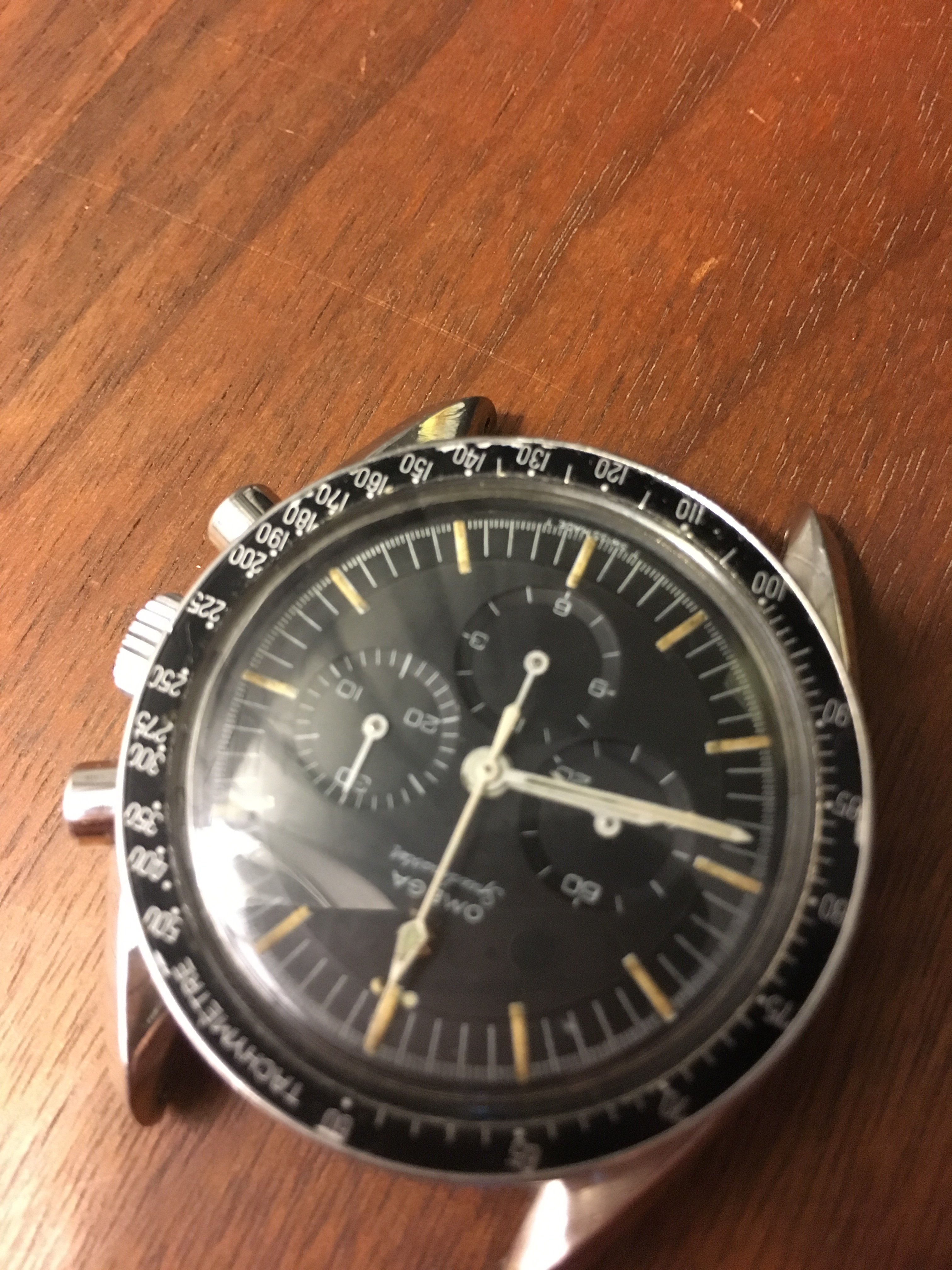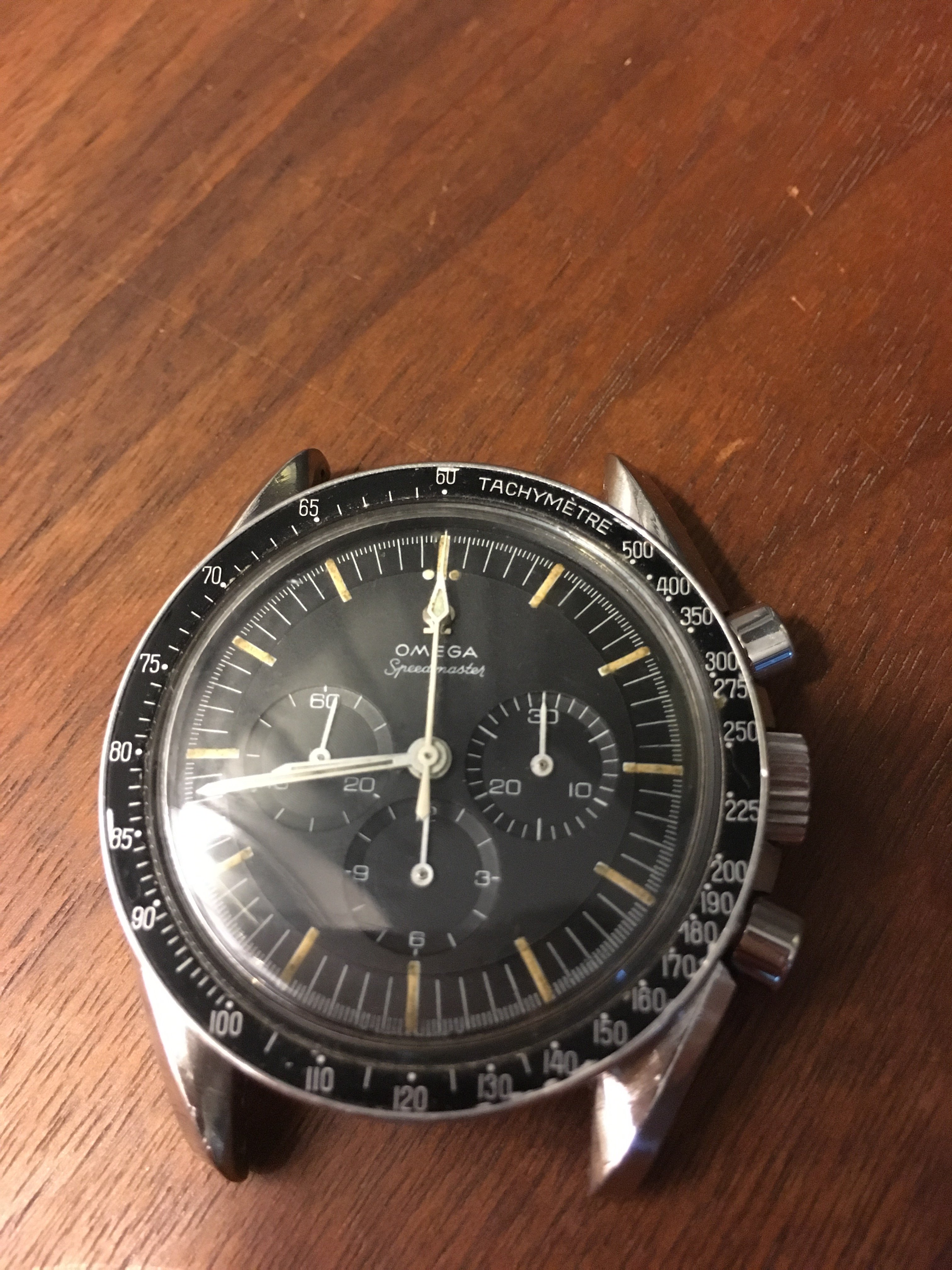 I recently picked up a very nice condition Speedmaster (i've got a mark ii racing dial from the late 60s, a gold filled seamaster, and a modern SMP -- this is my first original-style Speedie). I'm going to take it to my watchmaker for a service, but I was hoping to understand what model it is. I was pretty sure it's a 105.012, but the speedmaster101 website says pretty unequivocally that this model always has "Professional" on the dial, which this one doesn't. I can't find a watch ref that has: