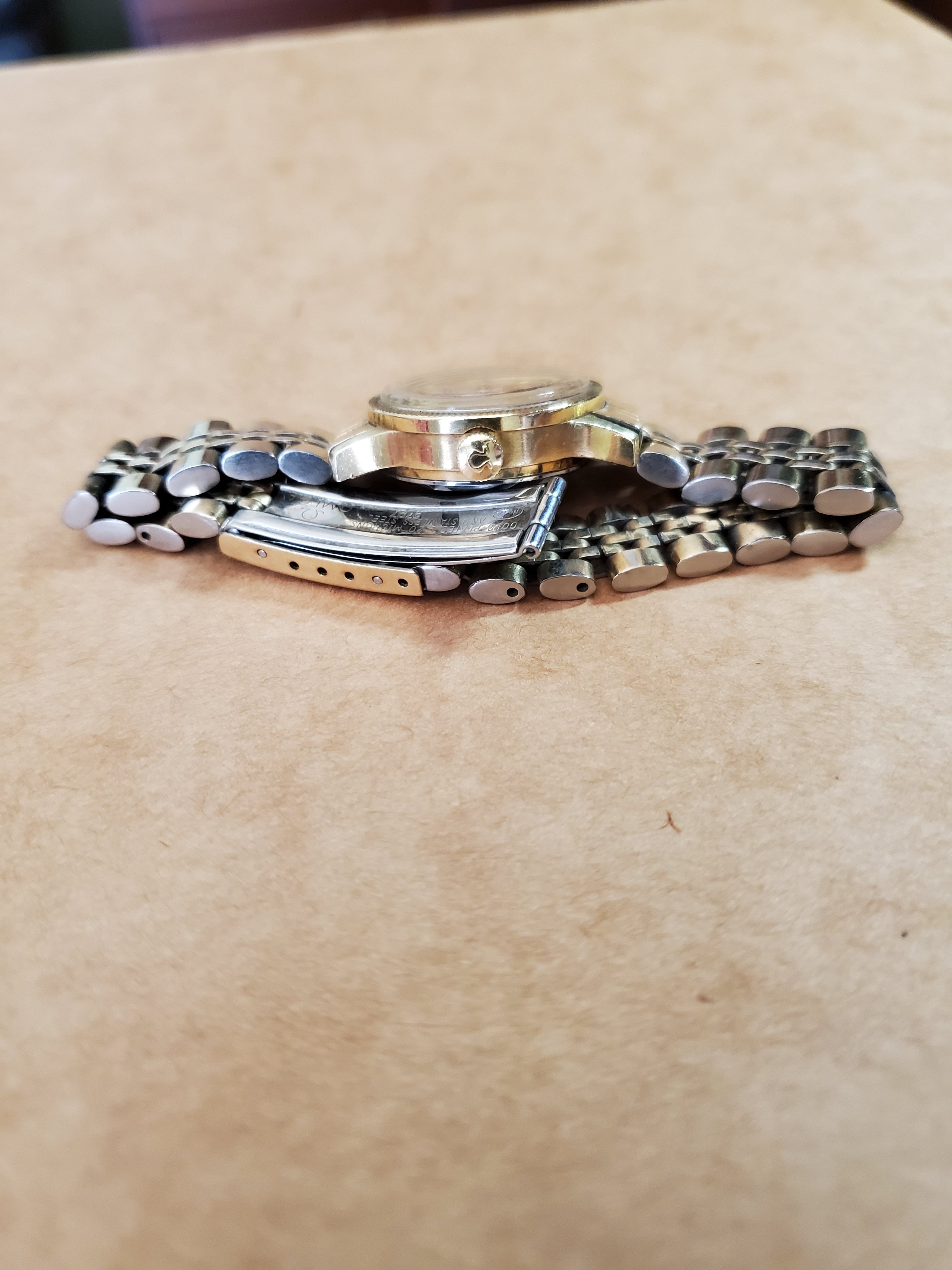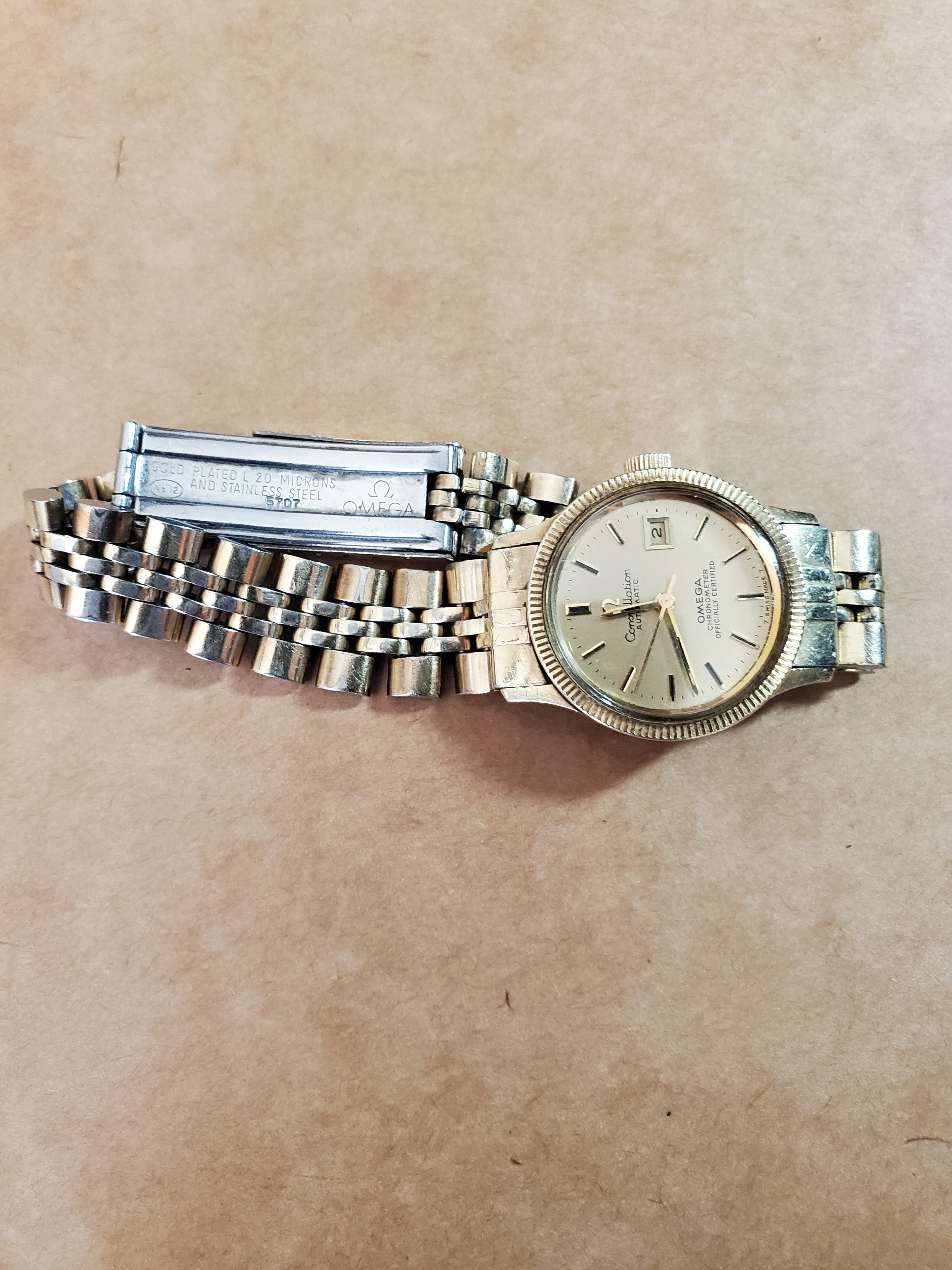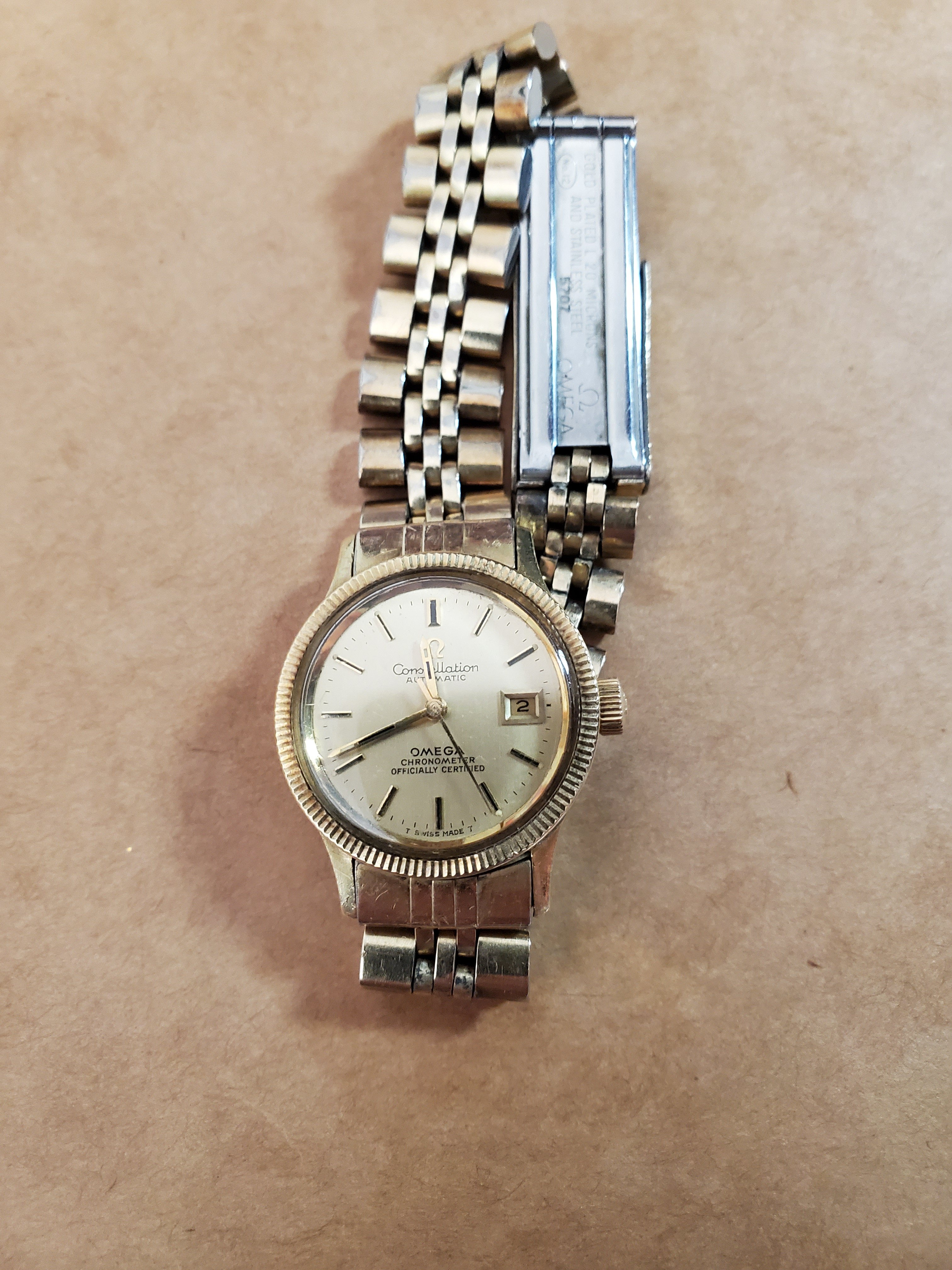 ·I have an Omega Constellation Automatic chronometer certified ladies watch with gold-plated metal band. All original. It has a coin edge bezel. It shows date only (no magnified bubble), and date is hard to set. Crown has only one pull out position and to set date, you have to run hour hand back then forward til you get to the right date.