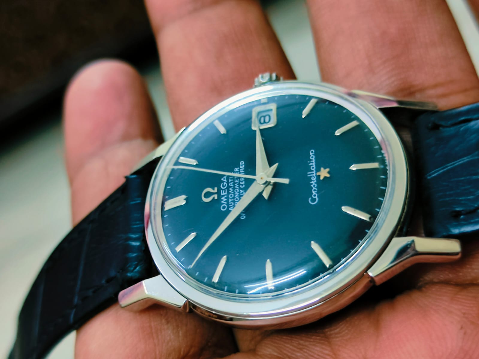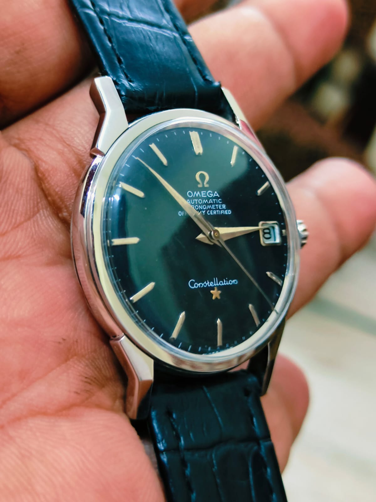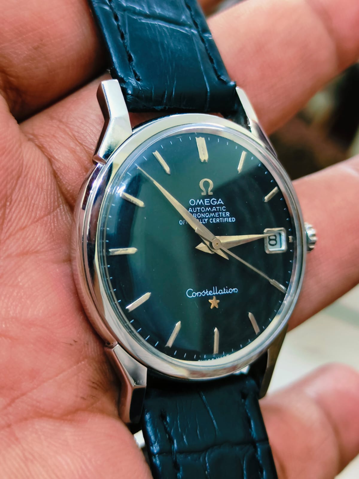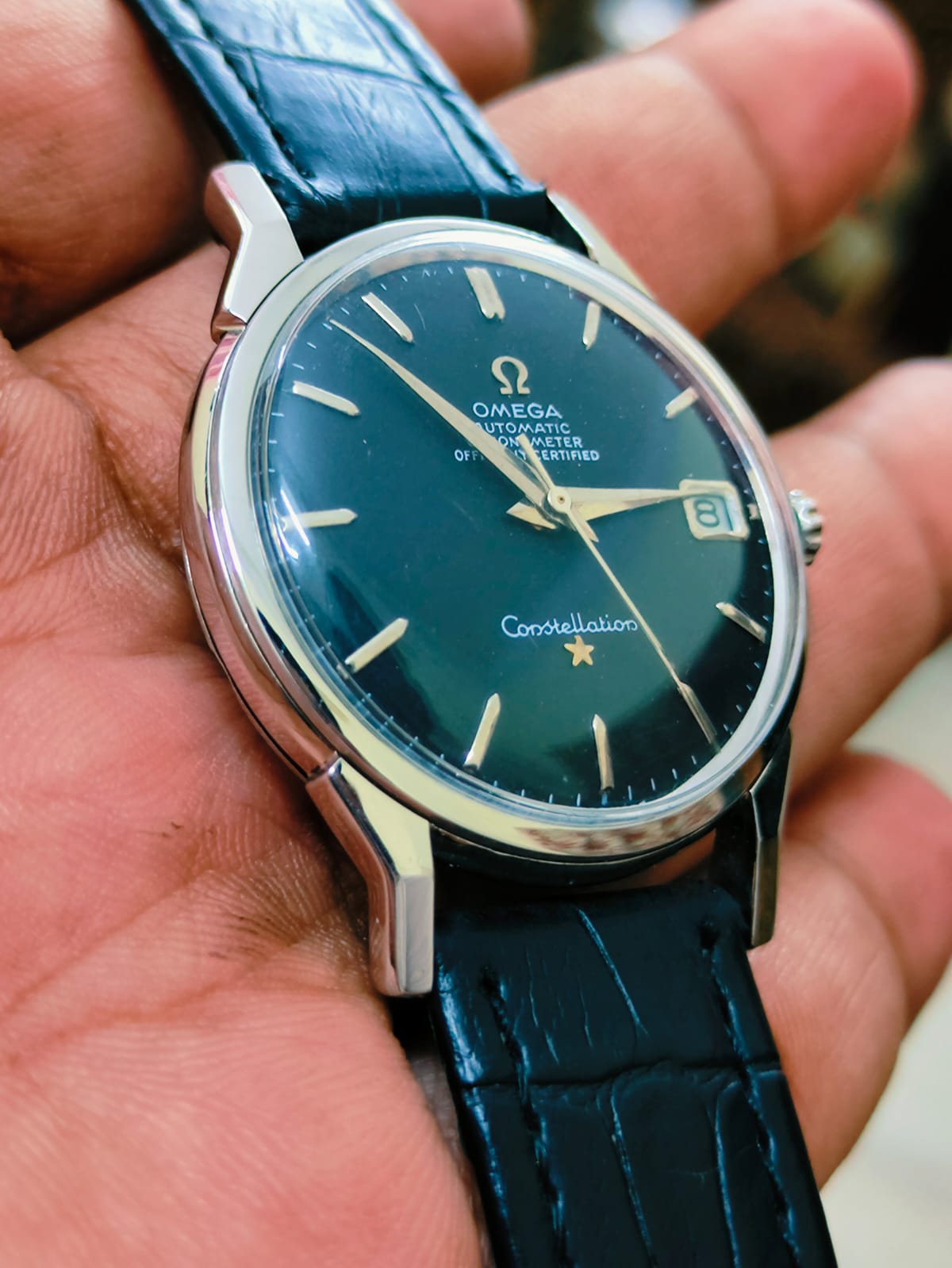 A dealer is offering me the below constellation at a fairly decent price. I have never seen another one like this in Black dial. Any help in authenticating this will be greatly appreciated. I also have a few doubts about the crown on this one. Seeking help from the experts
