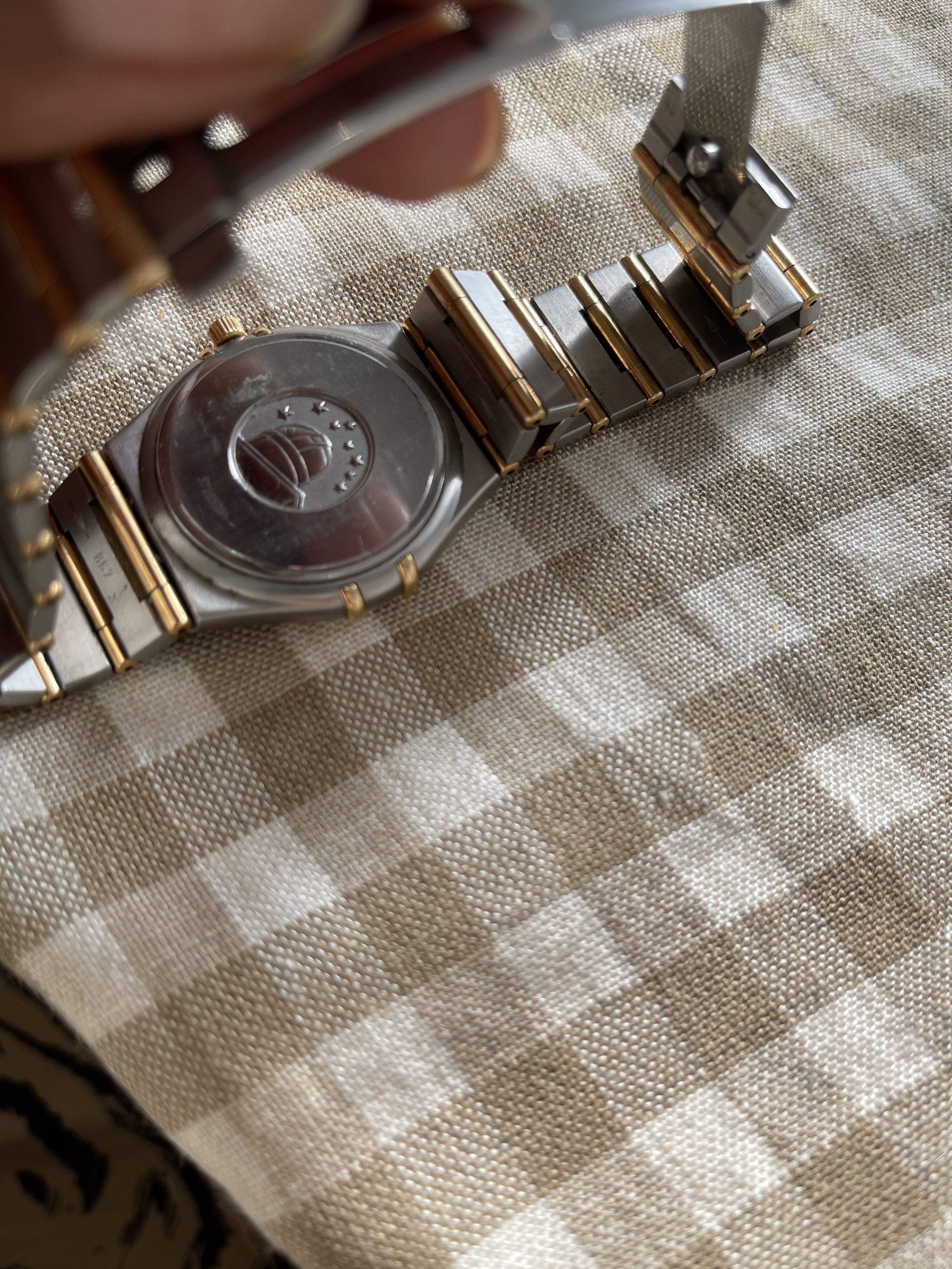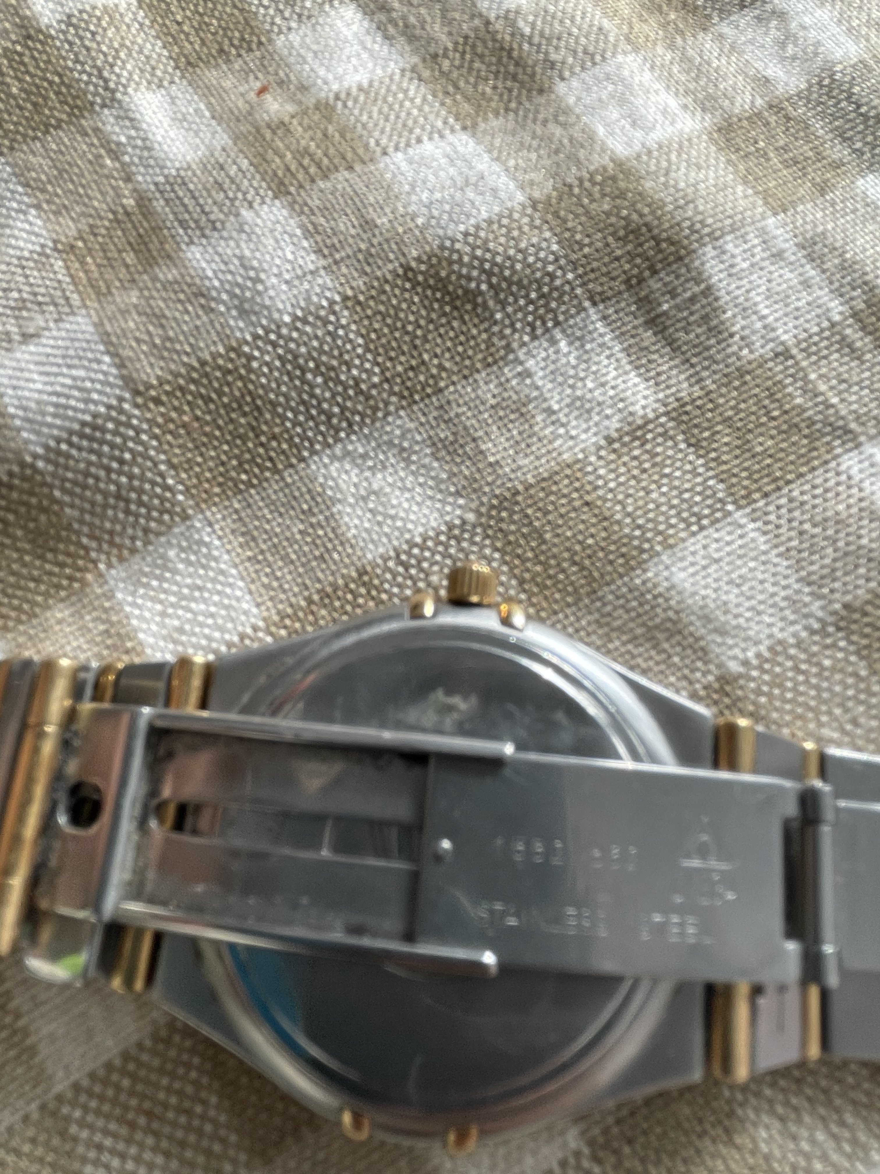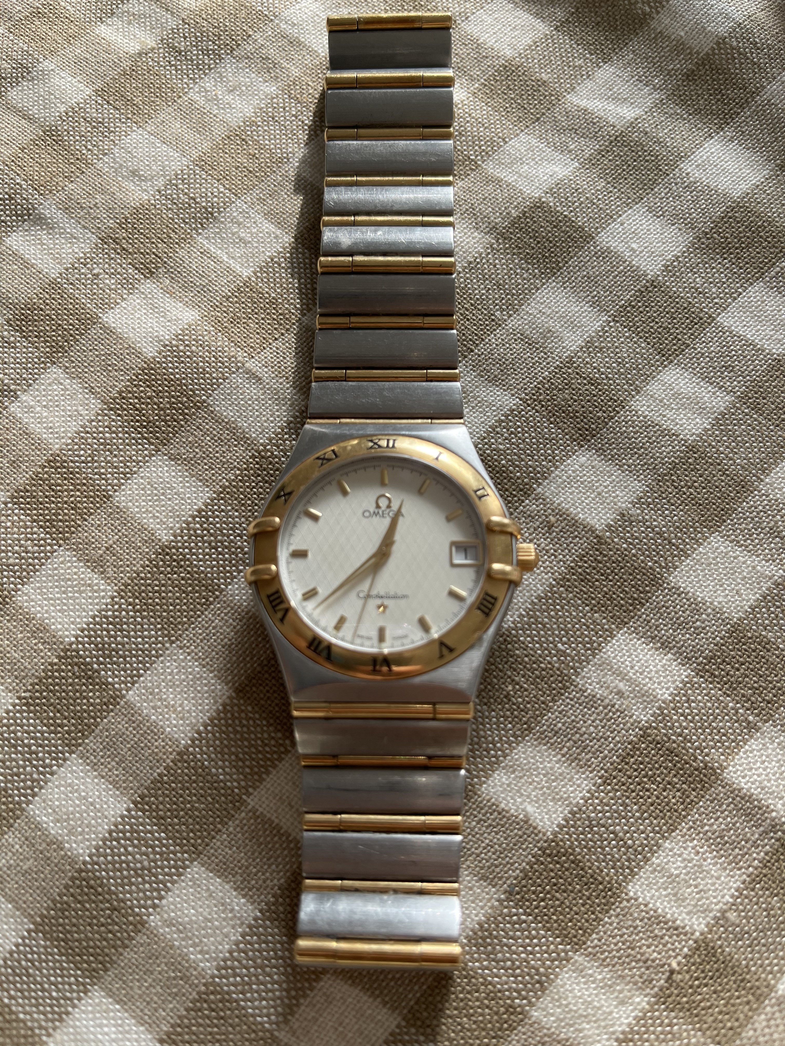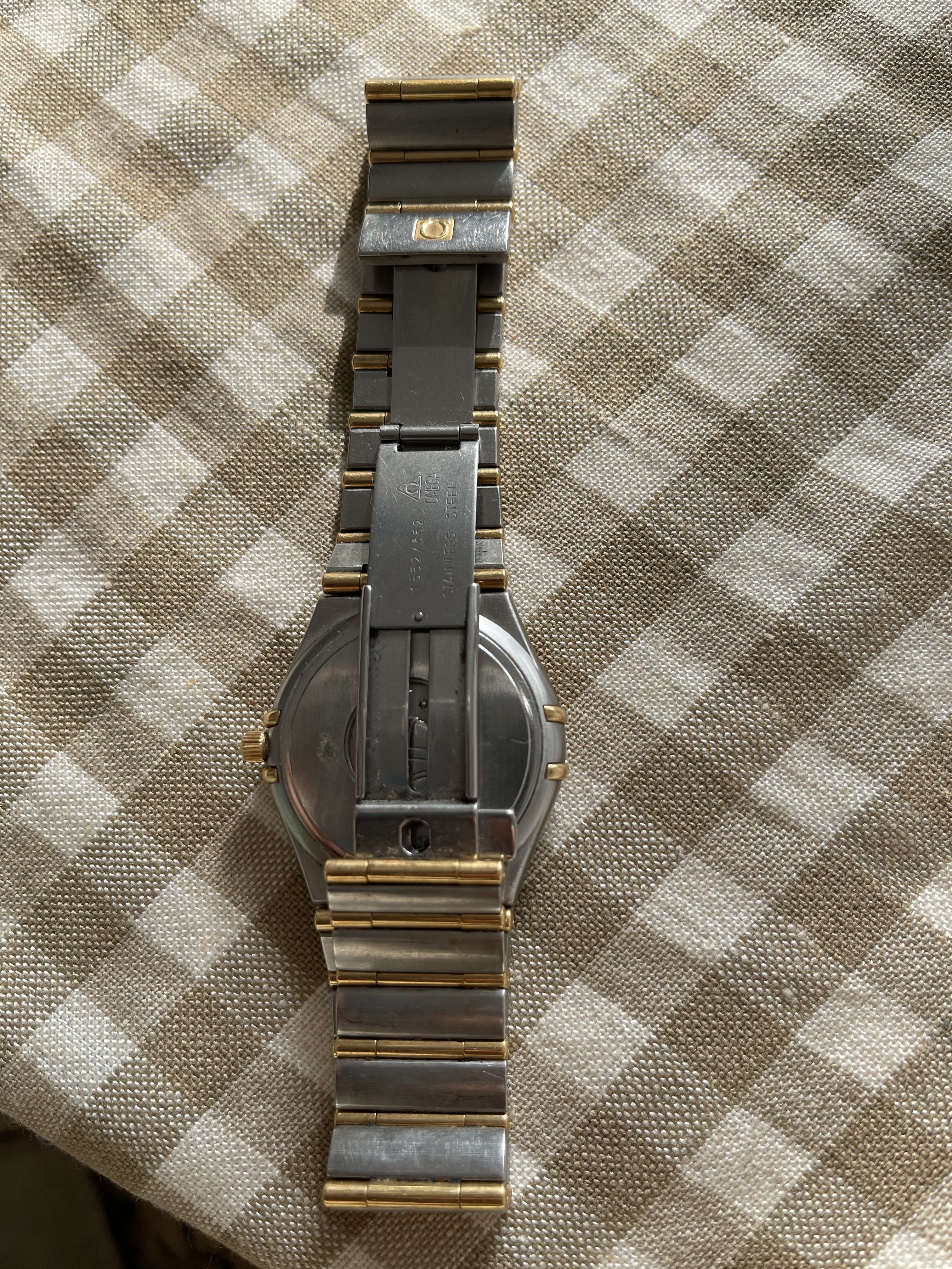 This looks like an Omega Constellation 'Manhattan.'. To get specifics on the case model number and year of production, we need to see inside the case back. If you're not comfortable opening it, a local watchmaker should be able to open it for photos.