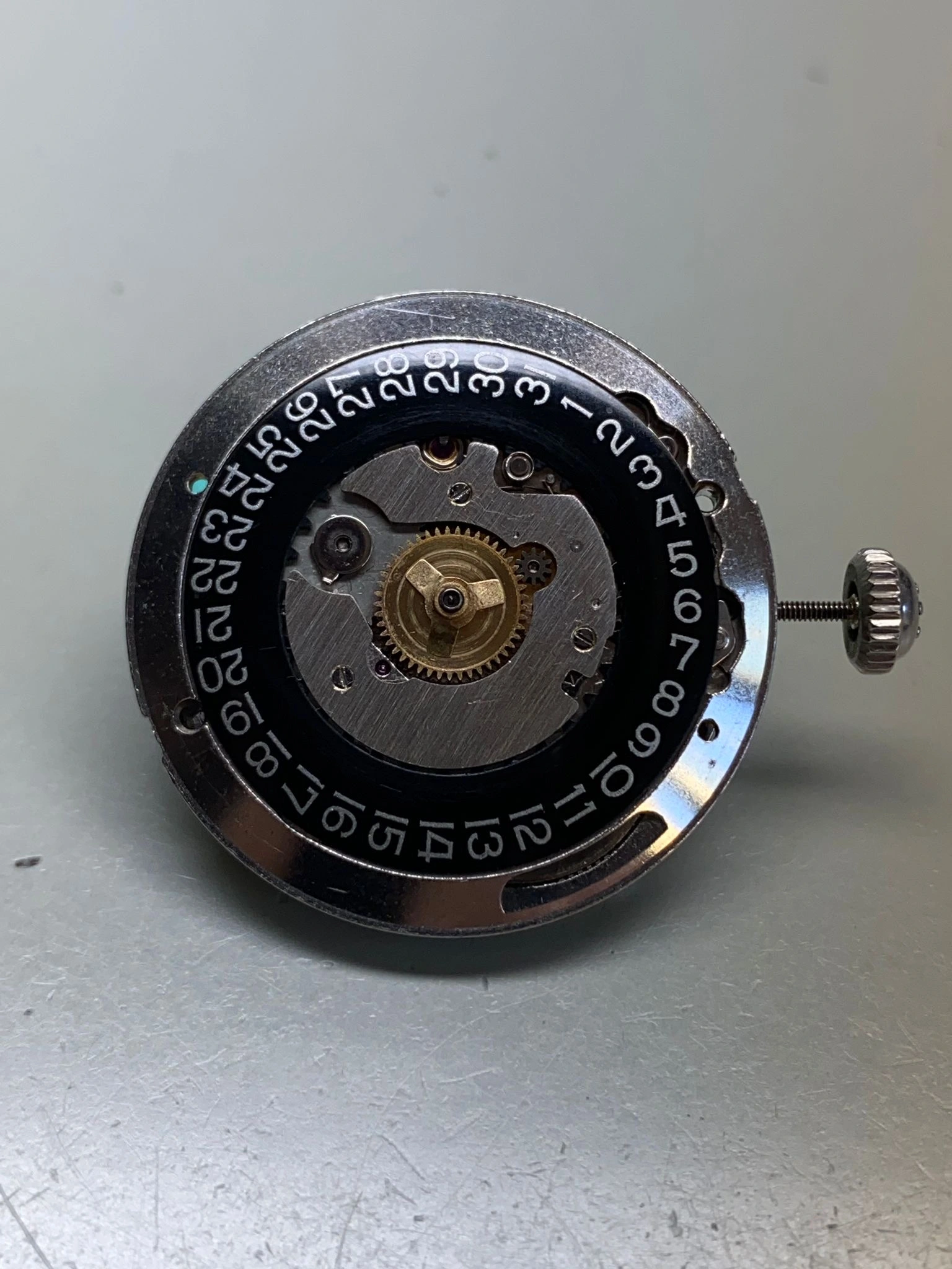 I believe an unmarked crown would be the correct one for this watch. That dial is one I've not seen before.