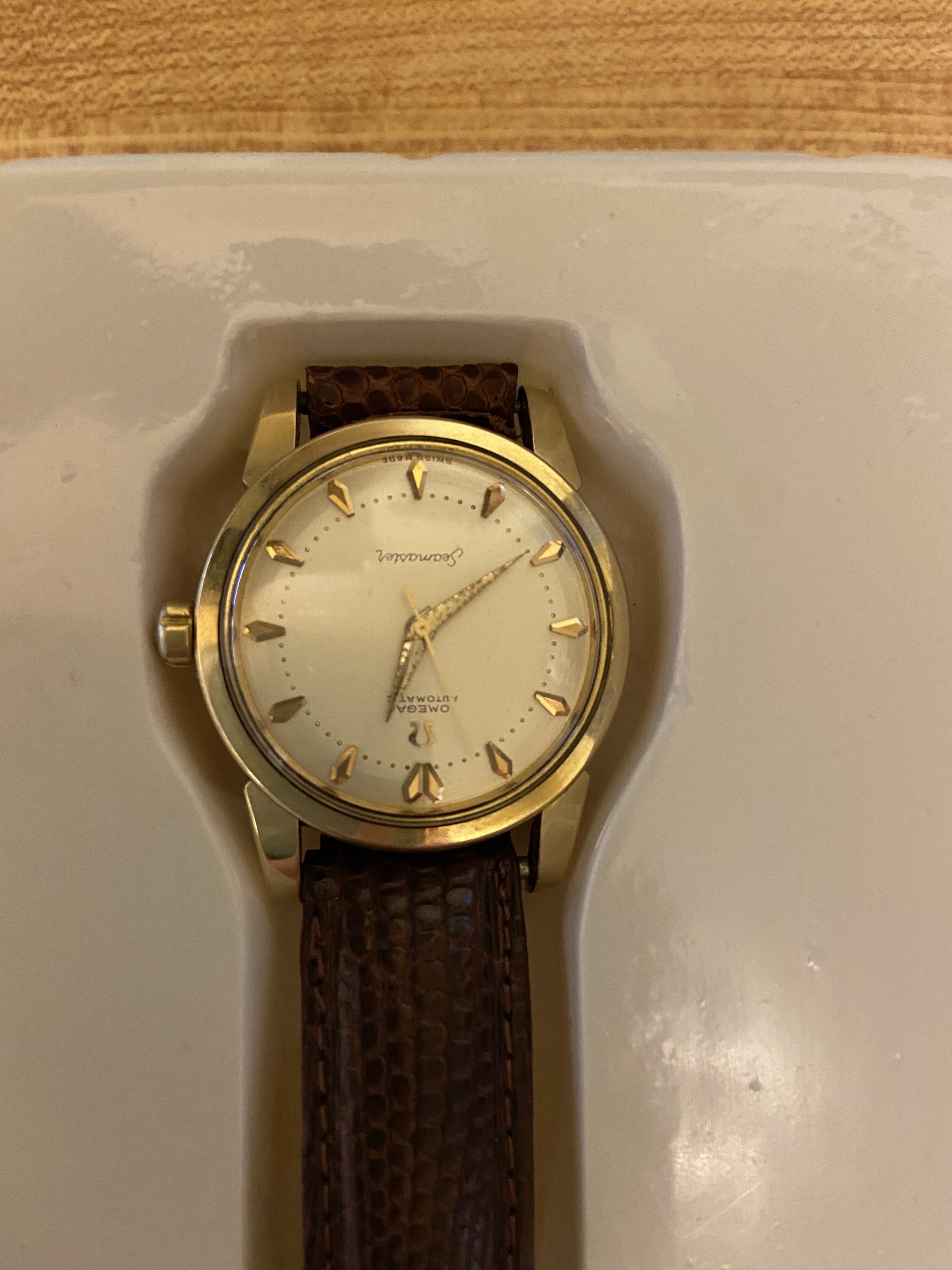 I'm new here and need help to identify a 50's (?) automatic watch that my father gave me some 30 yrs ago. I usually don't wear watches since they get scuffed and dinged and I did not want my father's damaged; so never worn outside. It does have minor wear since he got it some many years back. It was last serviced in the late 90's but still keeps accurate time.