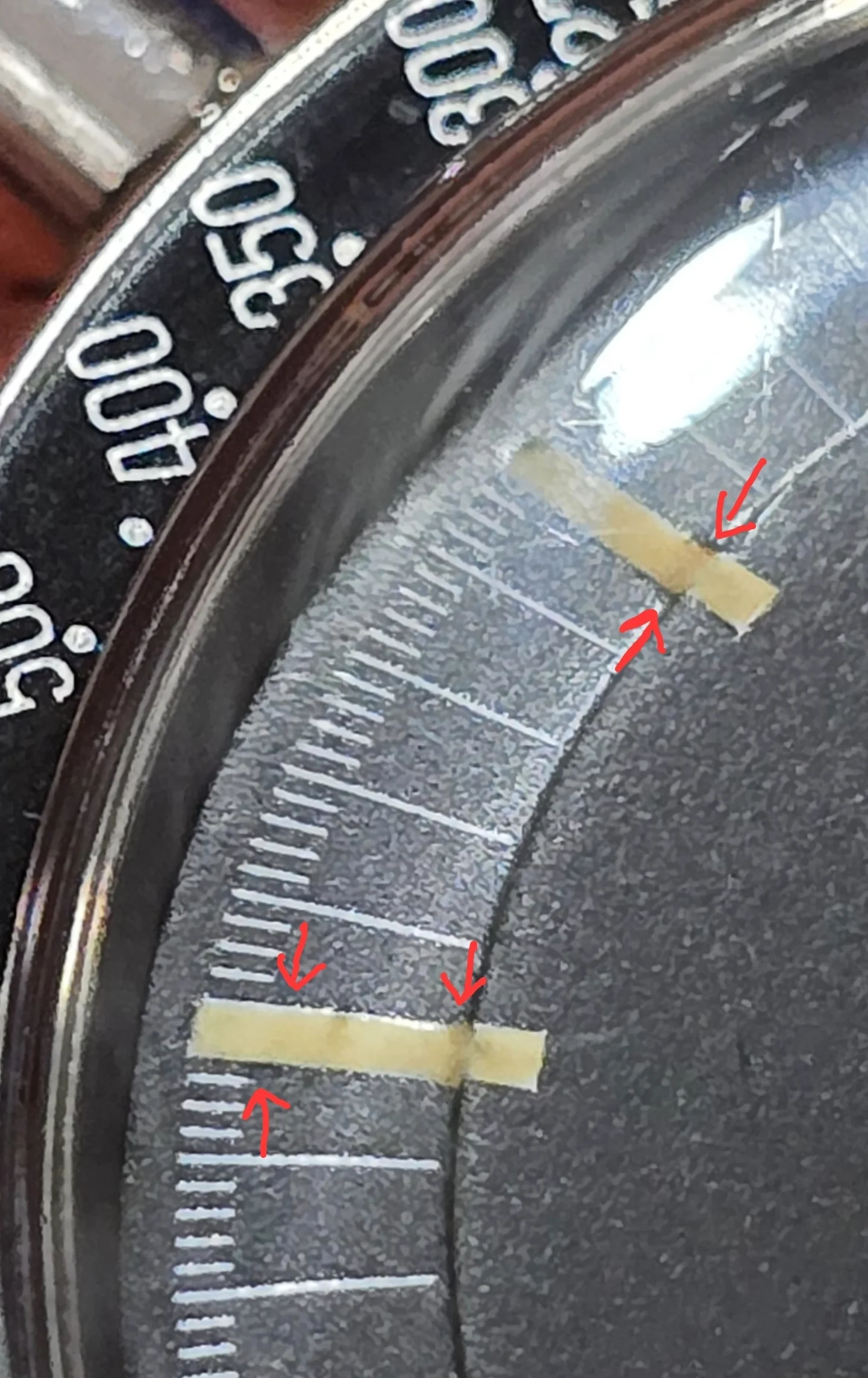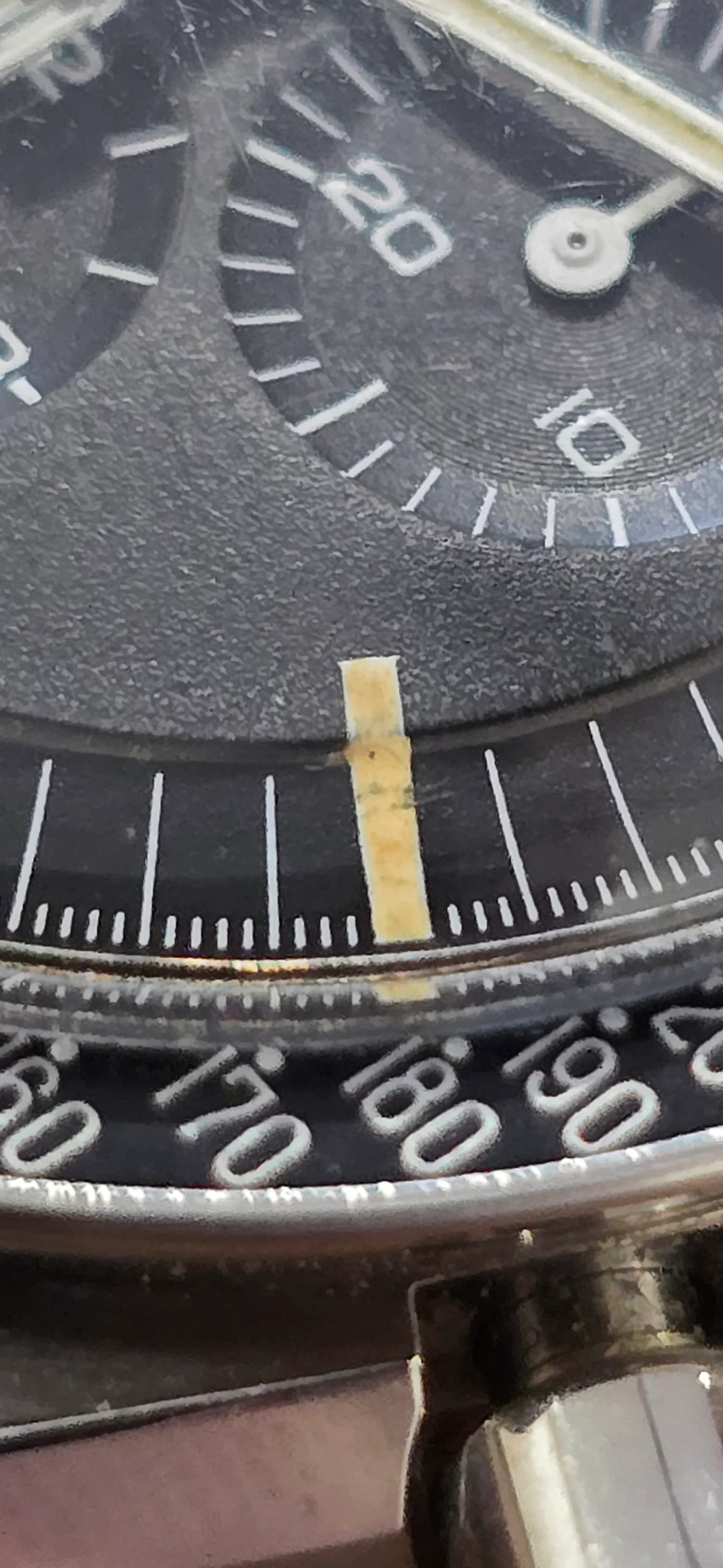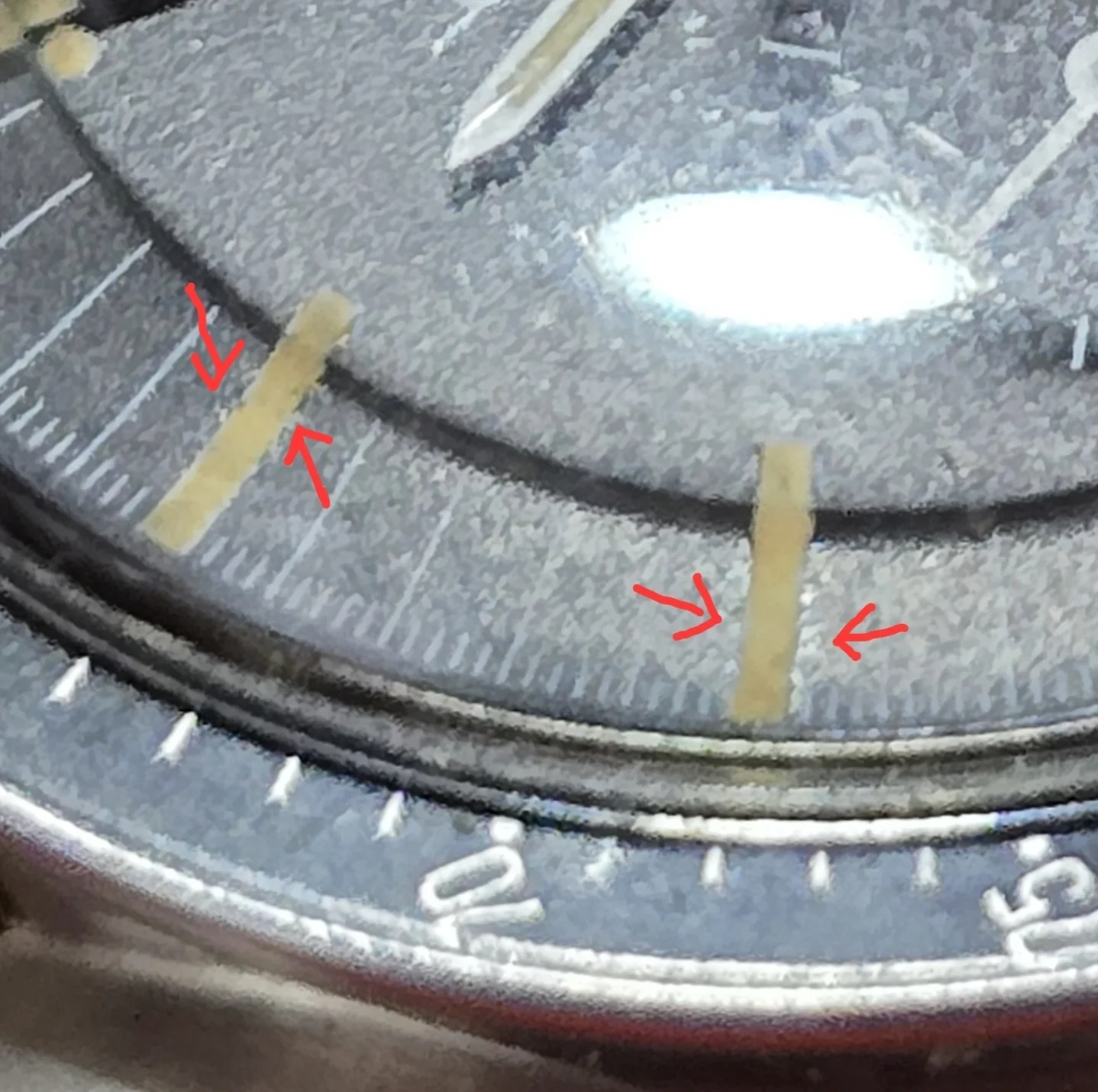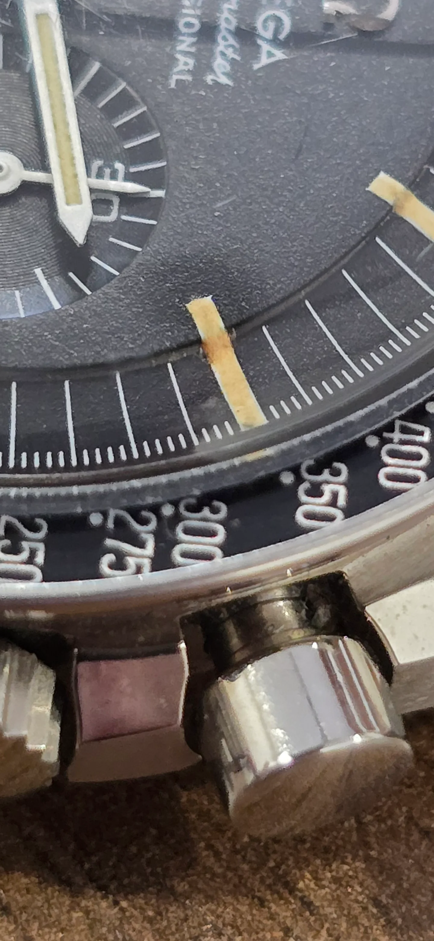 I would agree that it is most likely an attempt to stabilize the original lume. I passed on a beautiful '62 Speedmaster because whenever I looked at it, all I saw was the stabilizing agent leaking around the plot.