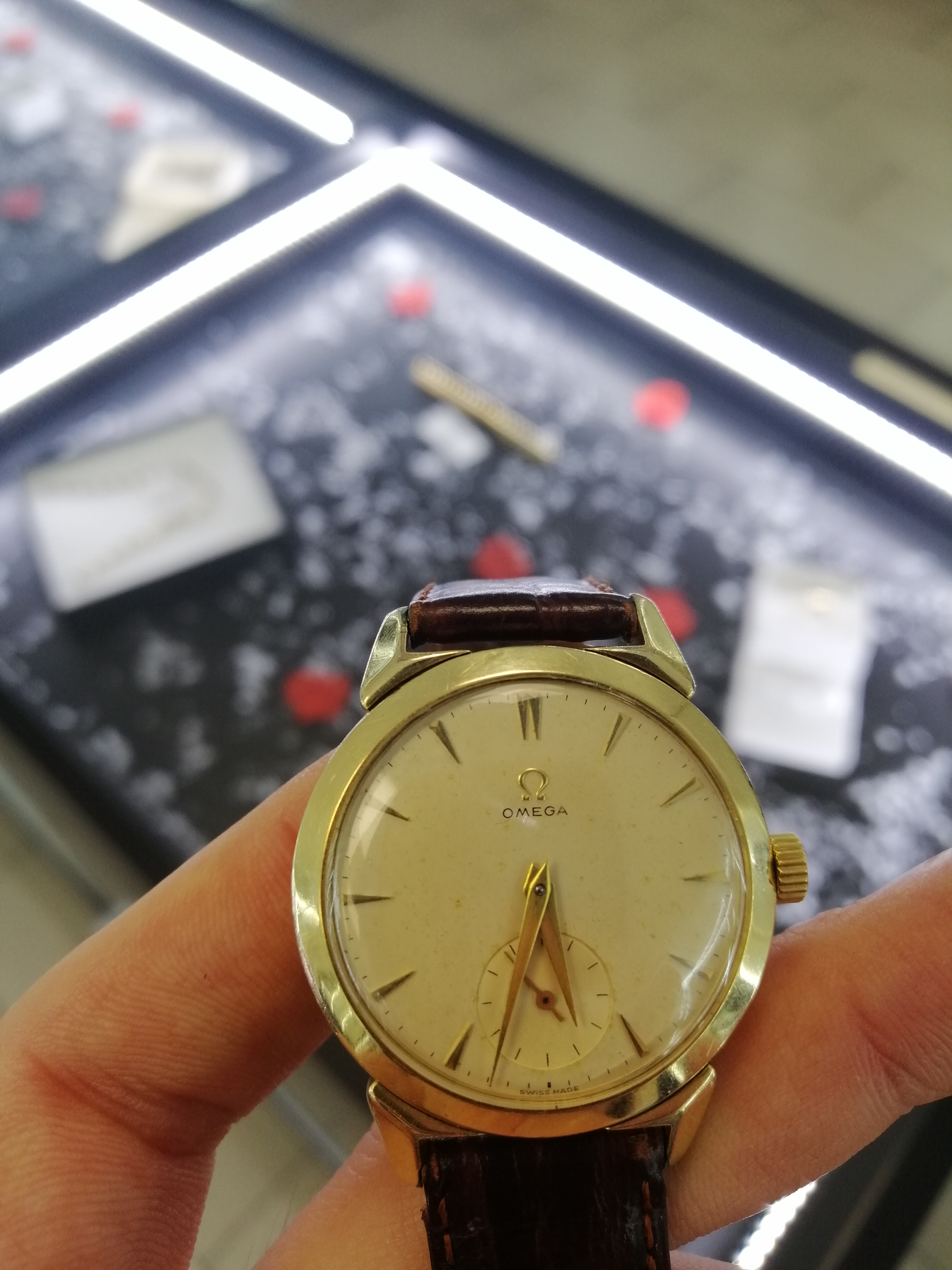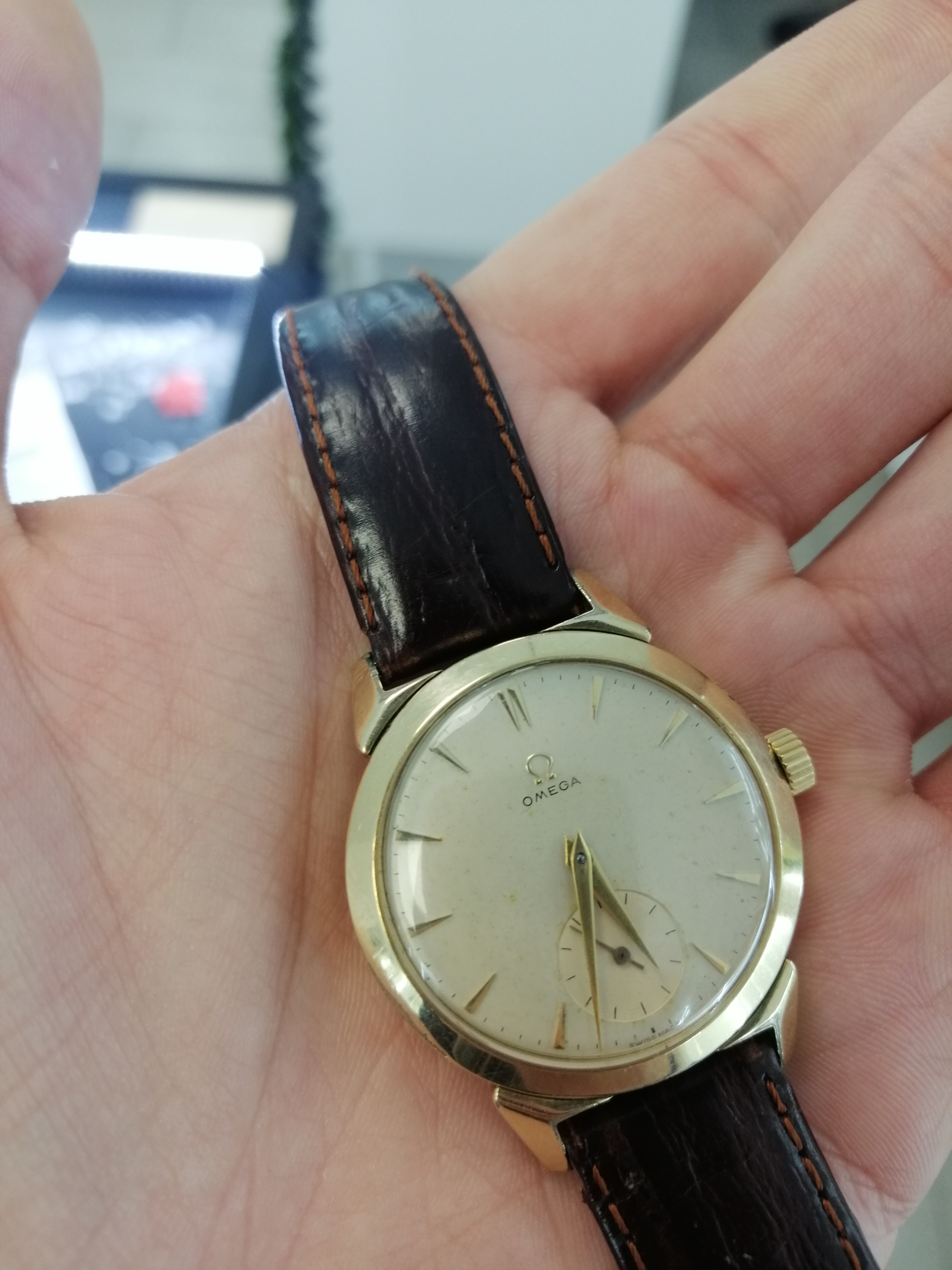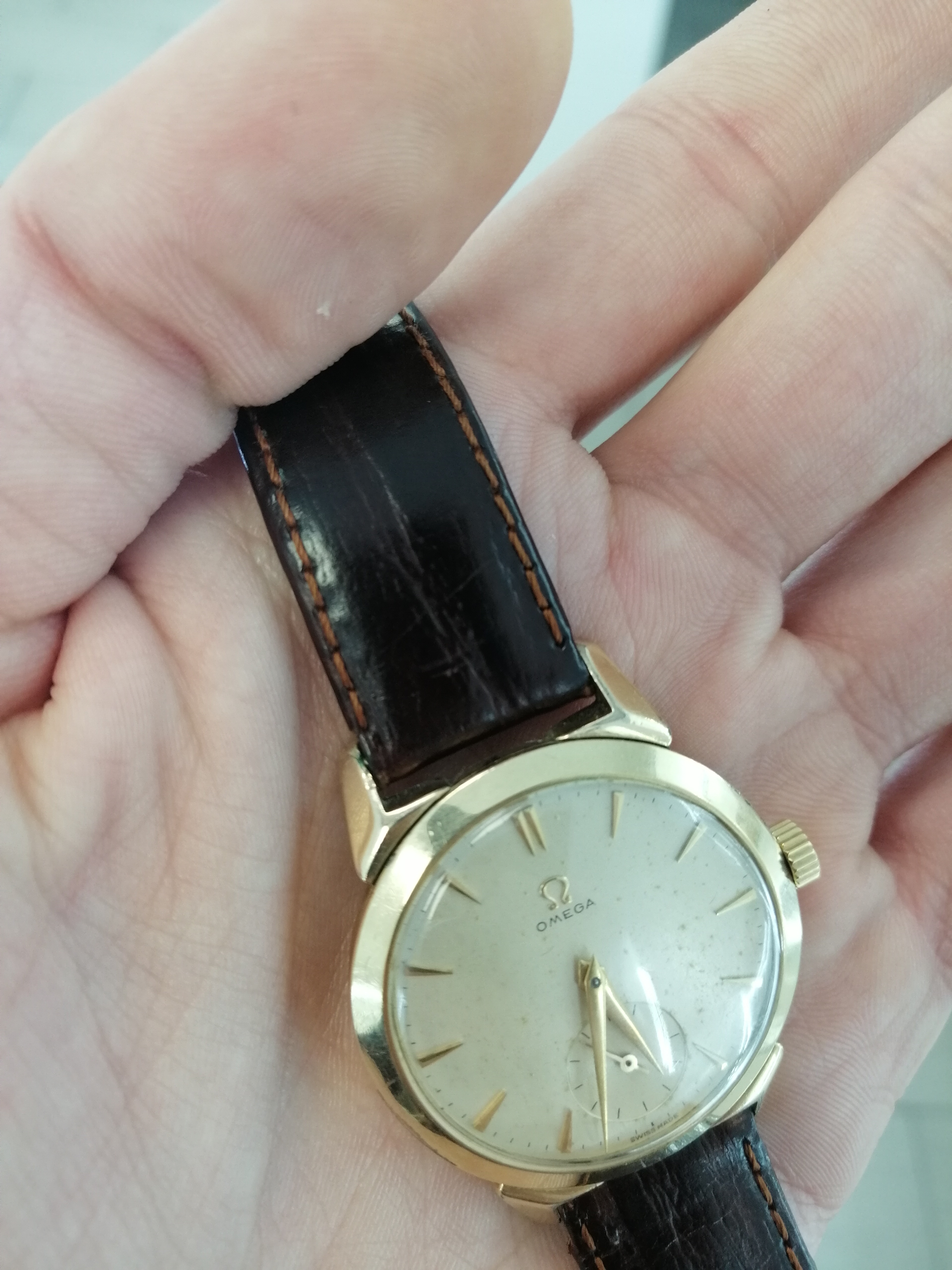 Found this vintage Omega at local pawn shop. As far as I can tell, dial looks original with light patina. Case is gold plated with horn lugs and on some places it fell of, but I can live with that. Crown is not original and unsigned. No photo of movement because they dont know how to open it but they say it was checked with local watchmaker who I know personally.