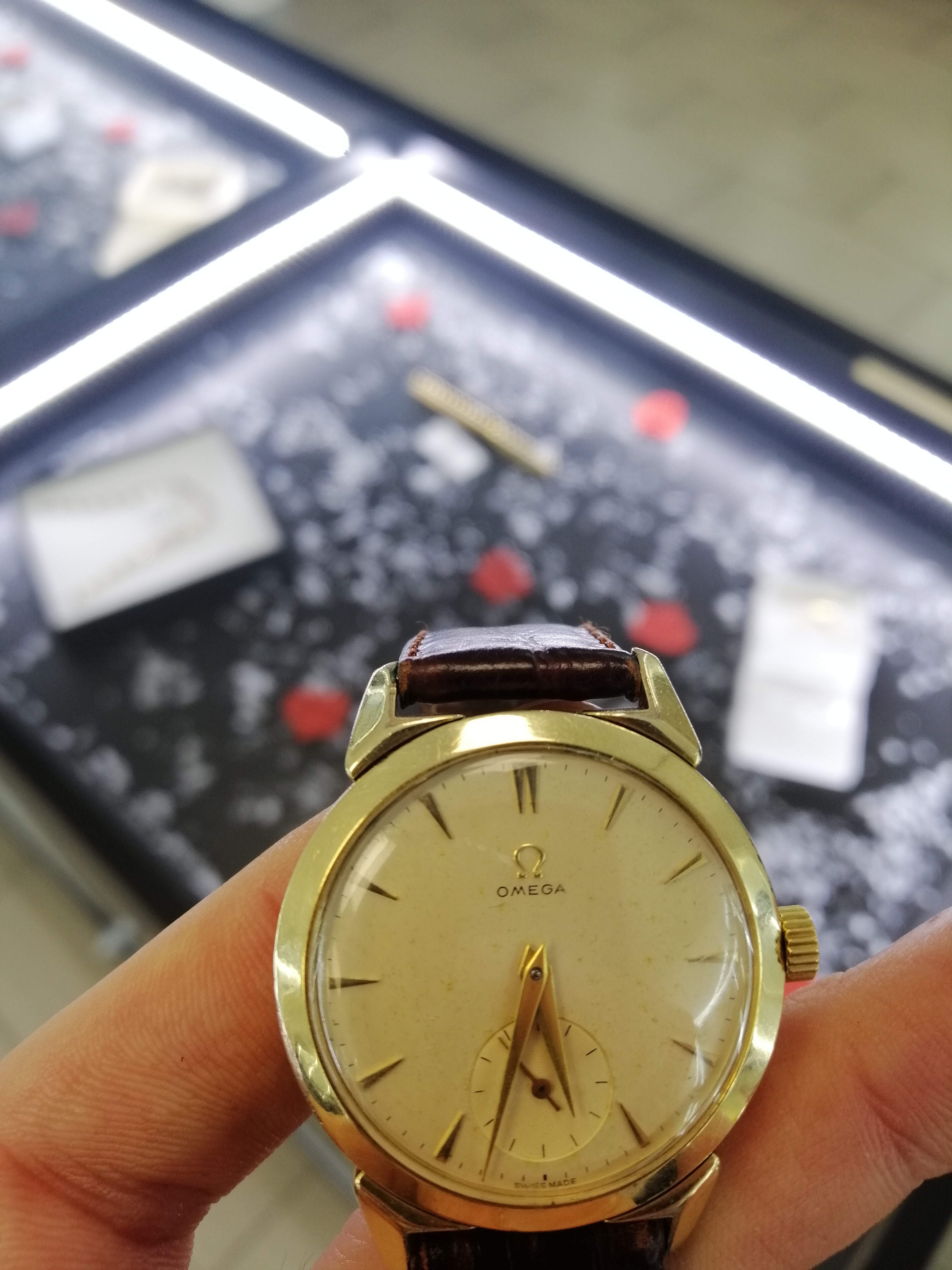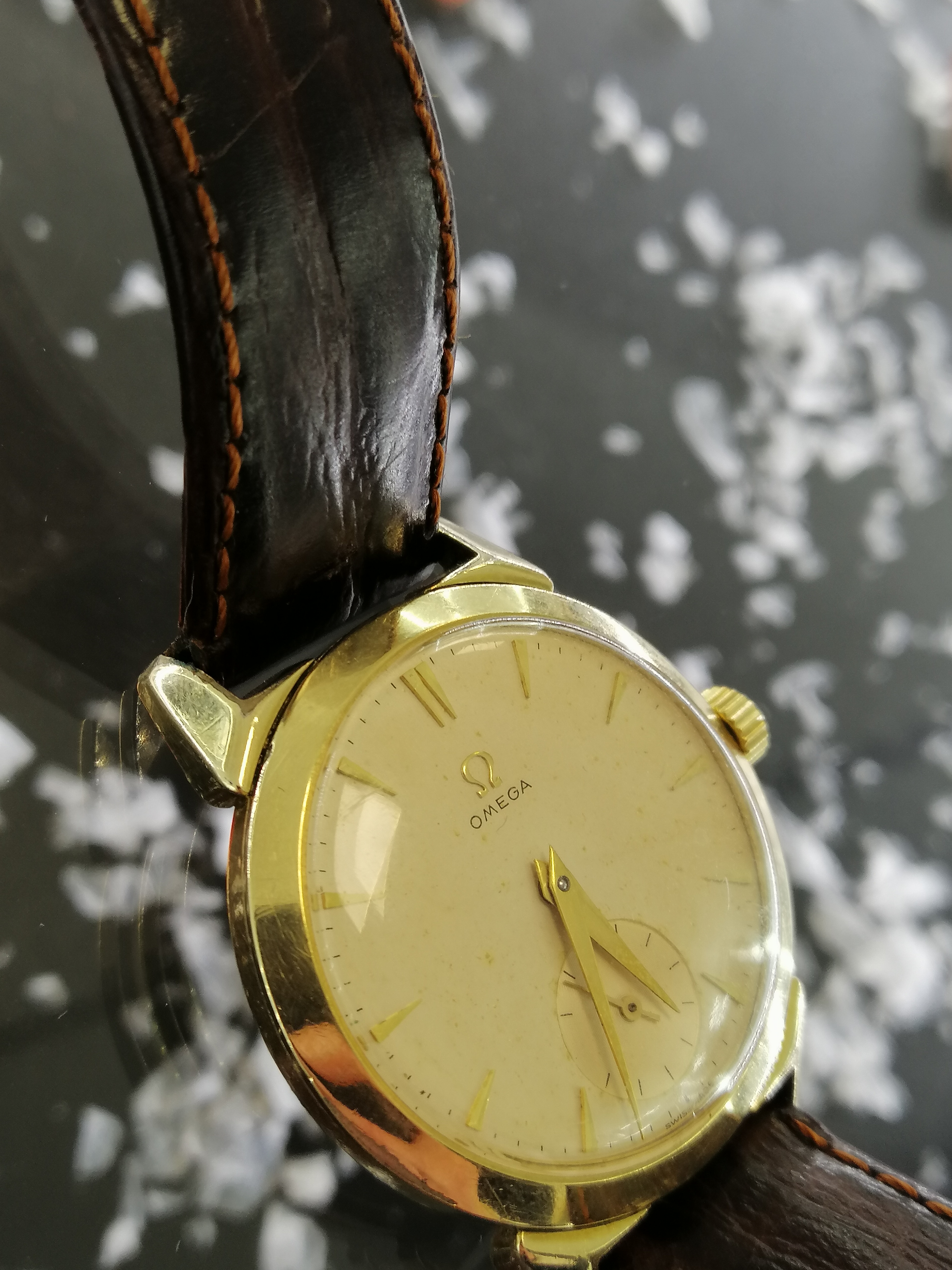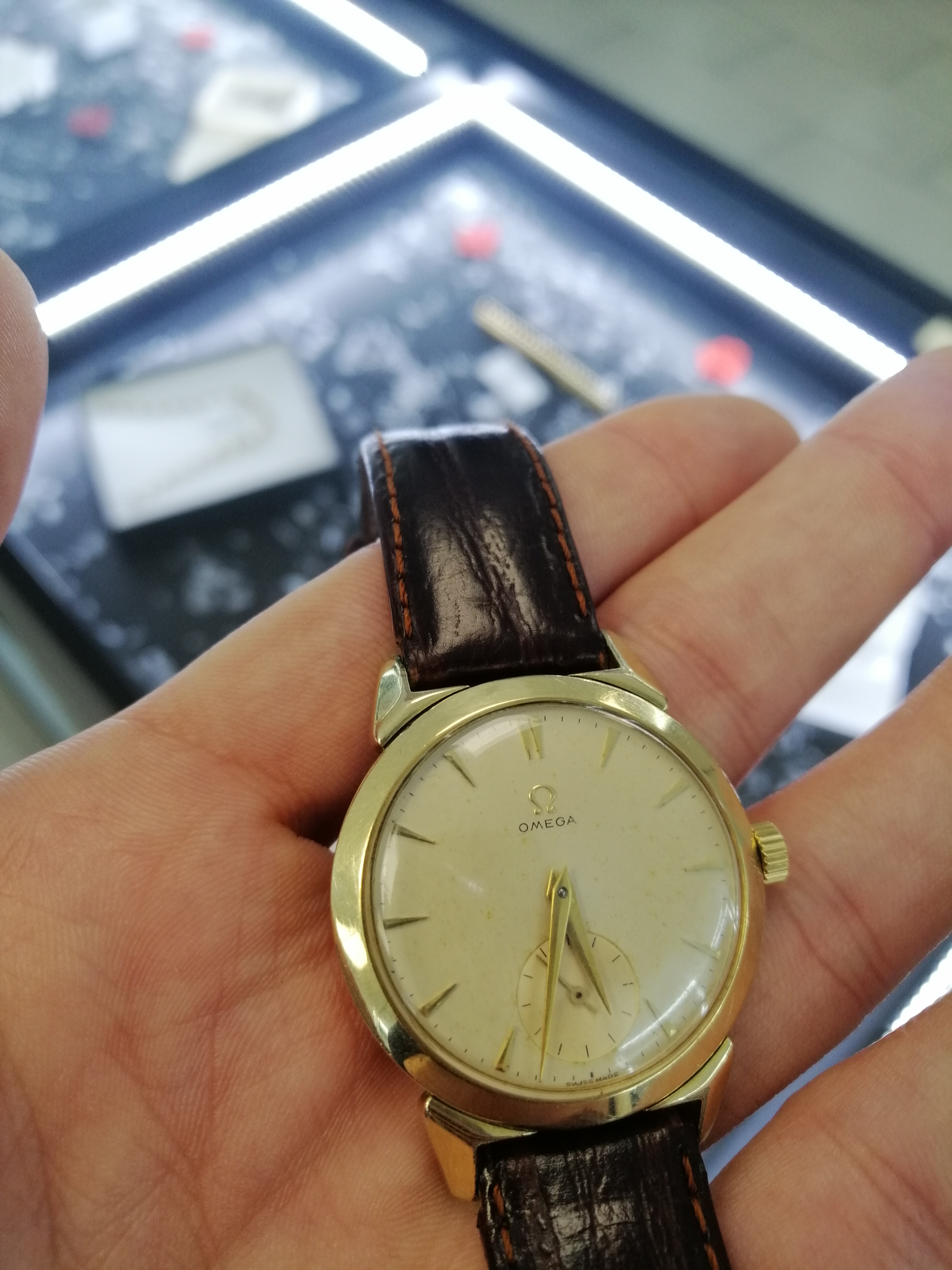 Found this vintage Omega at local pawn shop. As far as I can tell, dial looks original with light patina. Case is gold plated with horn lugs and on some places it fell of, but I can live with that. Crown is not original and unsigned. No photo of movement because they dont know how to open it but they say it was checked with local watchmaker who I know personally.