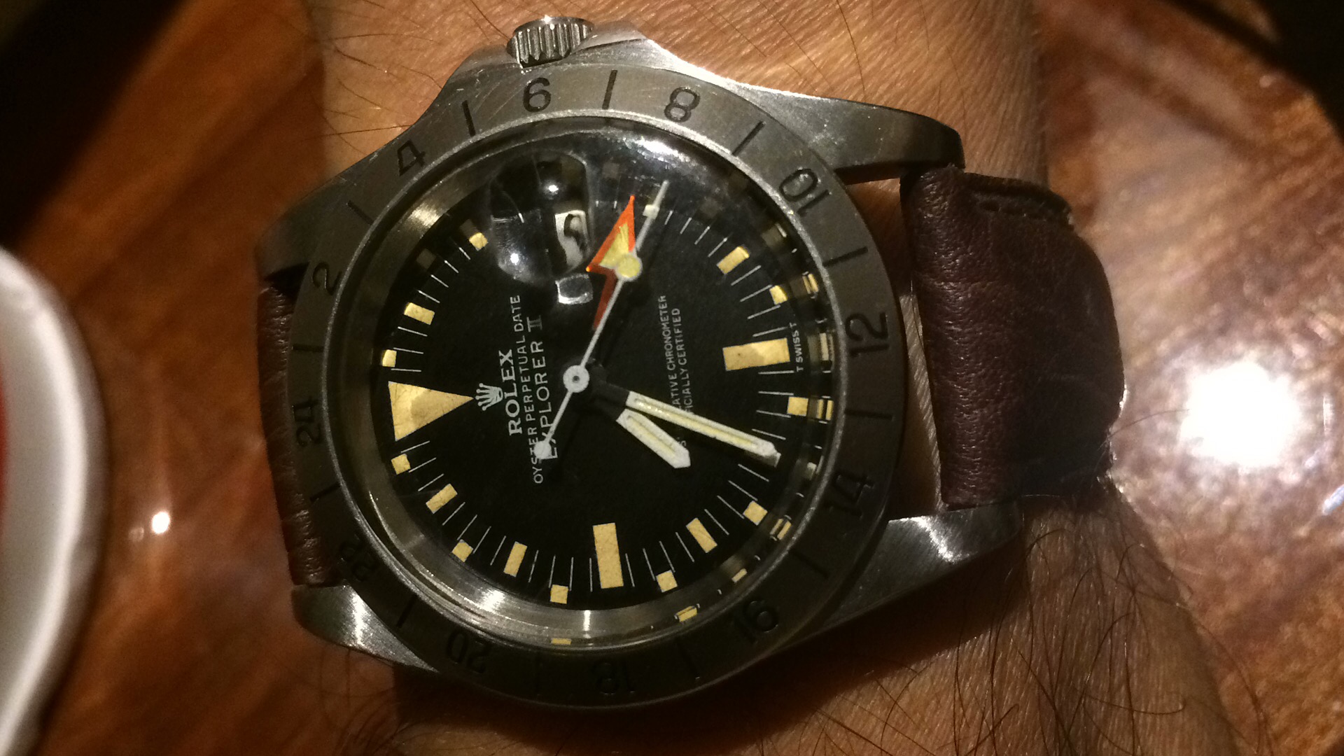 The GMT hand is so so WRONG... independently adjustable however. Fonts & markers were deliberately painted with a Faux Patina lume , the glass is plexi crystal , the movements a Swiss based ETA 2836-2