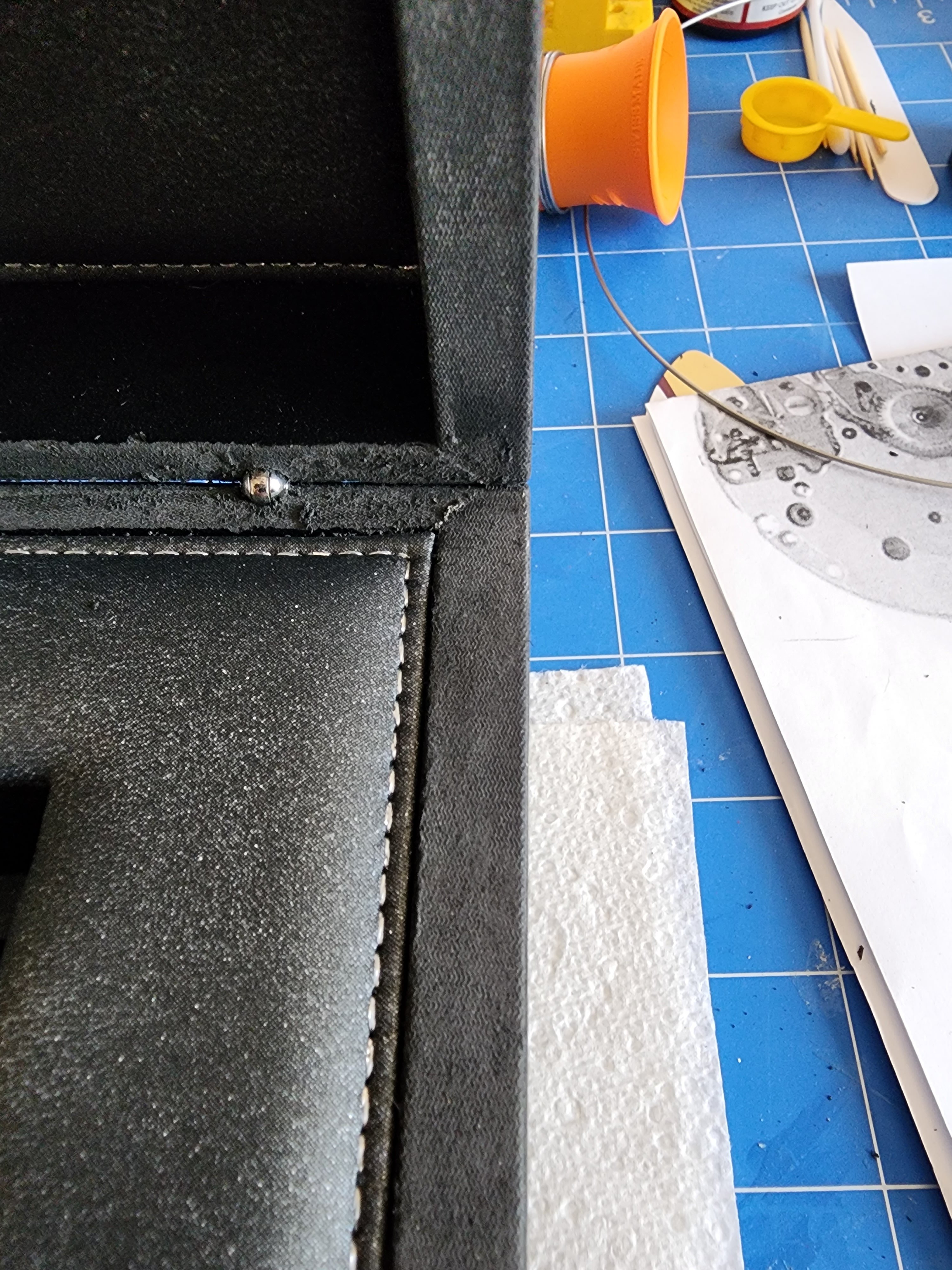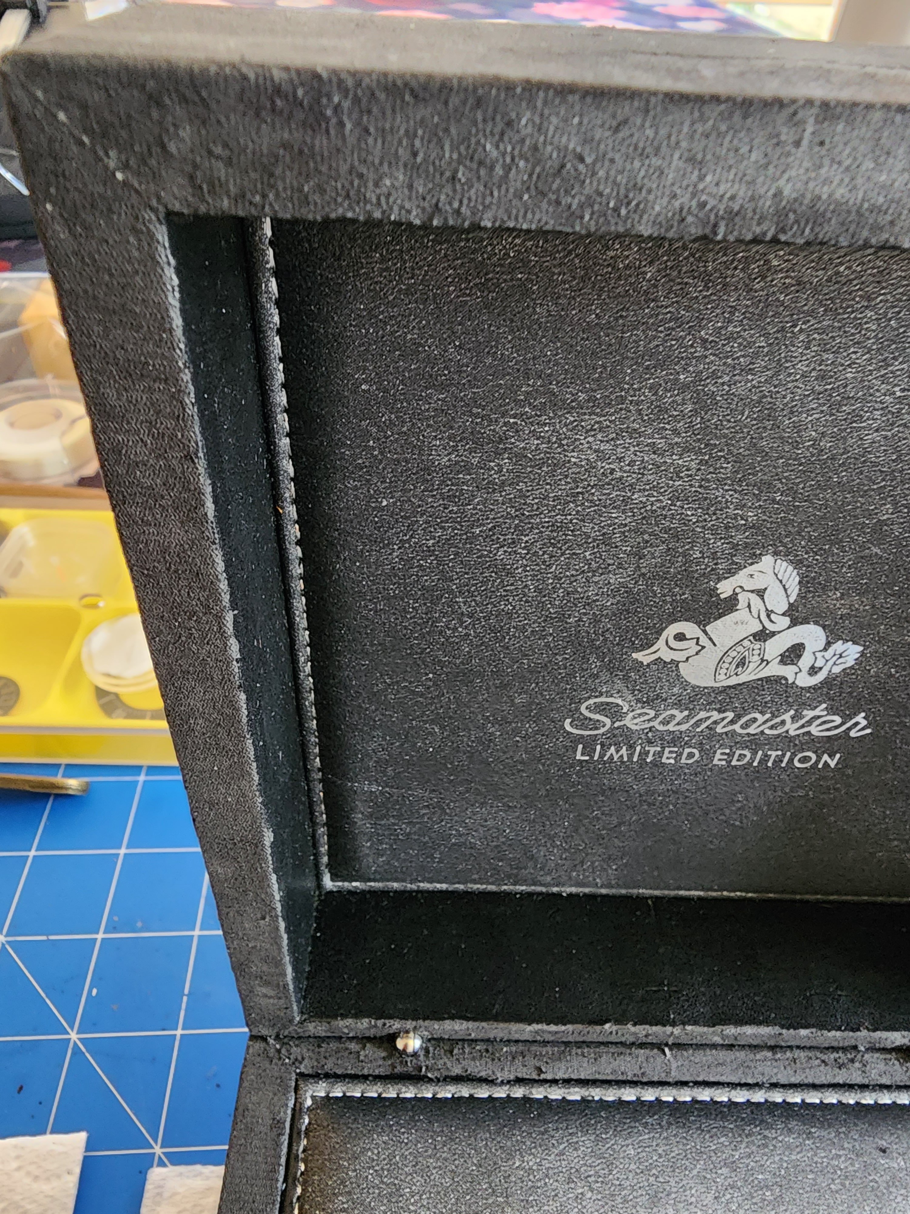 The faux leather or vinyl has just flaked & peeled away taking the Omega Logo with it - I have simply just lifted it off with masking tape to make it neat. It was so bad that just touching the outer faux covering was lifting and onto my fingers.