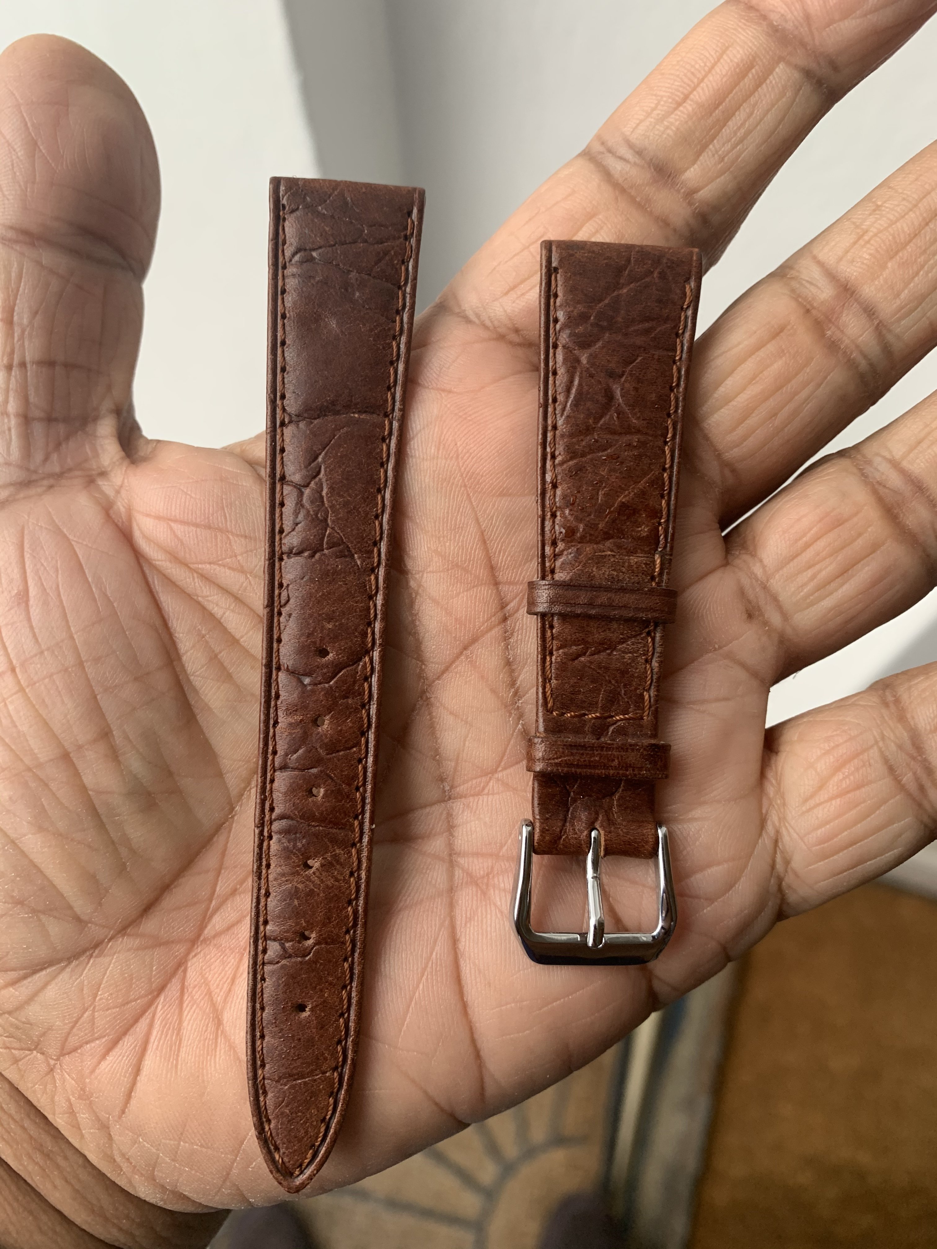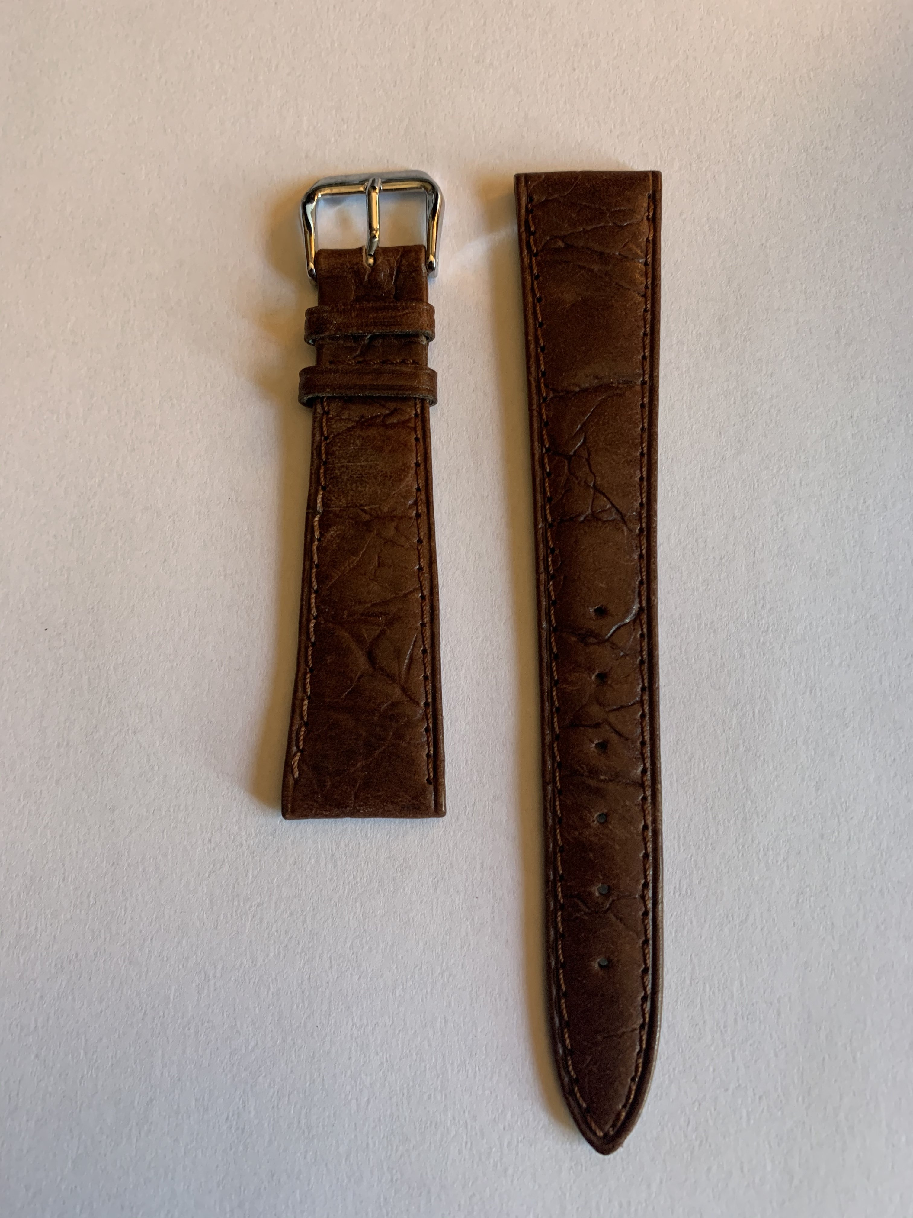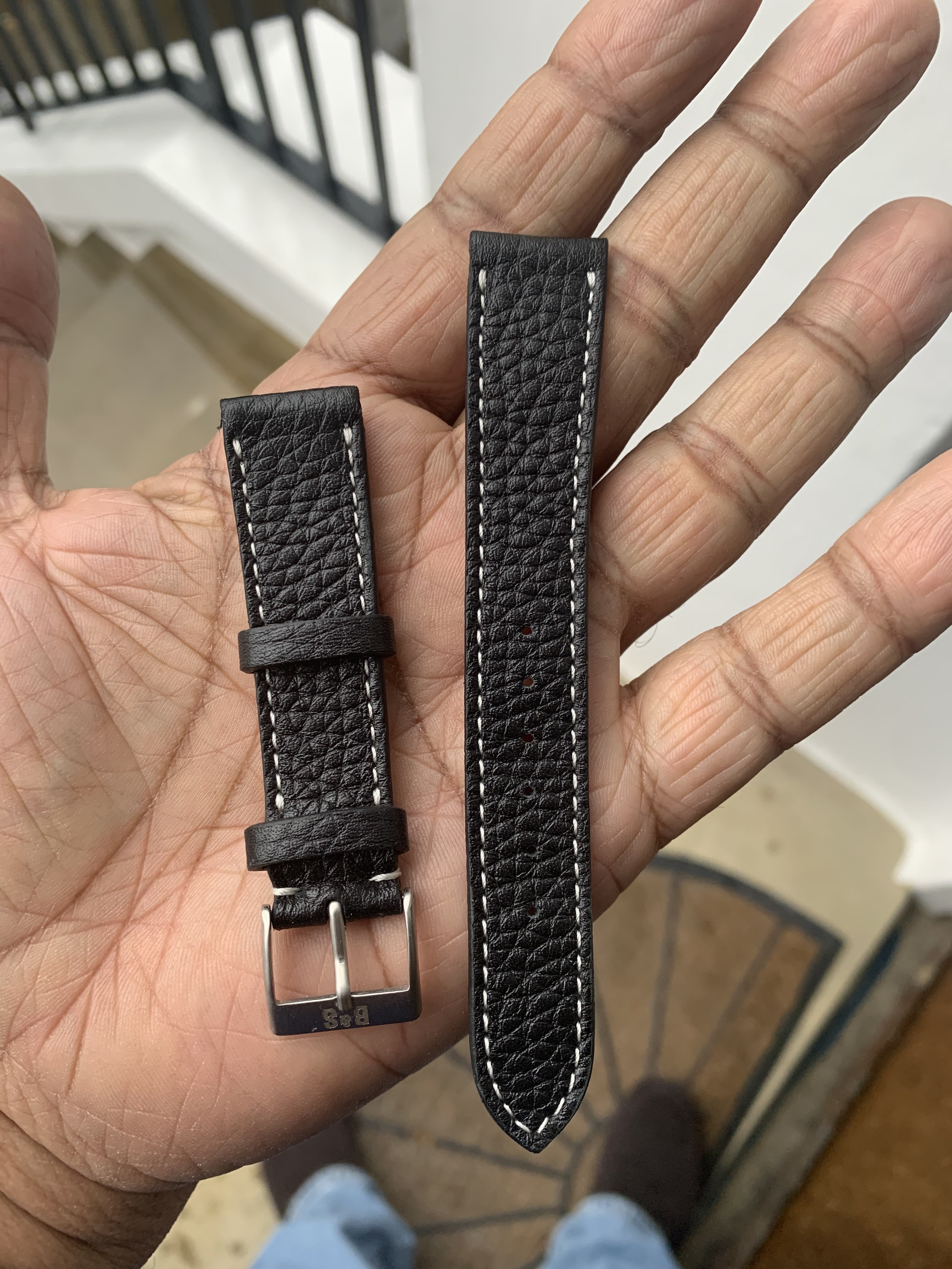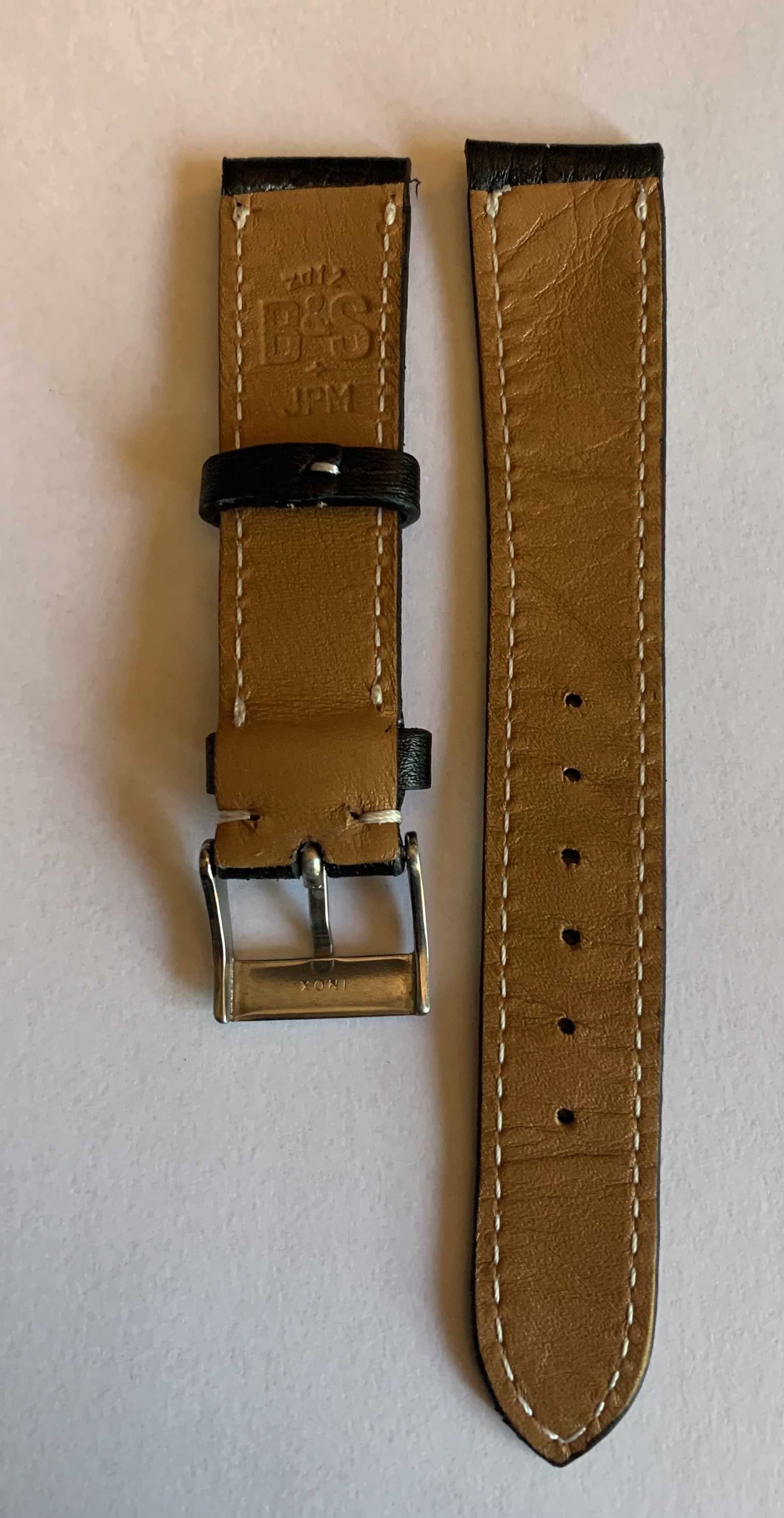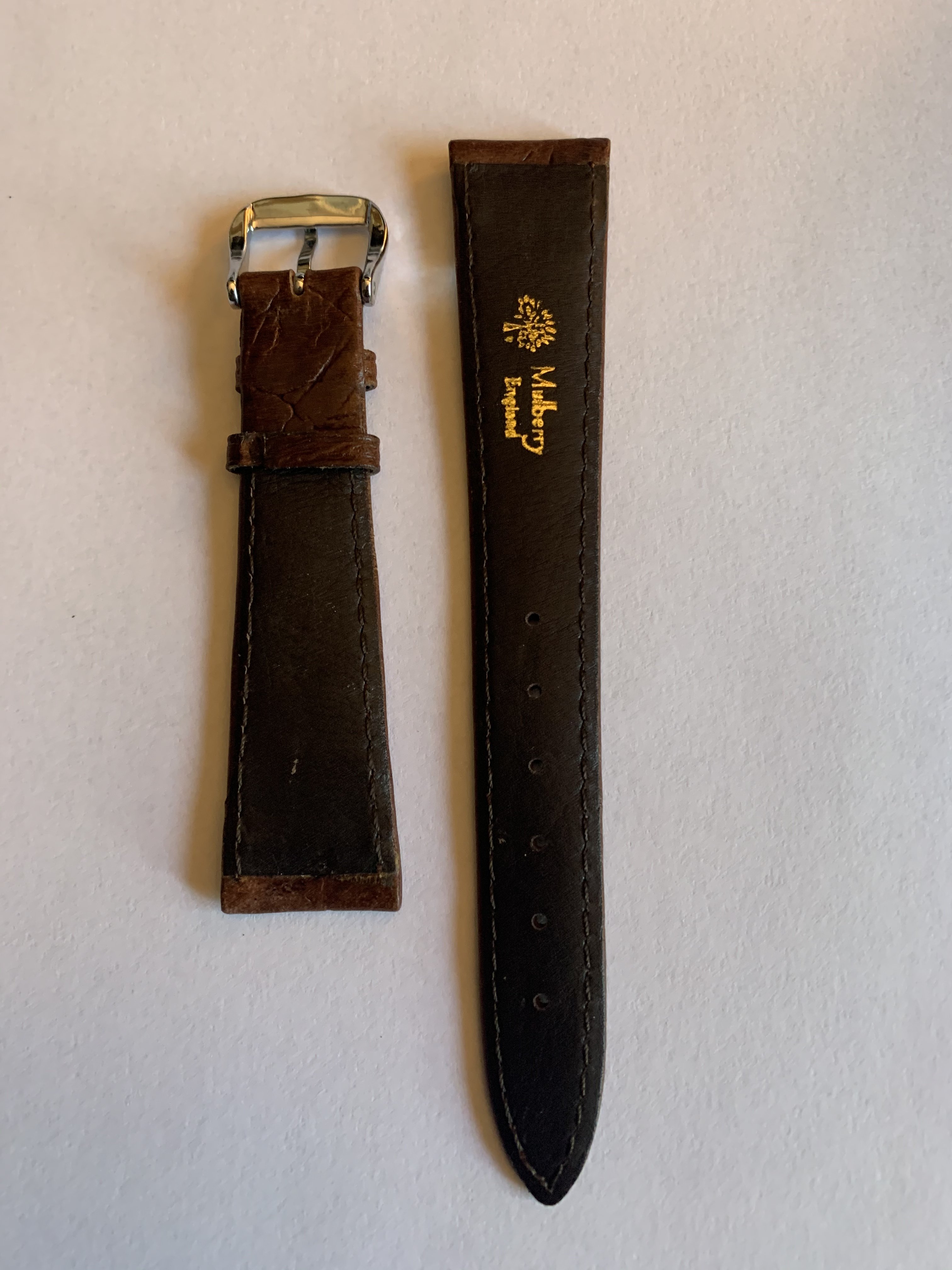 ·I have these two unwanted 19mm straps, both are new and unused. The first is a Bulang & Sons black rich creme strap, currently on their web site for E130. The second is a vintage NOS chocolate brown Congo leather strap from Mulberry (a swish British leather goods store, where Mrs K spends far too long looking dreamily at overpriced handbags...).