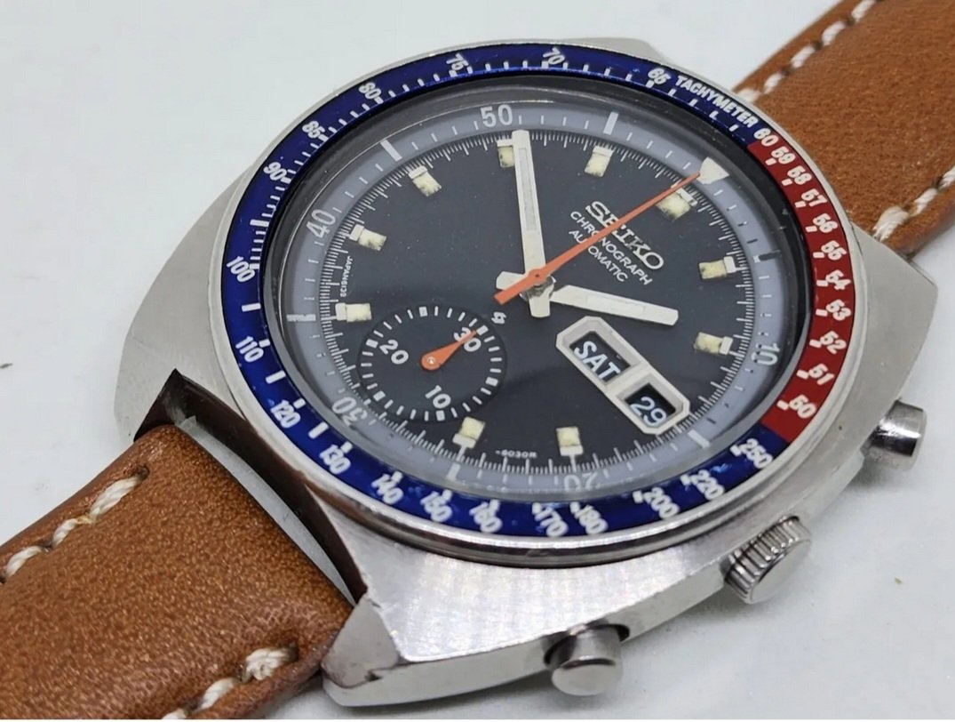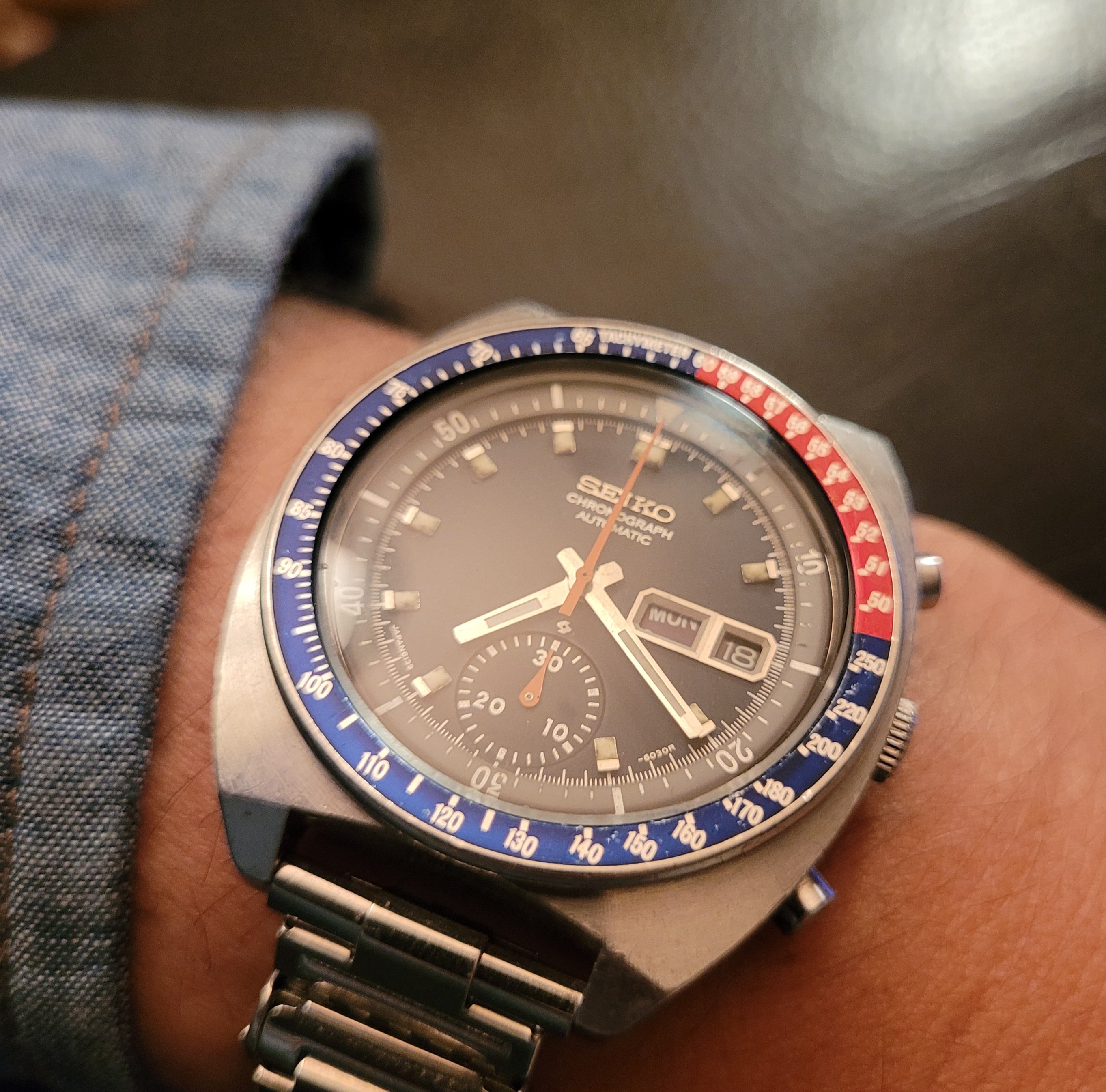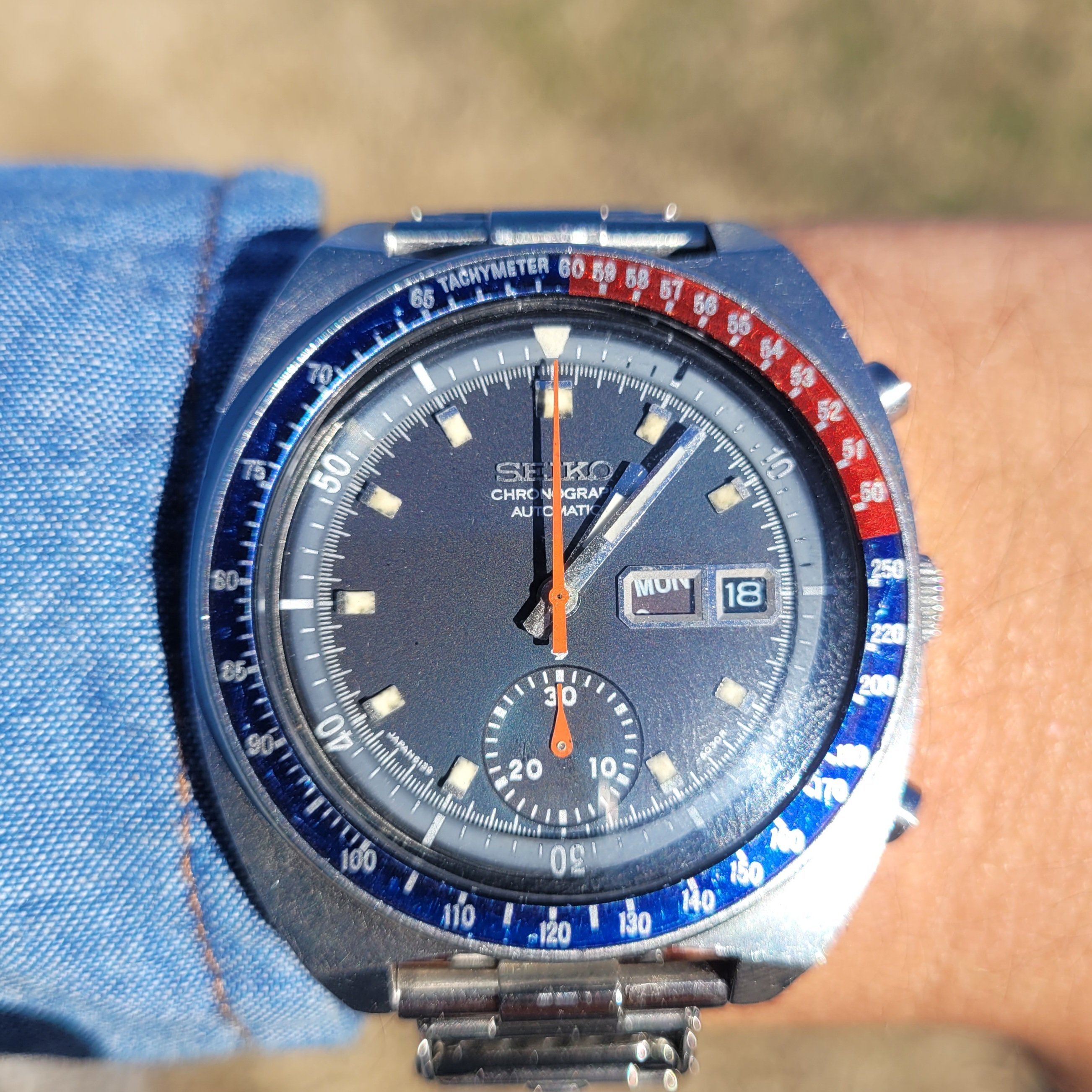 ·I decided to buy a chronograph awhile back and after some research decided that the 6139-600x series was the one for me. I bought this one on Ebay from a Venezuelan seller, and he claims it was recently serviced. The watch arrived today and I am mostly happy, it runs great and everything functions correctly, but the day is not properly aligned. It was before it shipped so, I am guessing it took a shock somewhere between Venzuela and Oklahoma. The first is a shot provided by the seller, the second two are from today. I've never serviced a chronograph, so I'll be sending this one off to my watchmaker after the new year.