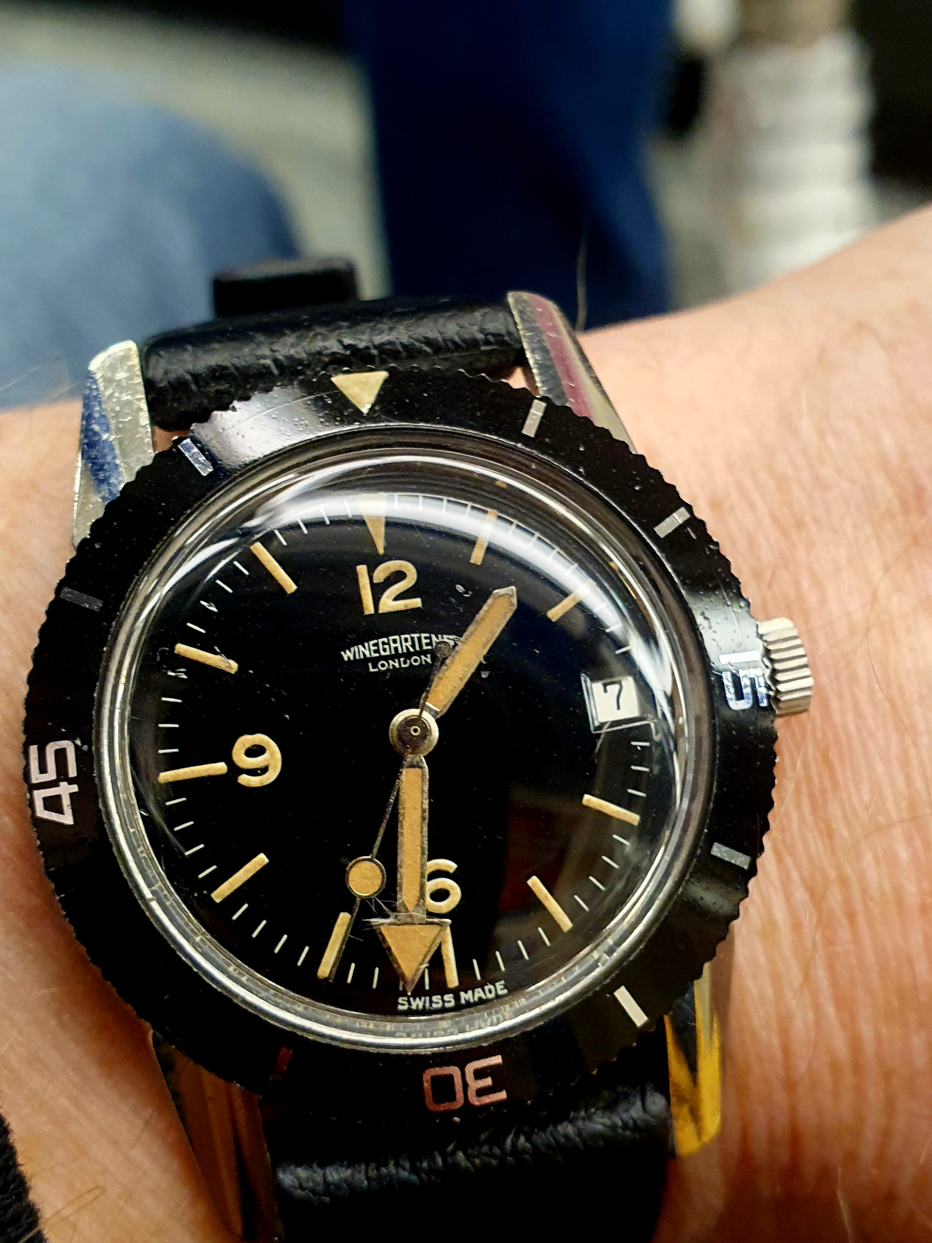 ·Winegartens was a famous London jewellers that sold in-house branded watches with movements and cases commissioned from well-known Swiss watchmakers such as Nivada and Ollech & Wajs. This one was acquired from a chap who bought up a significant amount of their remaining stock when they closed permanently. It's never been worn, and the case has never been cracked, so still trying to determine the details about it. In many ways, it seems to epitomize the late-60s skin-diver, with its wide black bezel, broad-arrow hands, and dial that evokes the iconic Blancpain 50 fathoms.