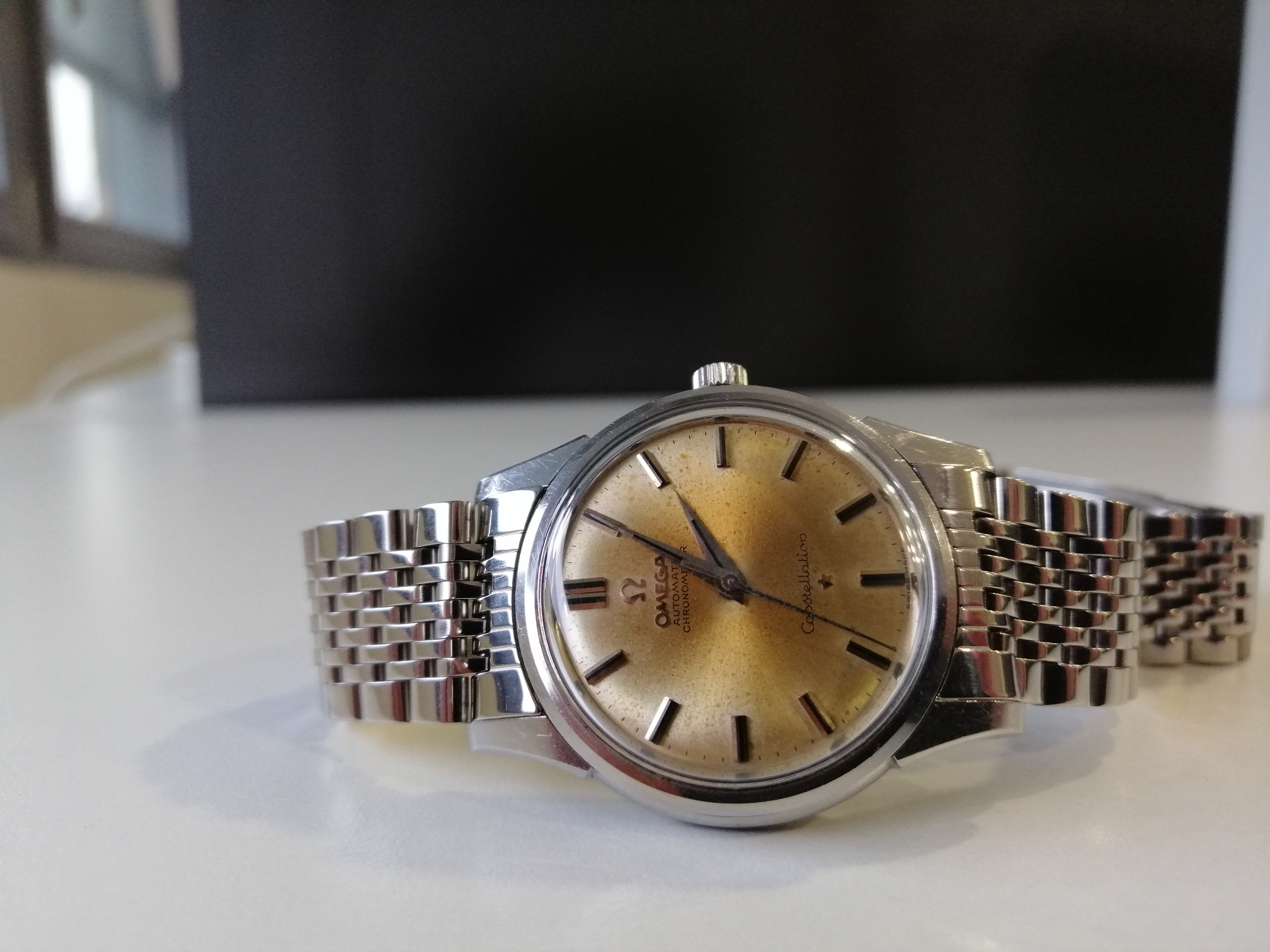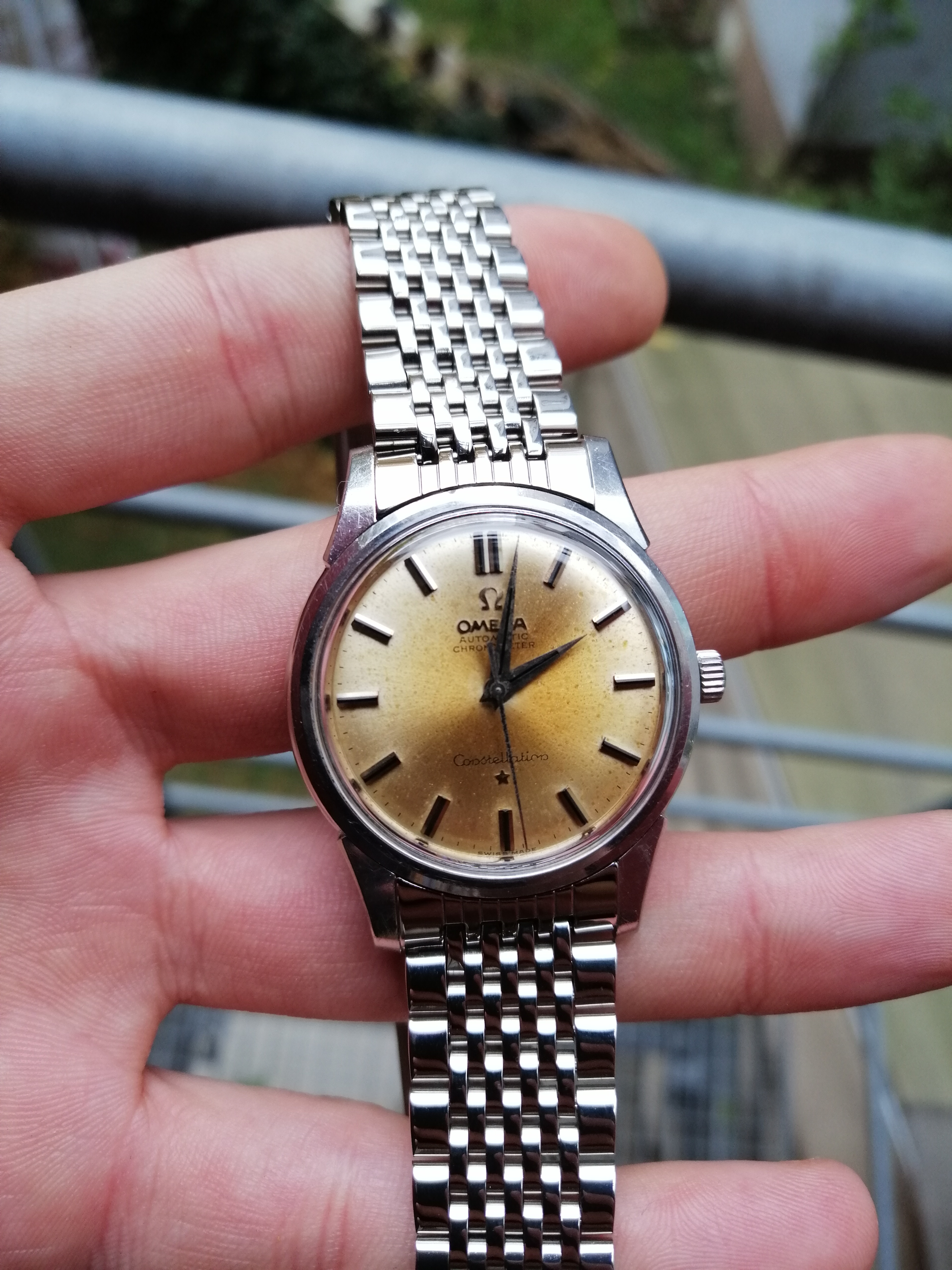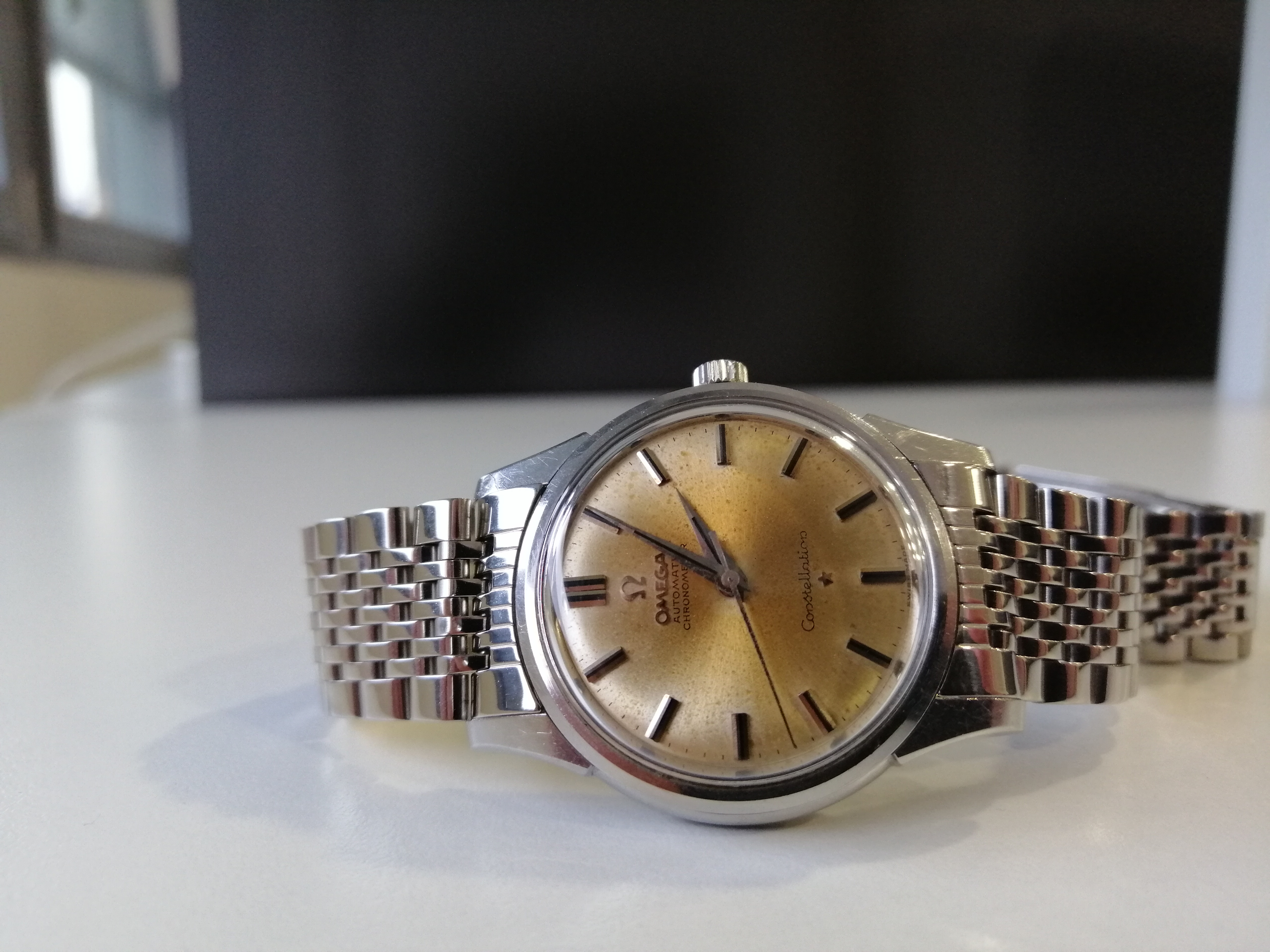 The case is unpolished but has scars, the crown is not original (as far as I understand it is not difficult to get the original). The bracelet seems to me not to be original (signed Omega 1502) but it fits very well so it doesn’t bother me too much. The dial is original and passes the MOY test but the letter O in the Constellation is slightly erased.