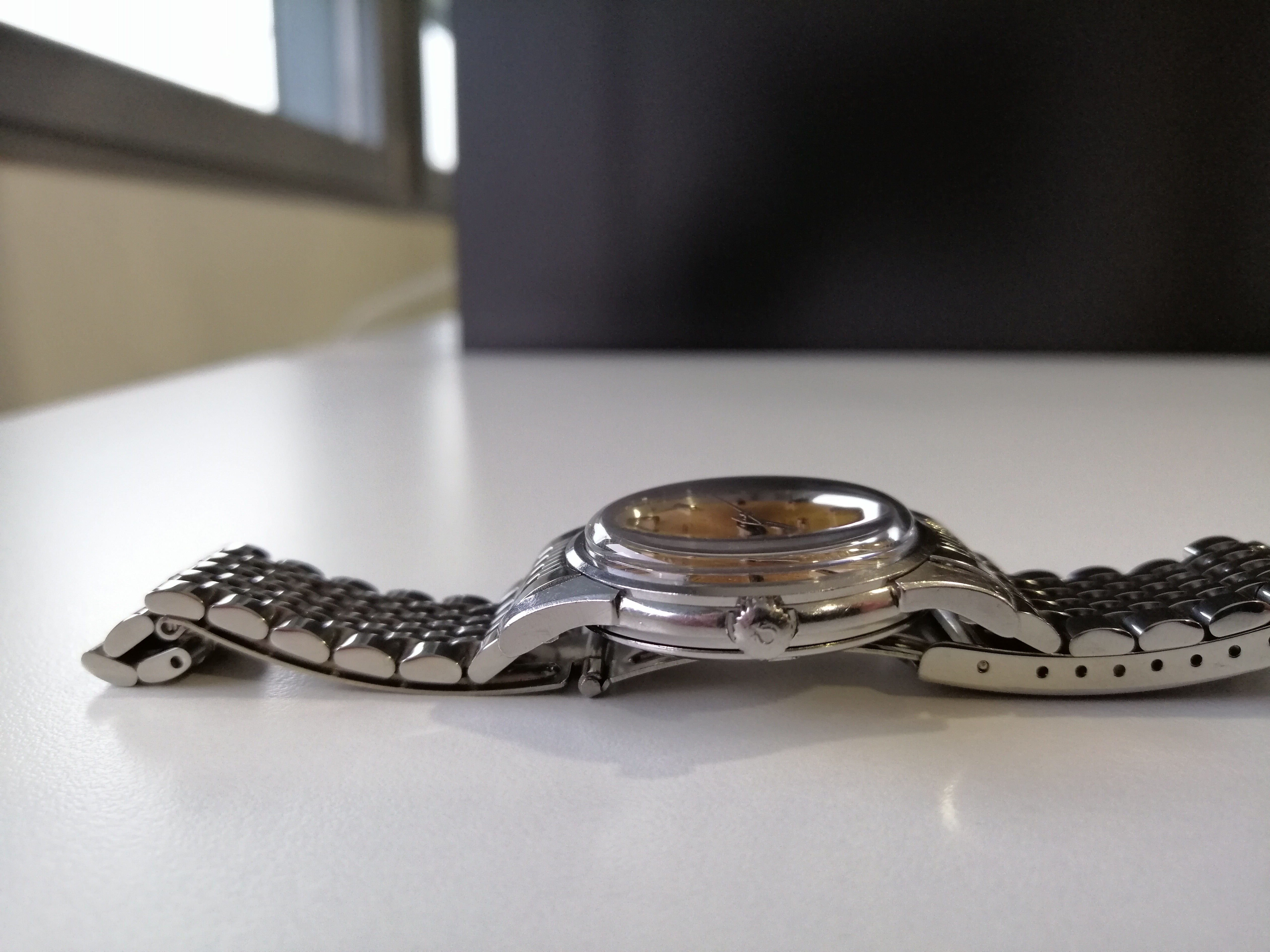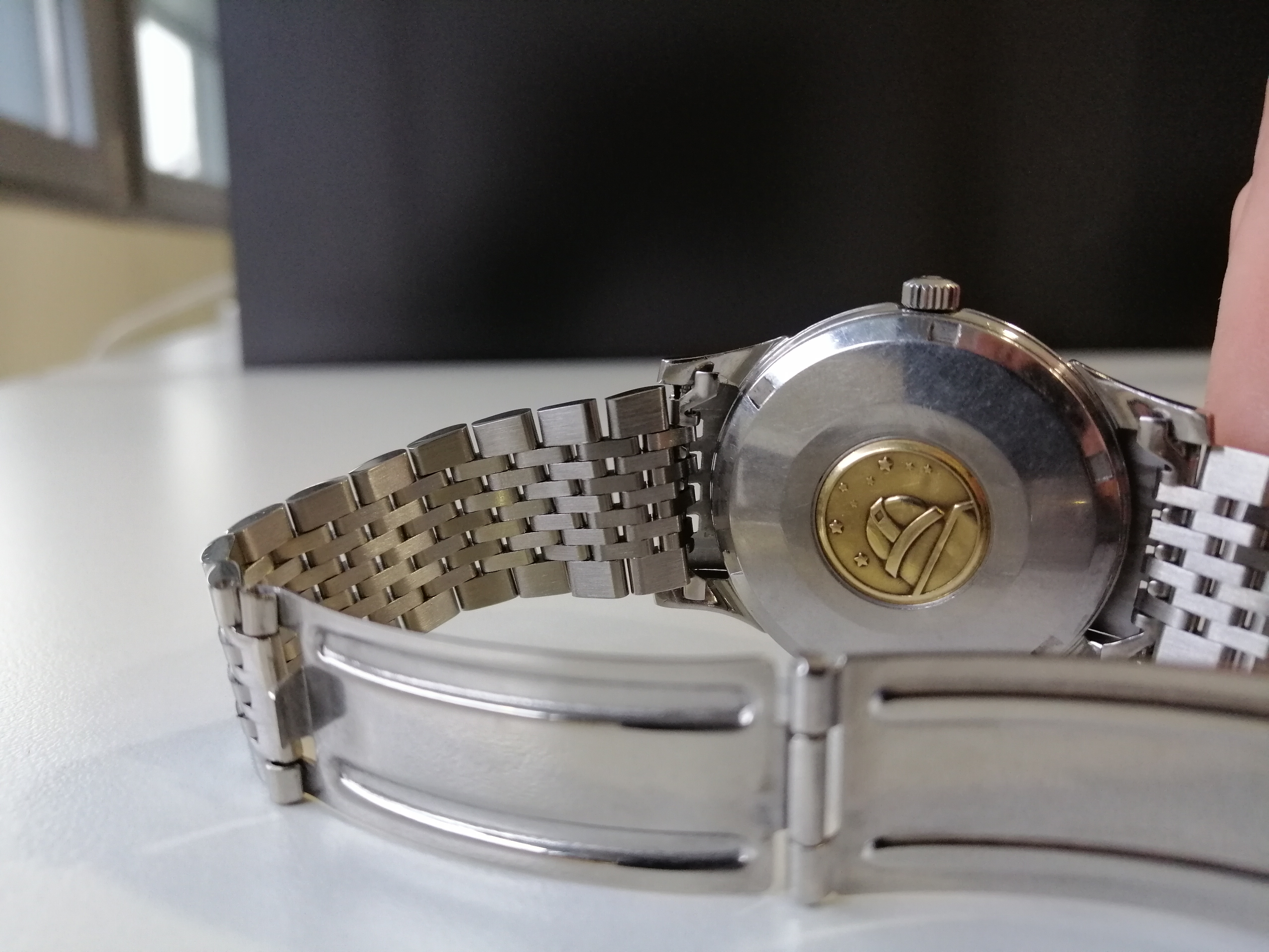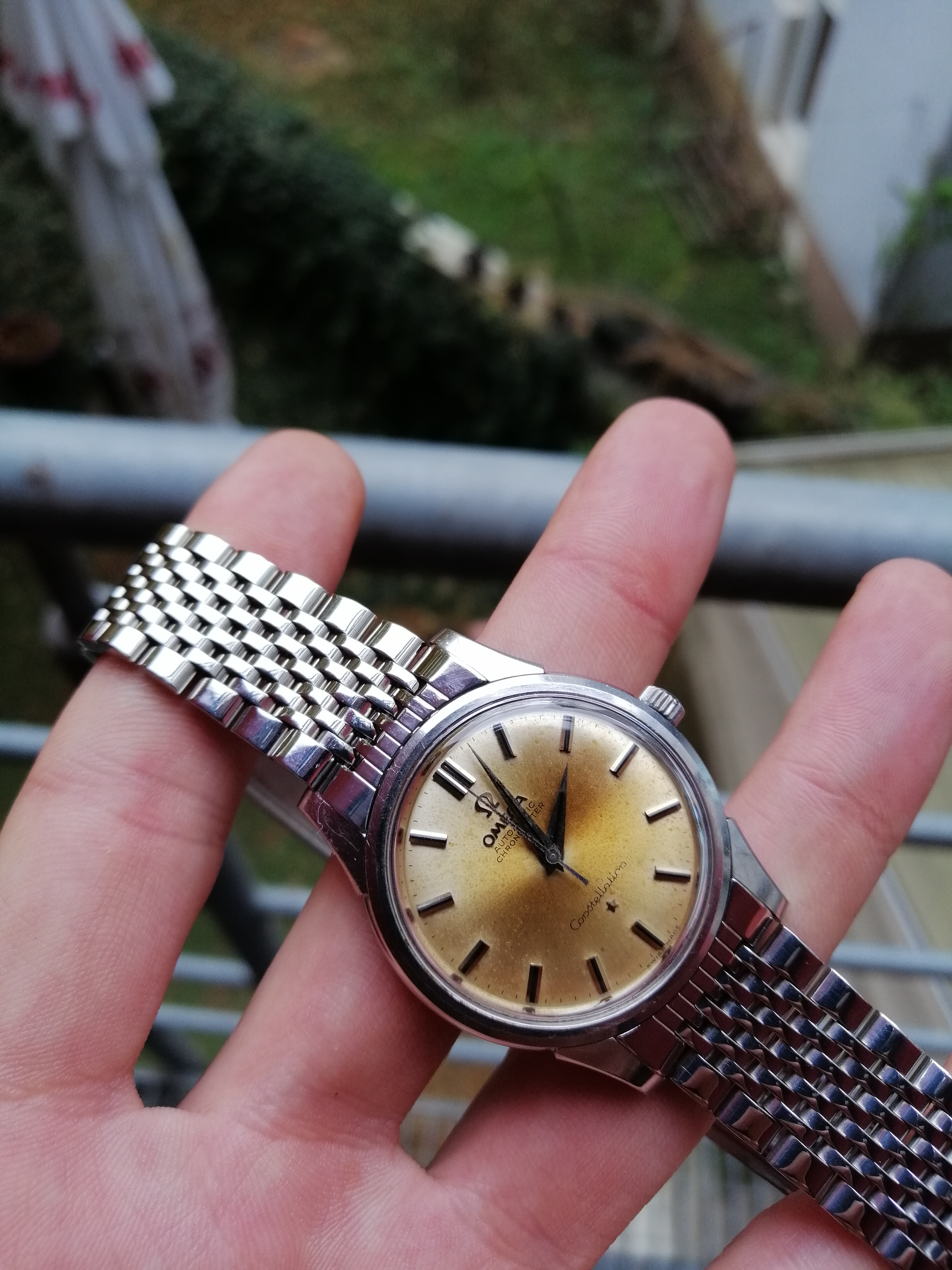 The case is unpolished but has scars, the crown is not original (as far as I understand it is not difficult to get the original). The bracelet seems to me not to be original (signed Omega 1502) but it fits very well so it doesn’t bother me too much. The dial is original and passes the MOY test but the letter O in the Constellation is slightly erased.