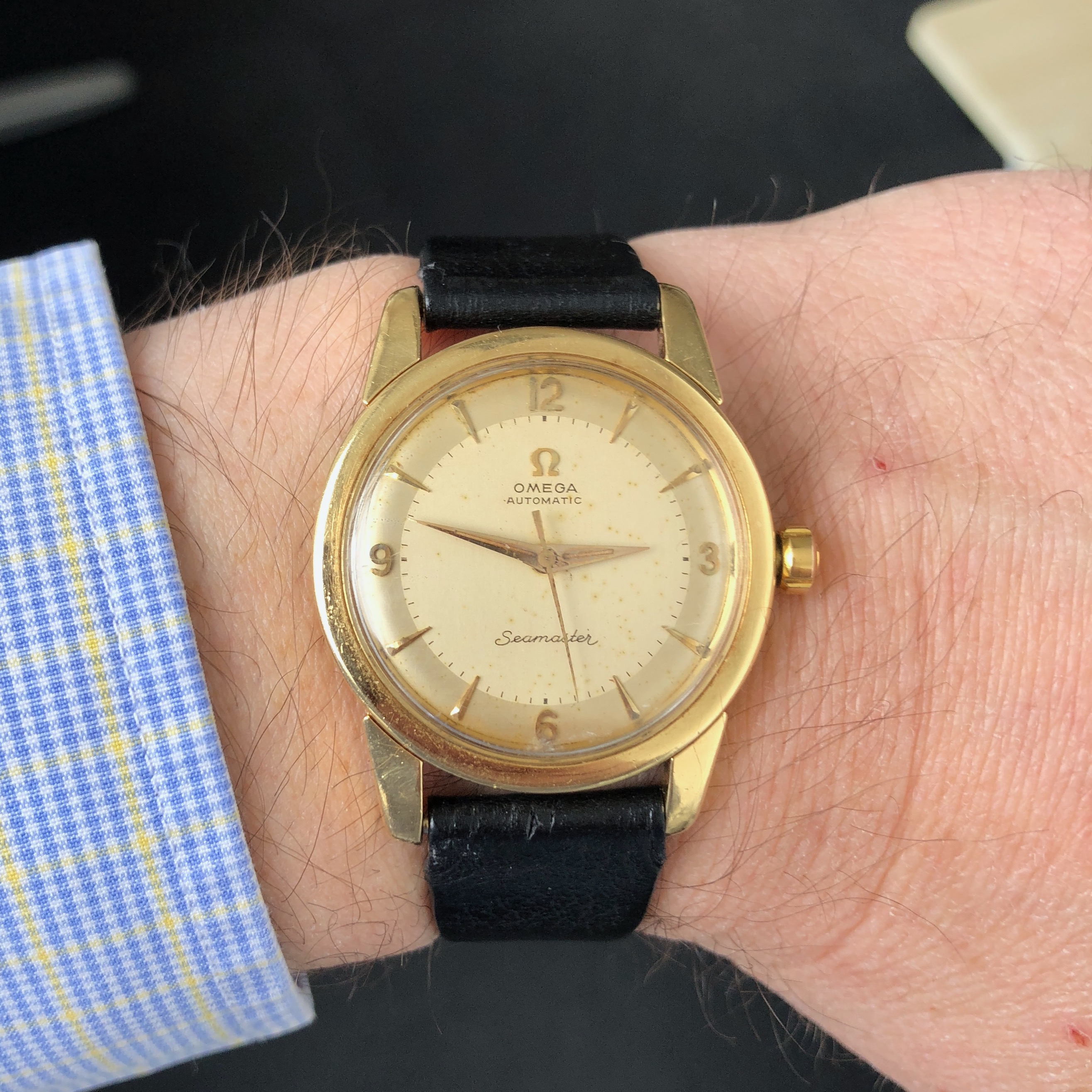 Case is solid 18K and very heavy. Caseback alone weighs about 8g, many gold watch cases weigh not much more than this in total. Purchased from its owner who has cherished it since the early 1960s and was wearing a -69 Speedmaster which he sadly wasn't willing to part with. Anyone got one like it?