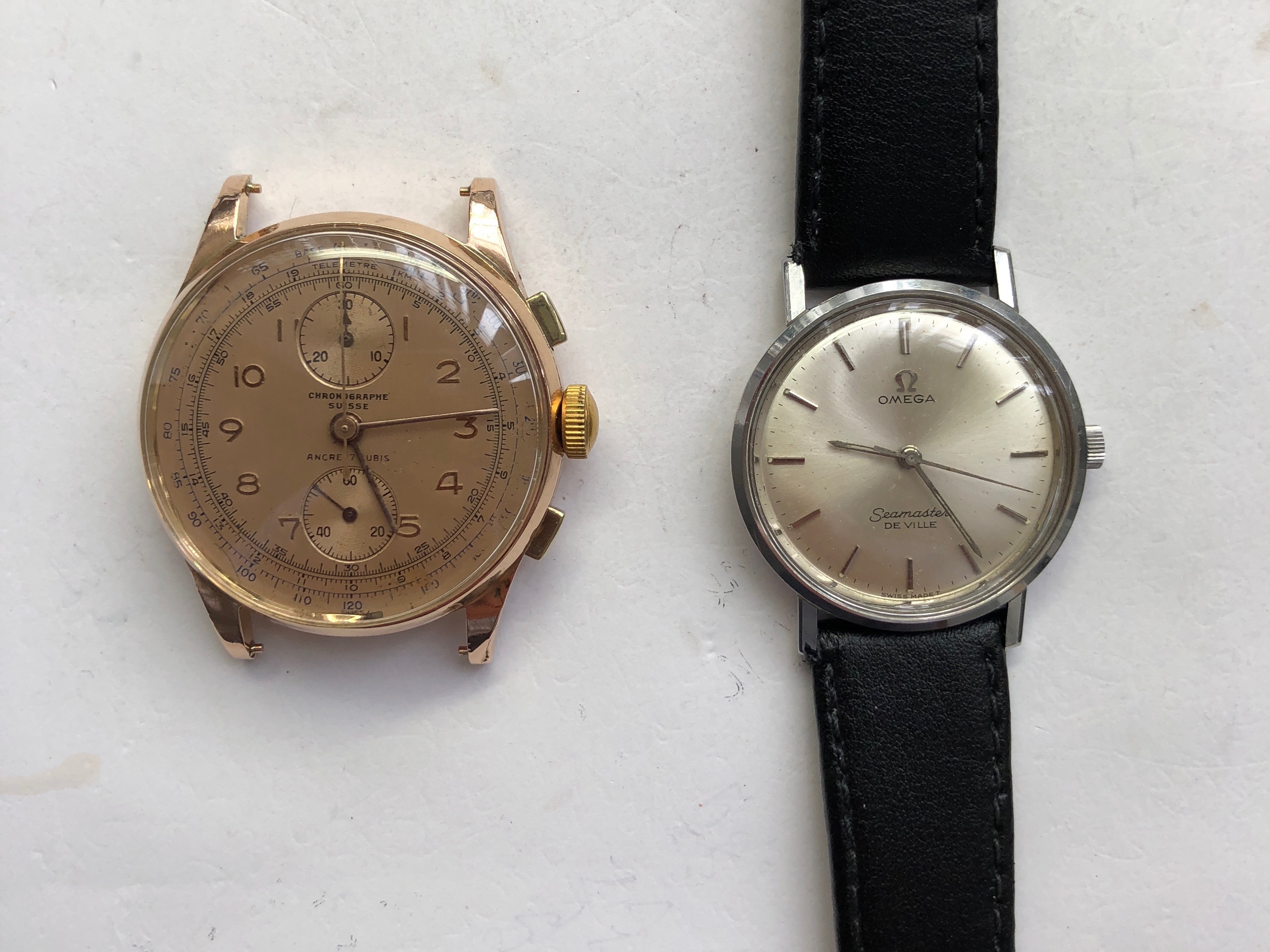 Also a couple back from the repairer too, 50-60s Rose 18K Chronographe Suisse (a good example of a thinner gold case) with the less common NS orientation using the Venus 170 movement (I think) and a 60s mid size 31.5mm manual Seamaster Deville 135.001 with cal 630.