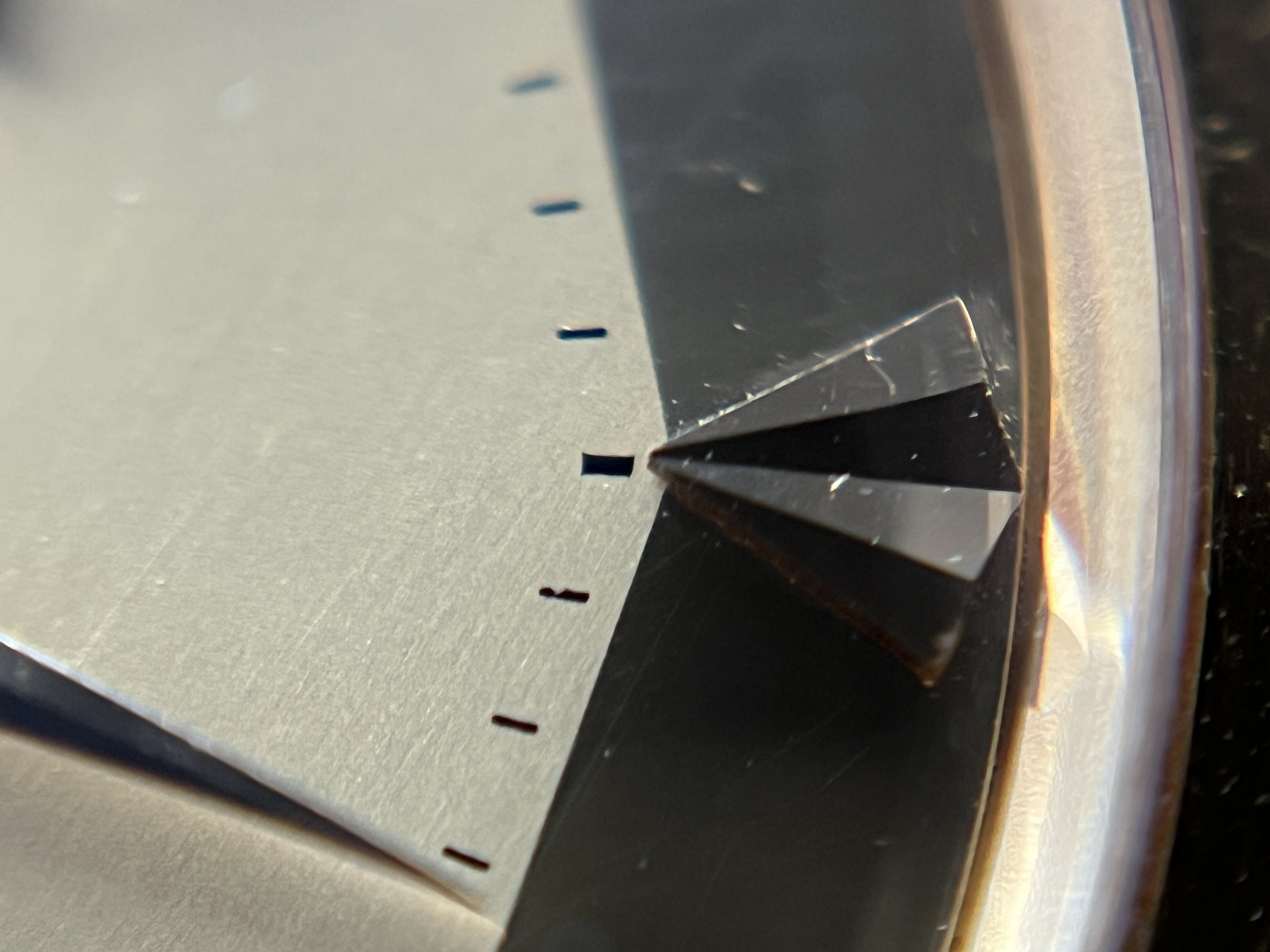 The polished outter ring of the pie-pan dial vs. the brushed center makes a noteworthy difference in appearance. As soon as some light hits the dial, there's just a lot going on and the angles and bevels are highlighted magnificently.