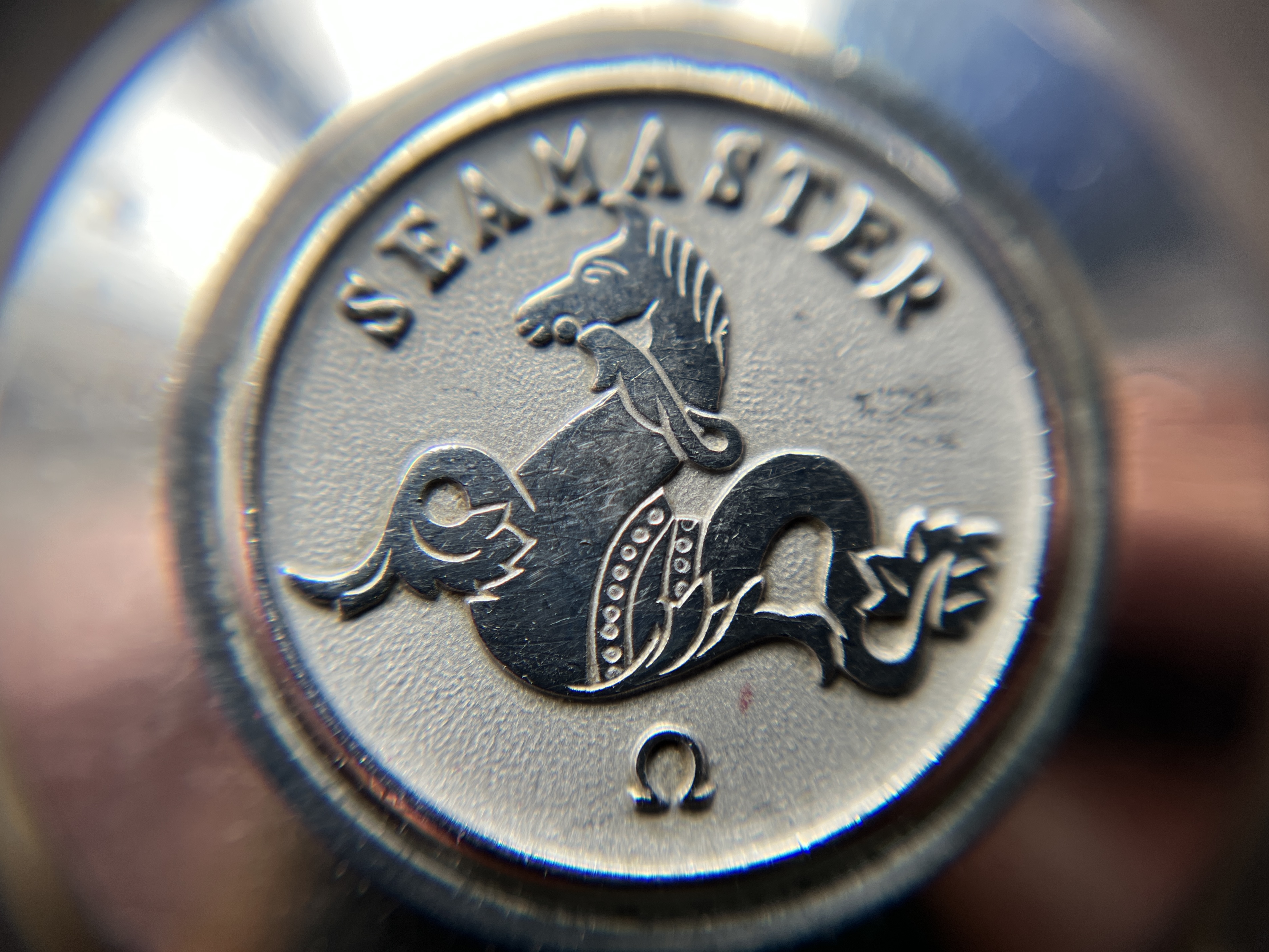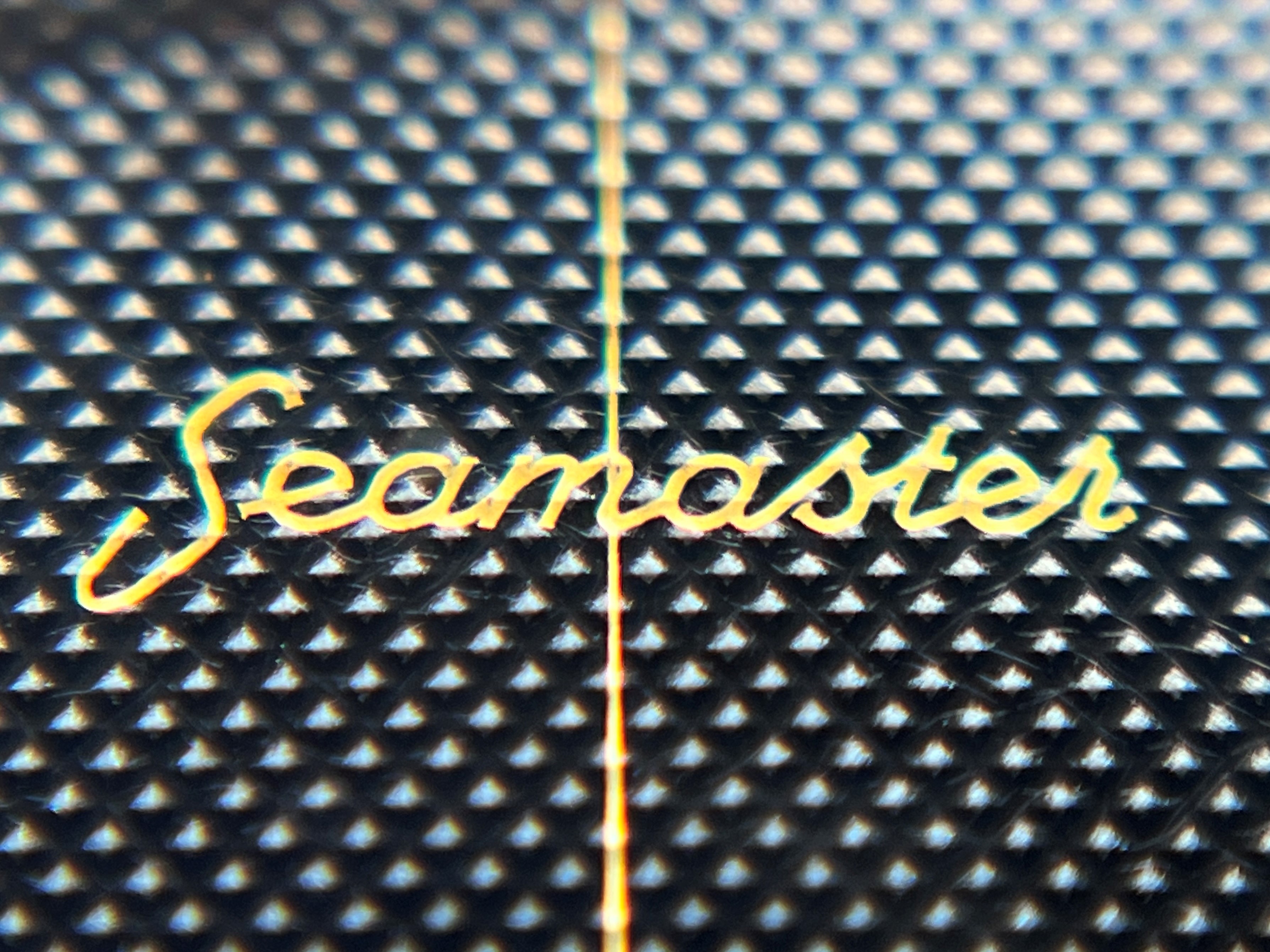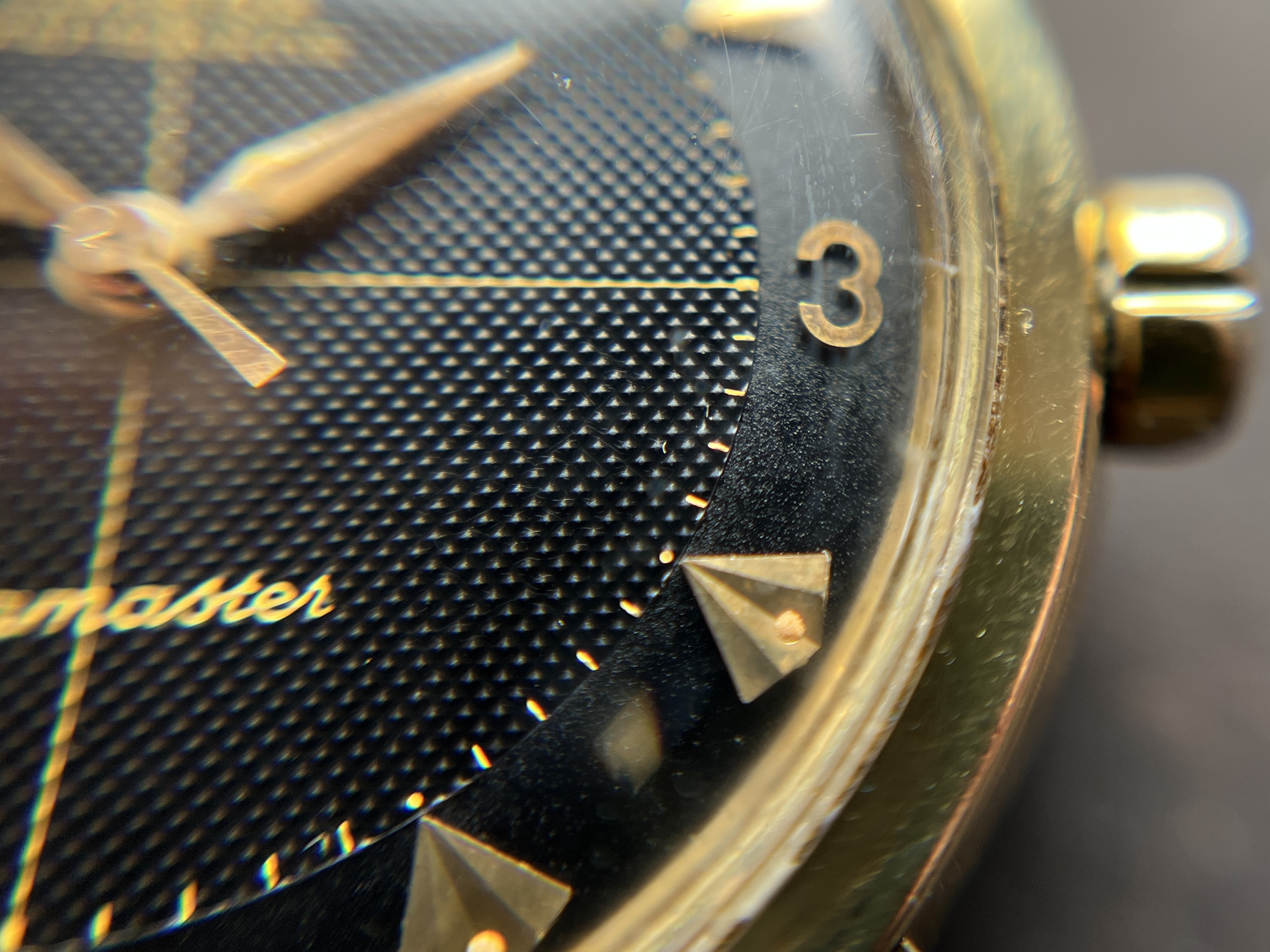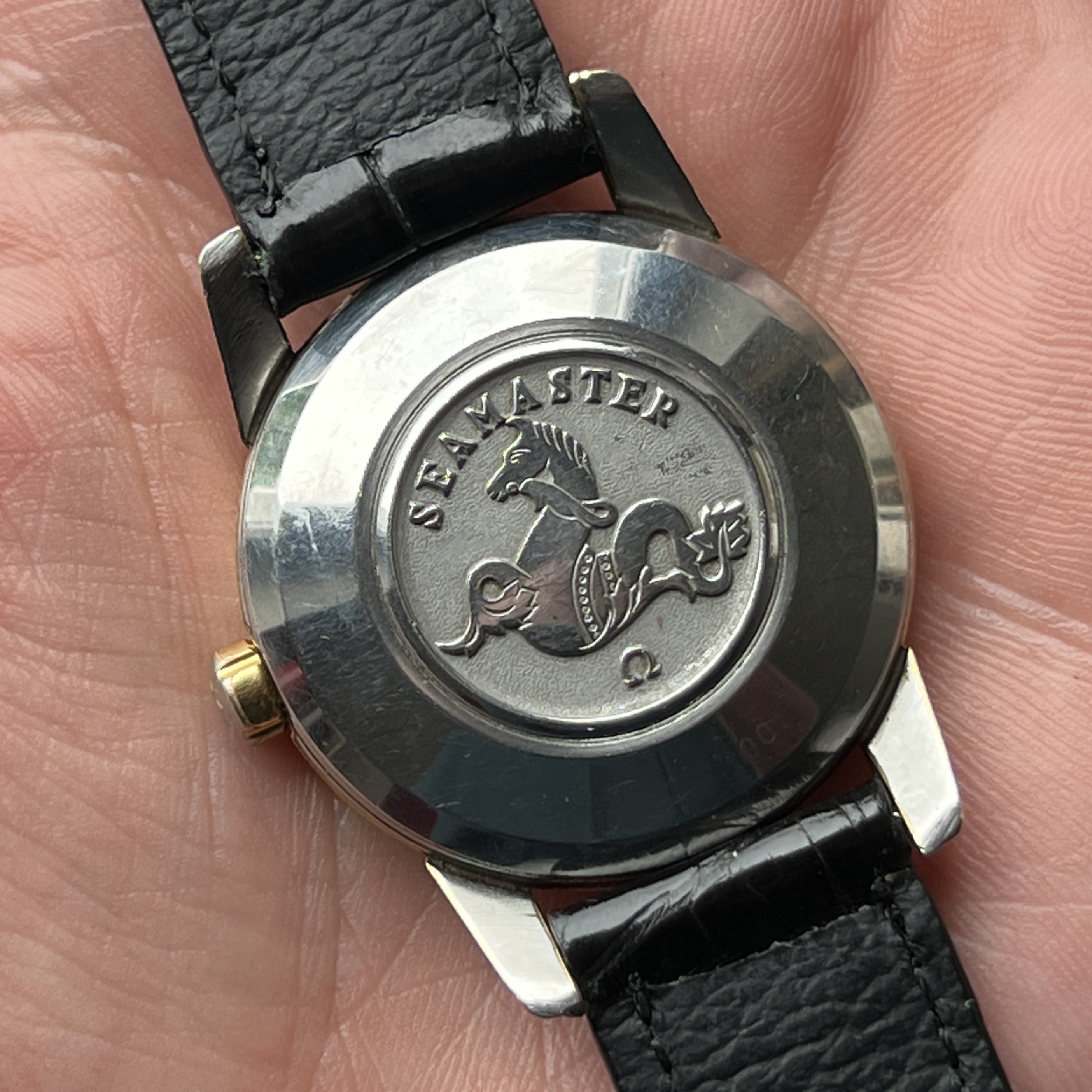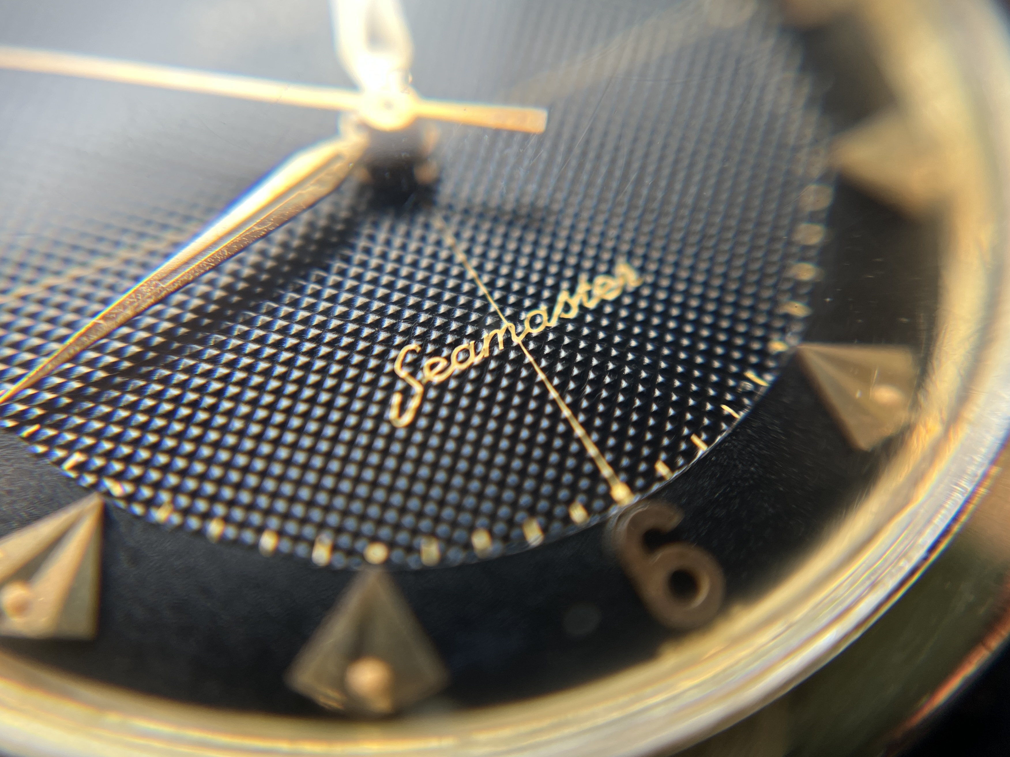 Apologies for a bit of dust on the plexi, black dials always seem to highlight that. Anyway, I'm excited: The auction pics didn't quite show the quality of the dial, but I cannot seem to find any blemishes whatsoever. The arrowhead indices are obviously better known from Constellations of the period, and usually not in combination with 12-3-6-9 numerals and lume plots. I'm aware of a few examples with luminous arrowhead dials on Connies and never quite warmed to them - on this Seamaster, though, with the numerals creating a slightly more "busy" impression anyway, I find them... cute. 😀