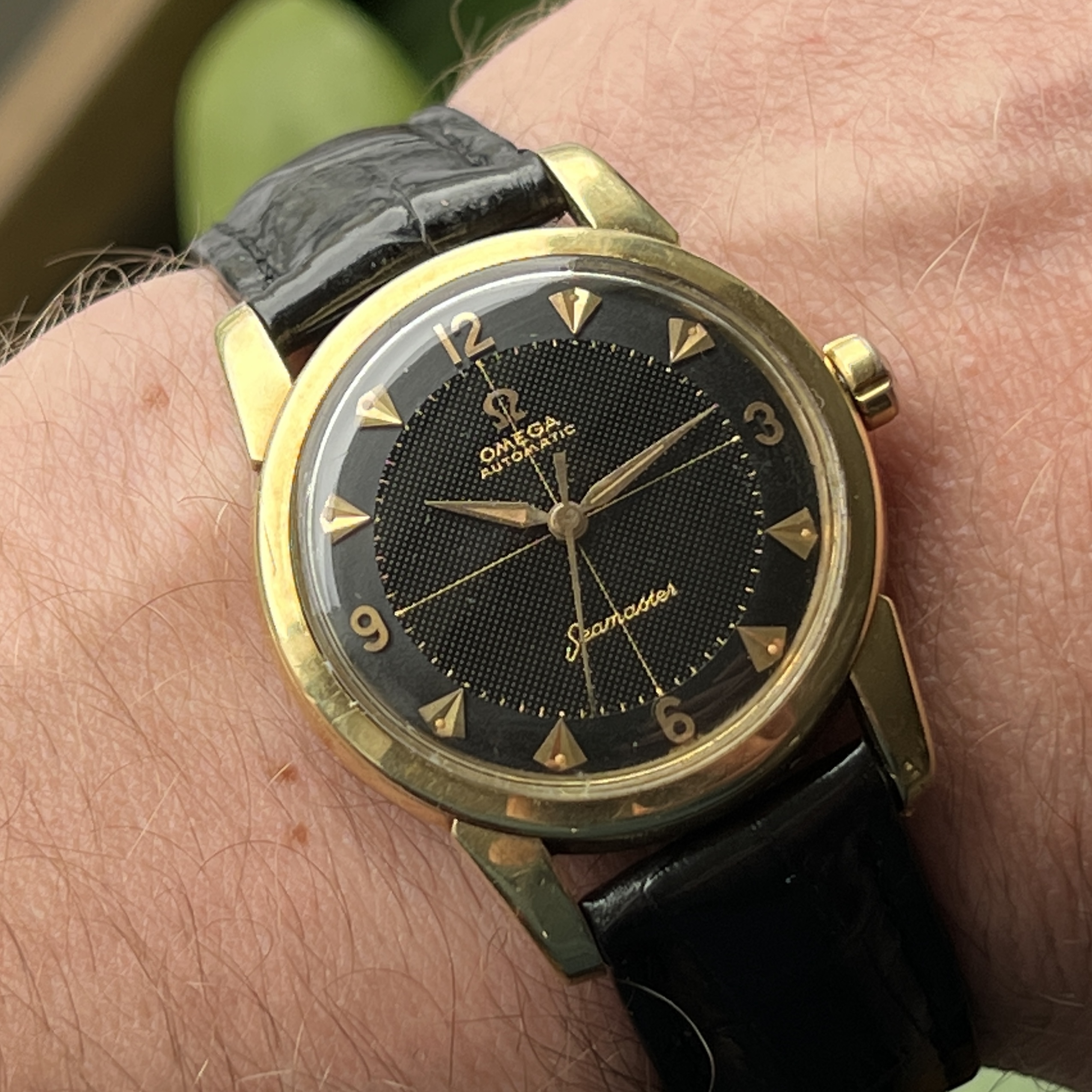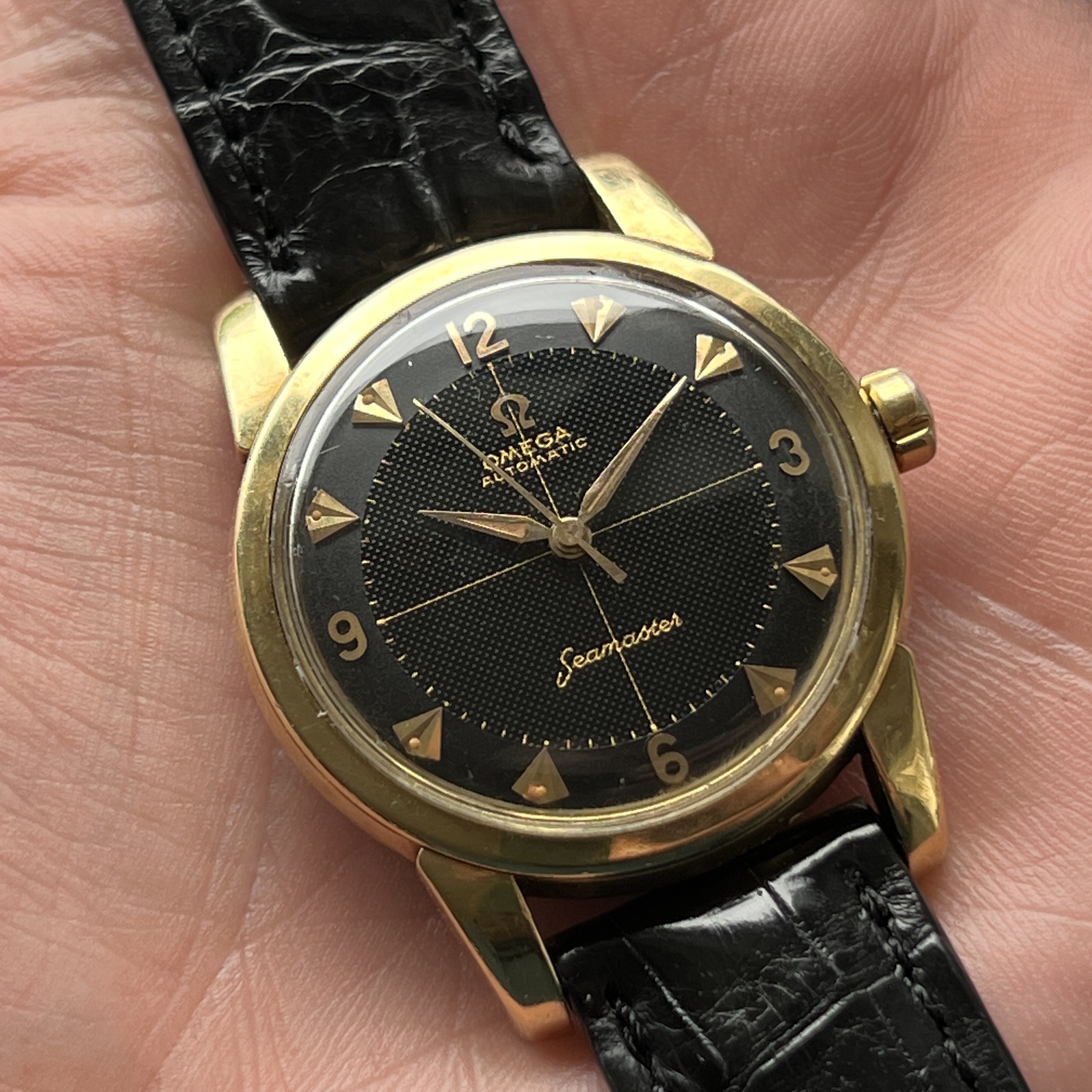there's a new arrival to my flock and I figured it might be worth sharing, as this specific configuration isn't seen too often. Meet a ca. 1958 Seamaster ref. 2846 with a black "half waffle" dial and arrowhead indices: