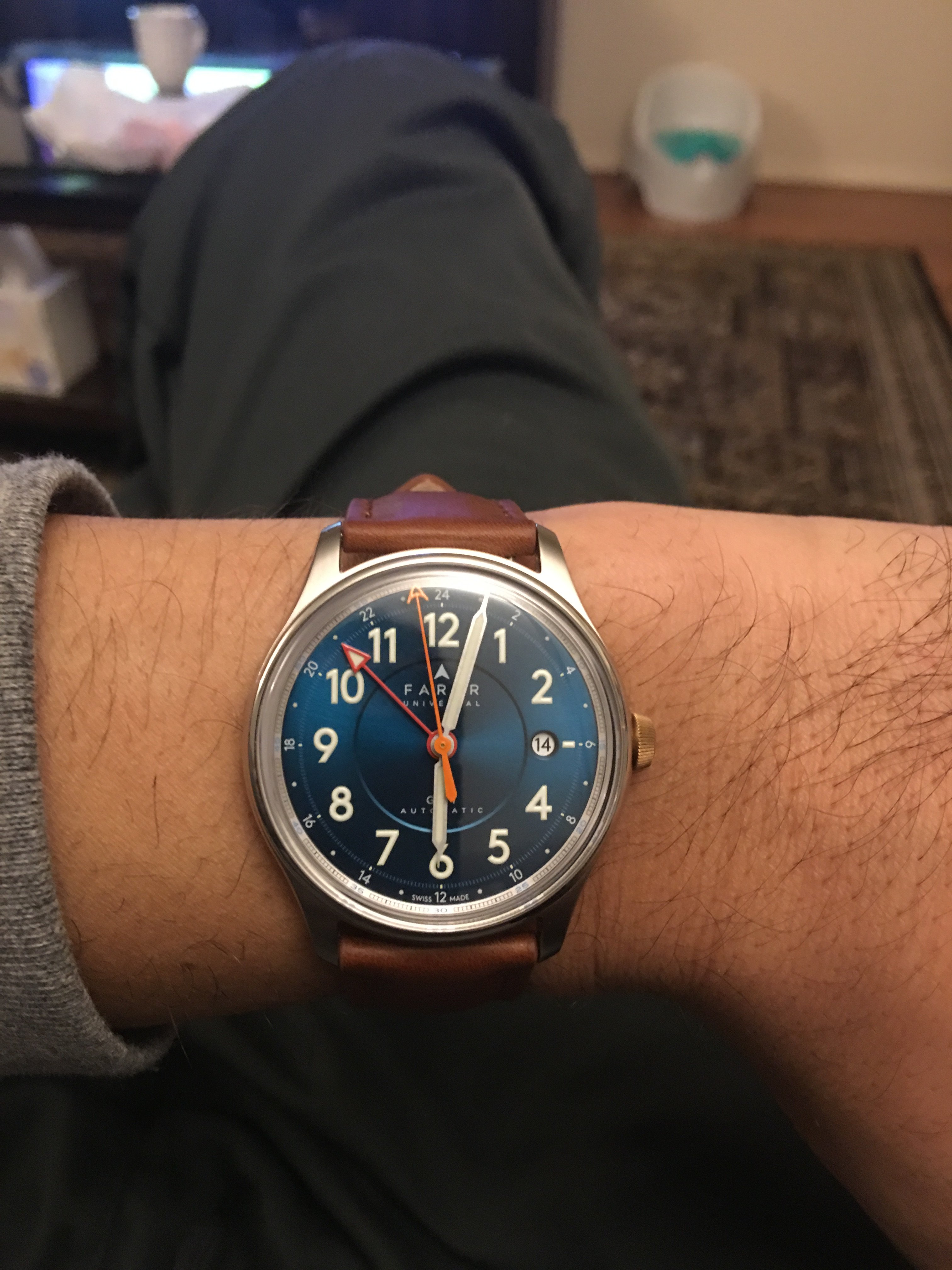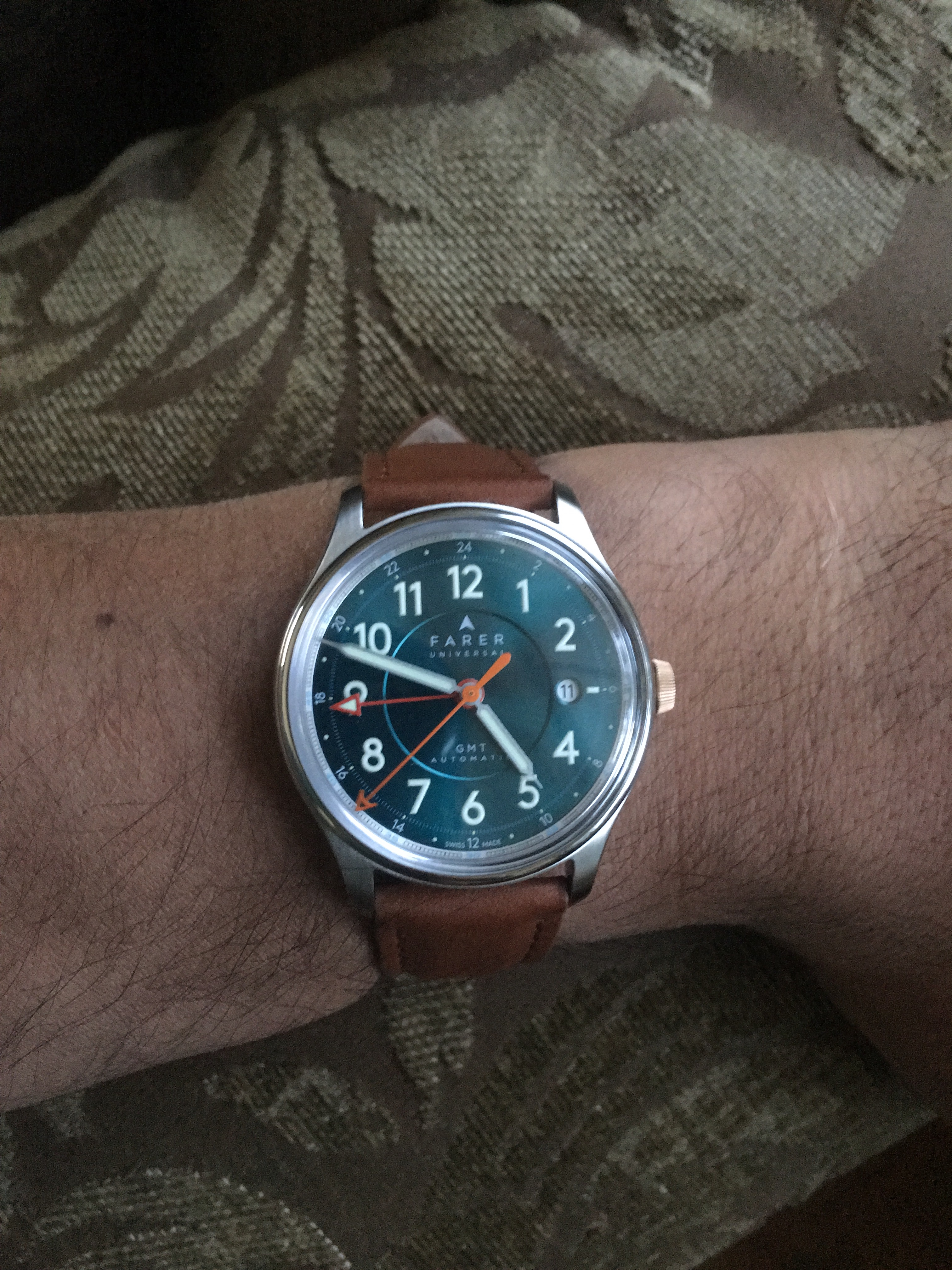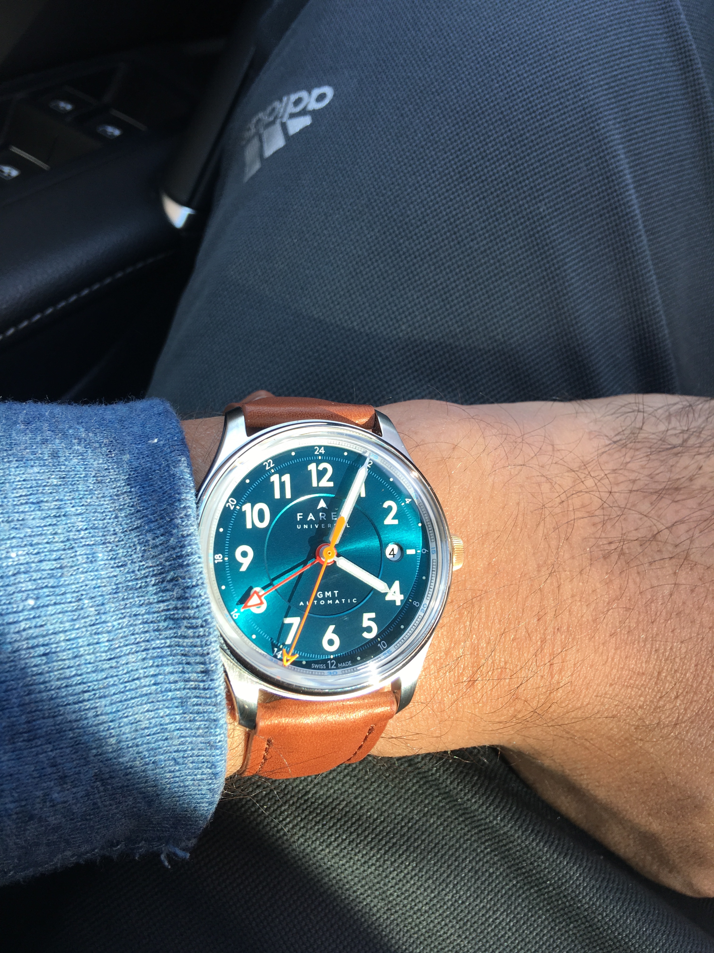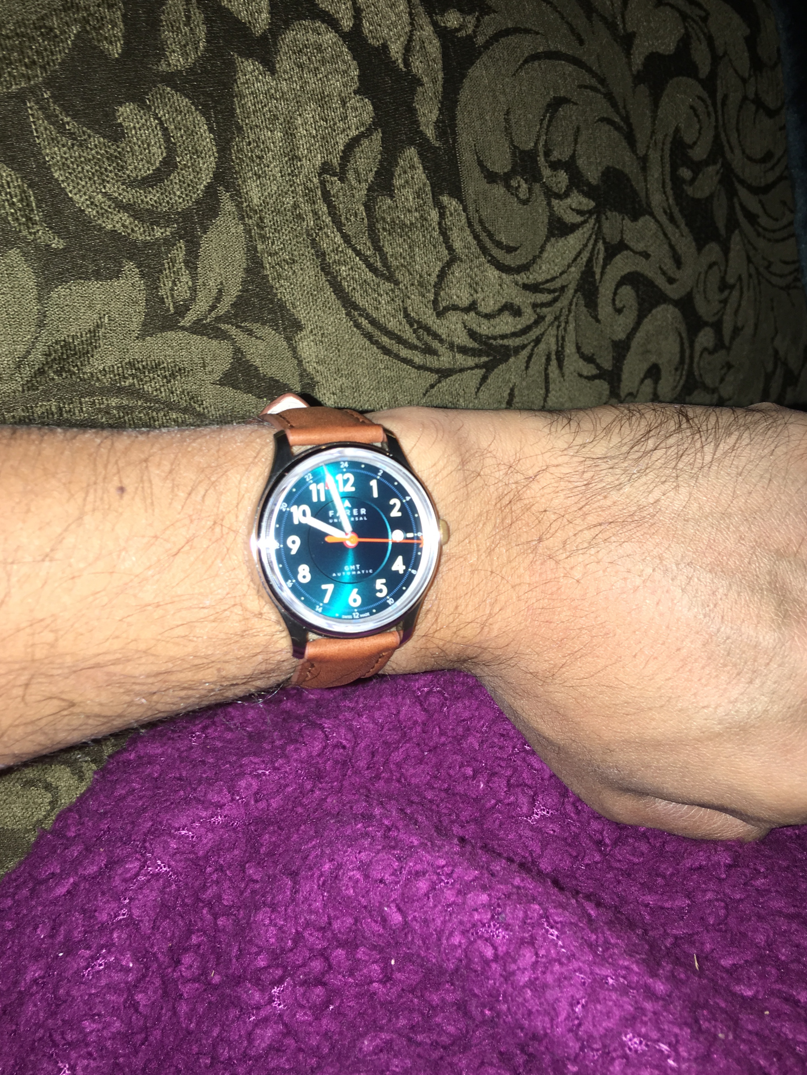 ·mine just came in the mail (got it used). What a gorgeous watch. Honestly this watch is more impressive in person than my speedy *gasp! I think the speedy cant be represented well in pics. This farer's details and color cant be repped in pics as well although farer does an excellent job doing so. That 3 step dial, that seagreen color, the patina on the crown, the colors of the hands, crystal, movement design, packaging...my gosh everything is impressive on this watch in the visual department. Such a unique watch that is going to look great on my casual outings. I still need to find a strap that works with this color combo. Thinking a lighter tan strap will be the best fit but not sure yet. My blue nato isnt working out too well and im not too keen on the darker stock strap.