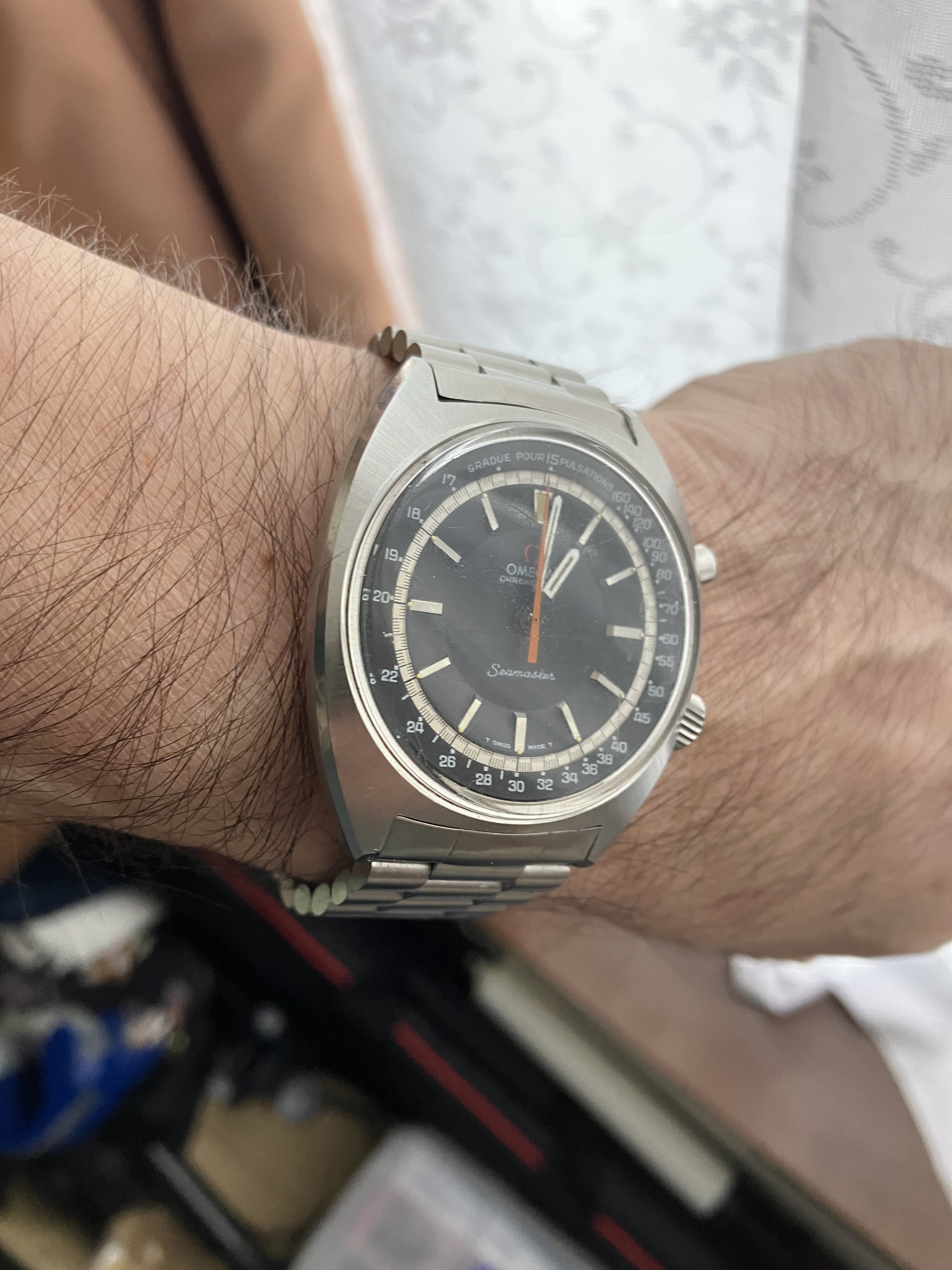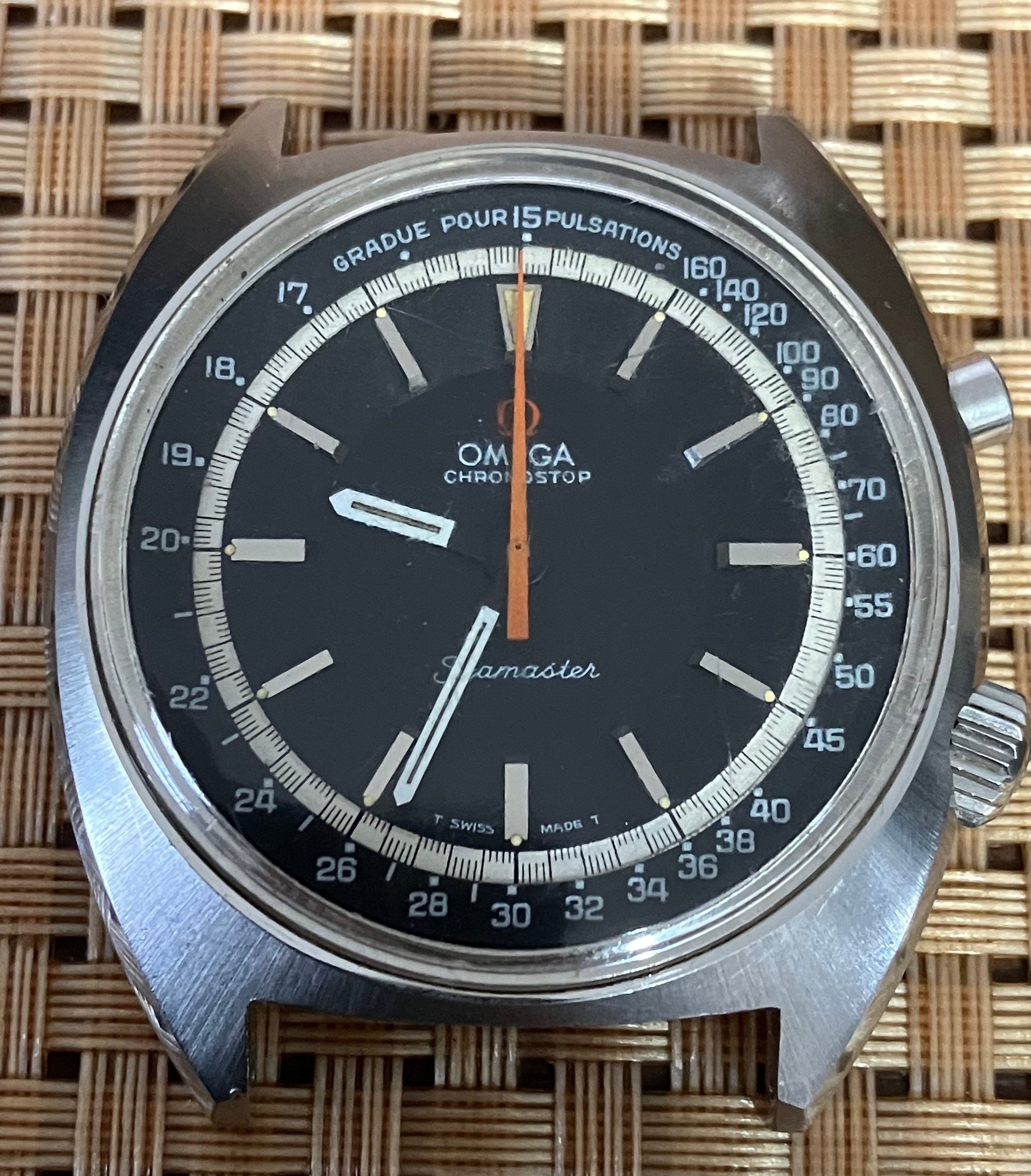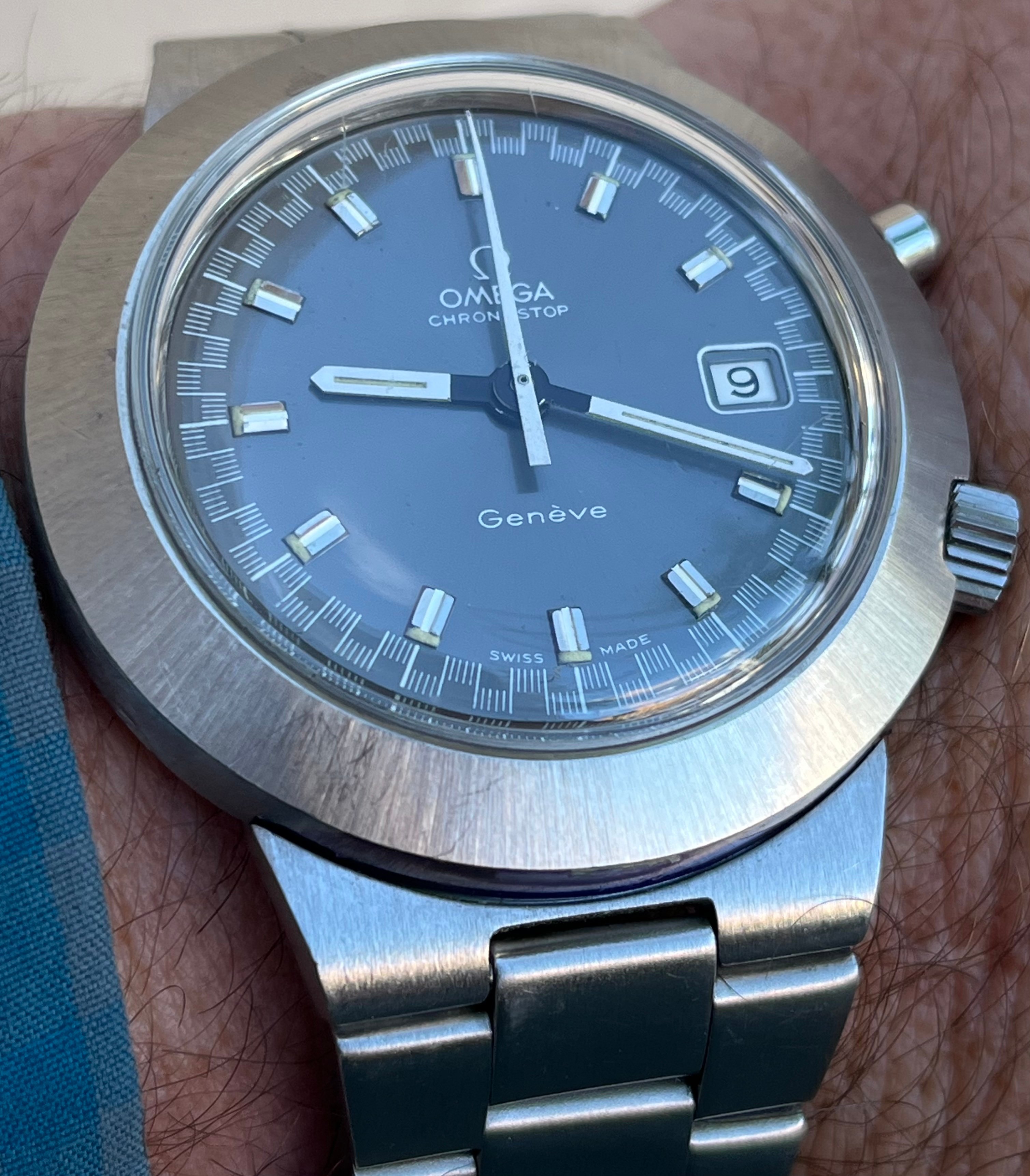 ·I recently sold my Chronostop Genève and started wishing I had kept it, so I impulsively grabbed a bigger Seamaster version with a pulsations ring on a 1170 bracelet. I really enjoyed wearing it for a couple of days and checking my pulse at random intervals (probably healthy, definitely alive—I am not a doctor), although the bracelet is a pitiless arm hair puller. Unusually for Japan, the bracelet has a lot of play, beyond even my comfort level of loose dangly watches (roughly, 1970s porn director). It’s the most massive-wearing watch I’ve ever had, with 22mm lugs.
