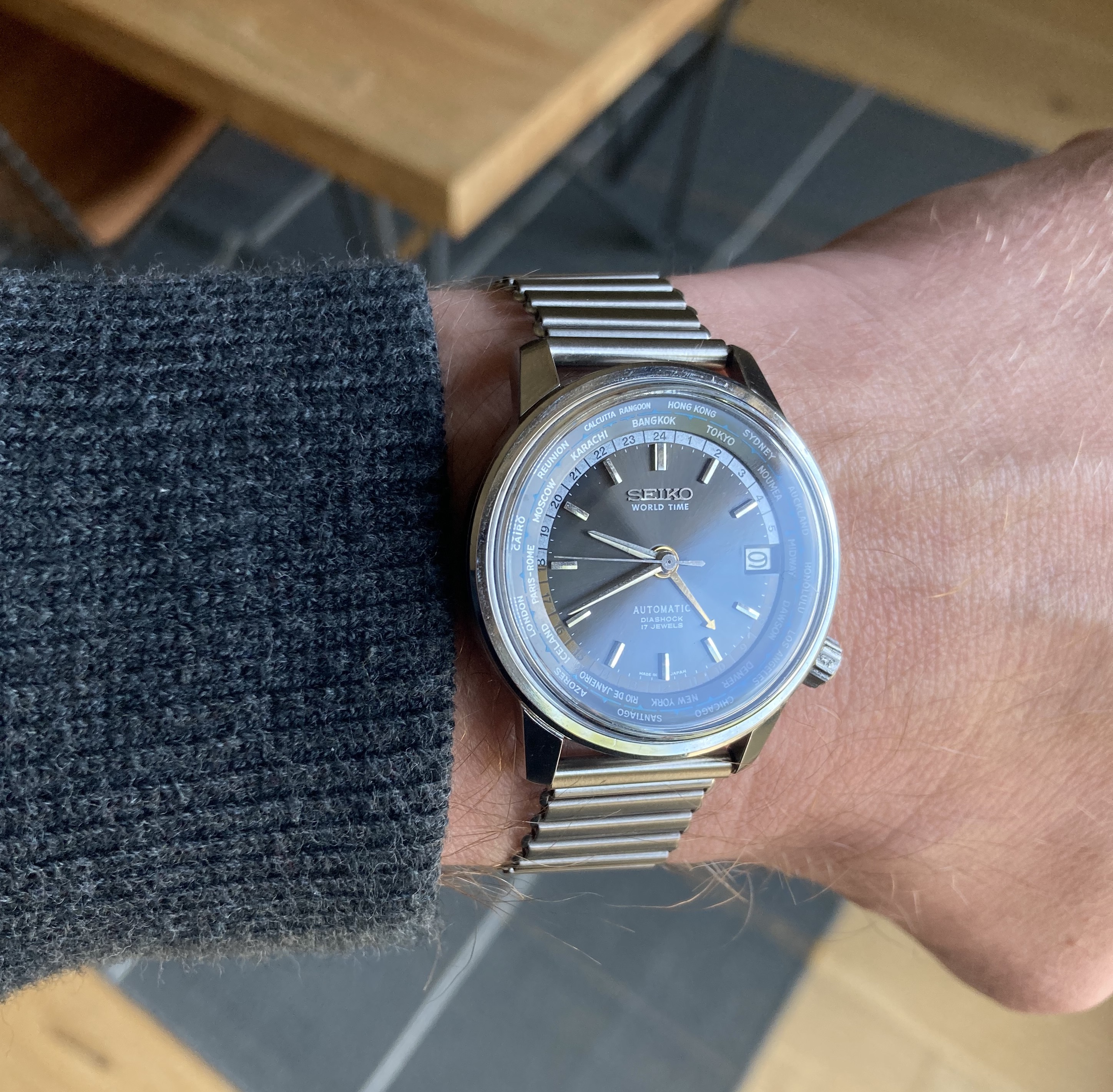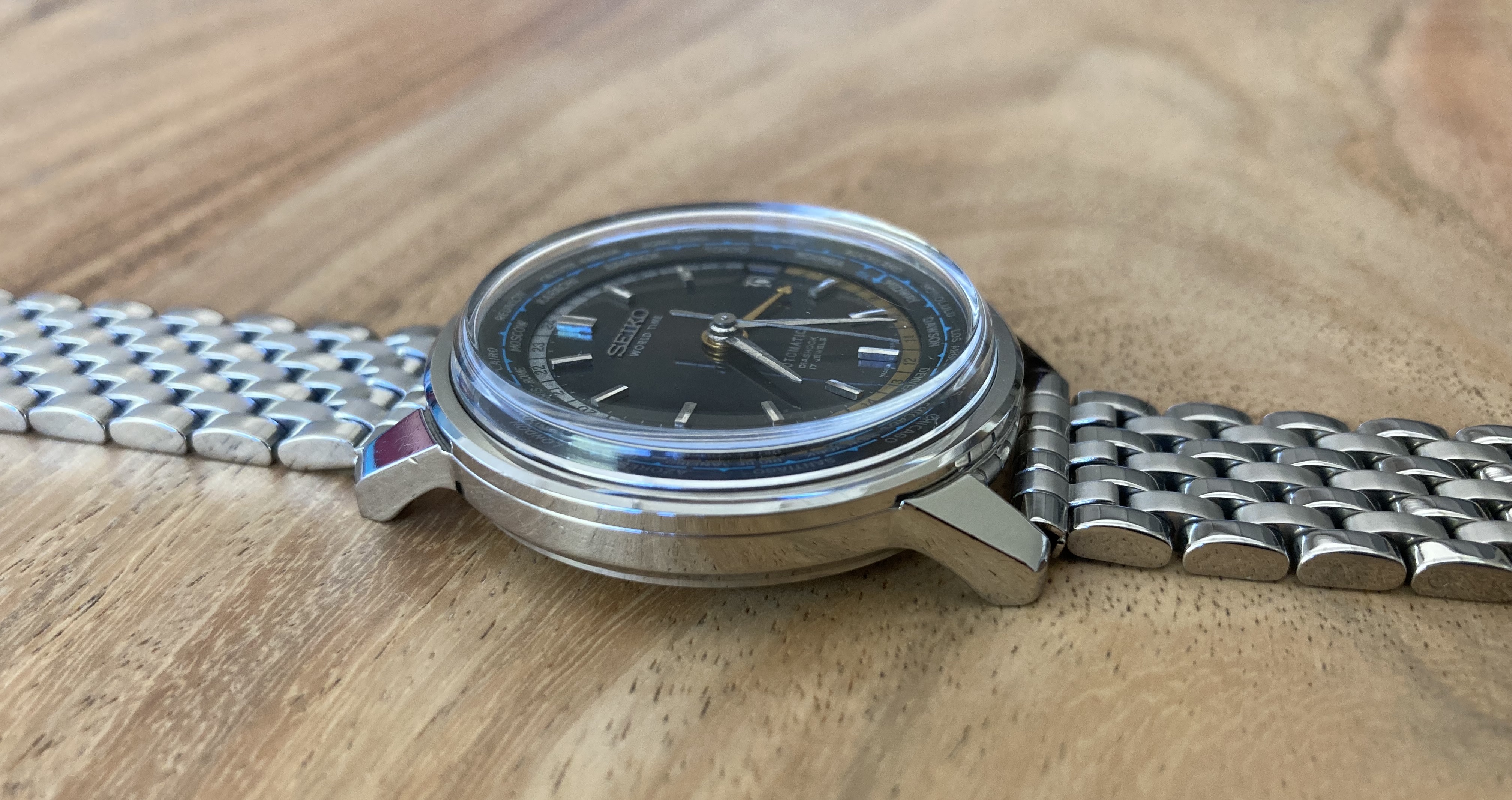 The auction photos showed a nice dial, but I was unsure of the case condition. It turns out to be in pretty good shape, with well-defined edges. The inner bezel ring rotates as it should, which is a handy little feature. The Olympic torch etching on the case back is still visible but pretty worn down, which appears to be common.