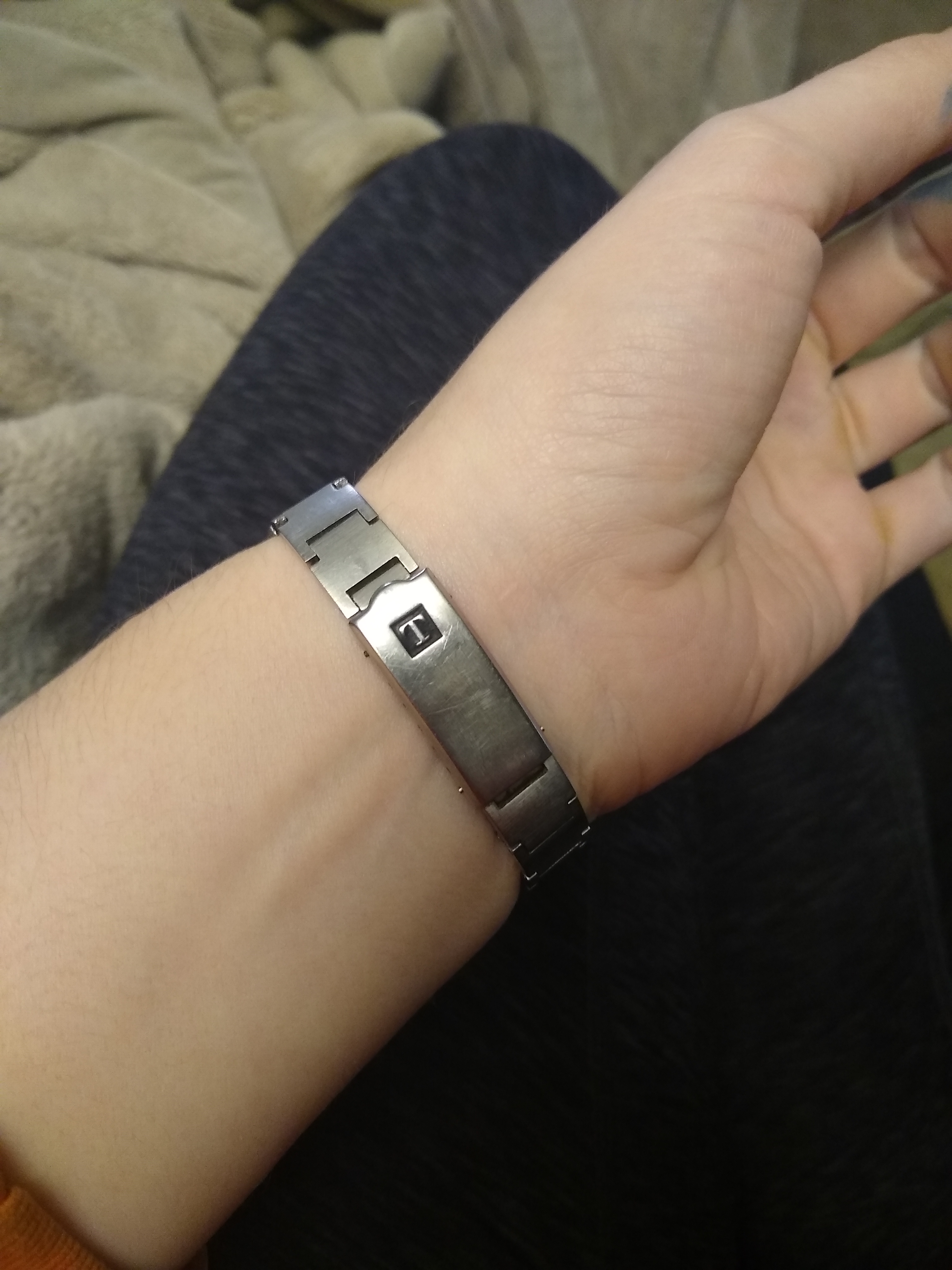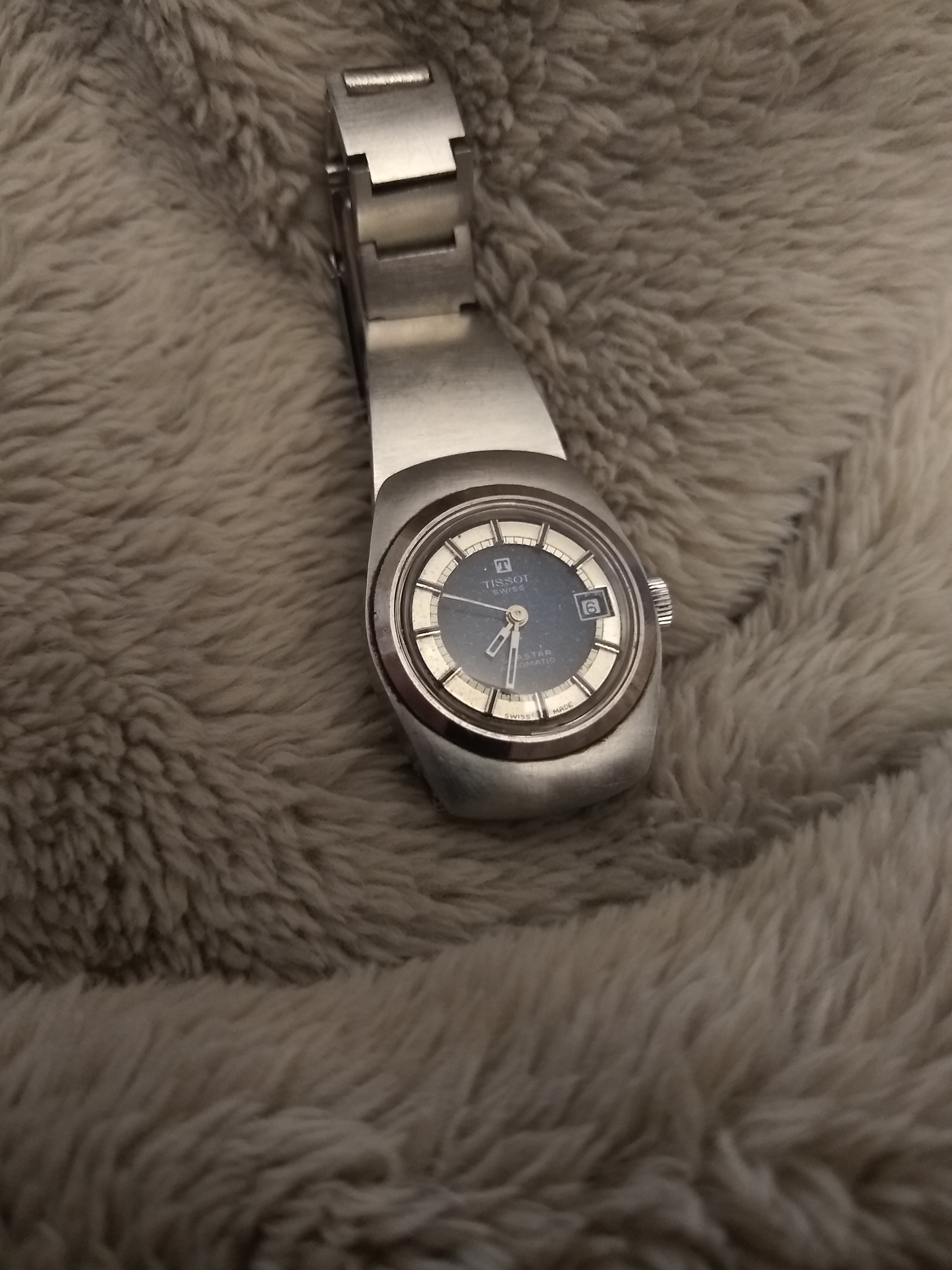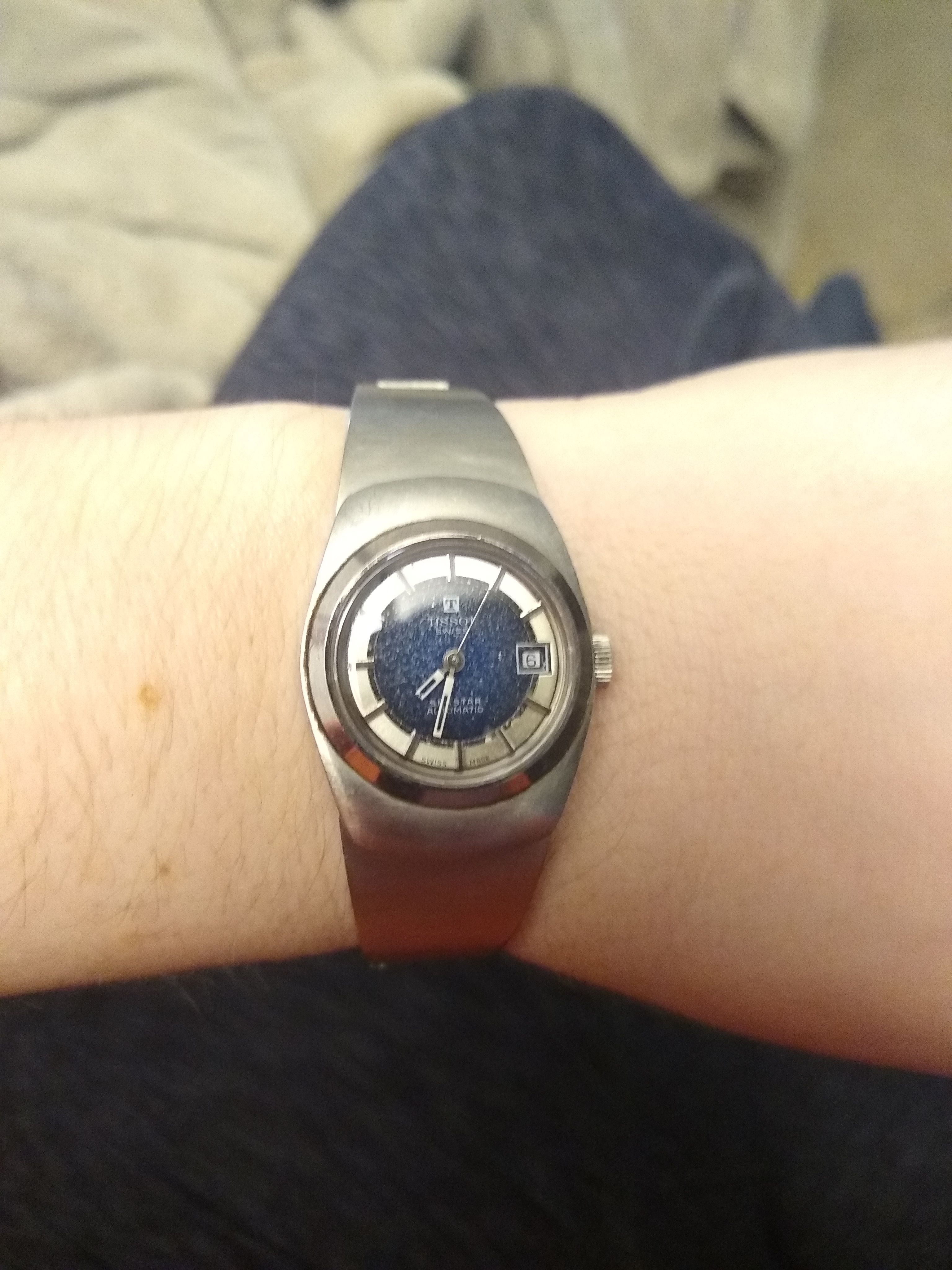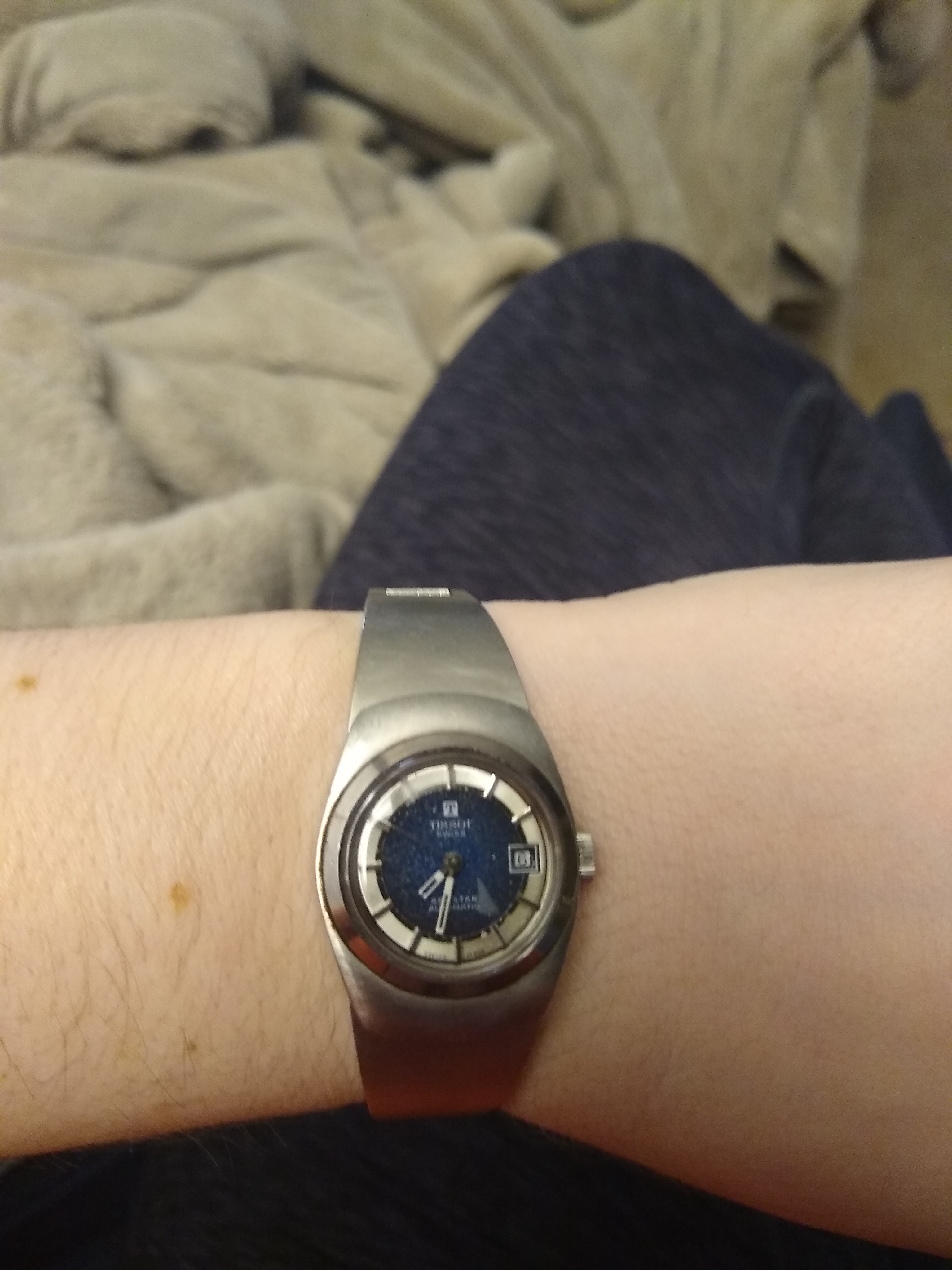 The photos don't do the dial justice, it's honestly the first time I've considered dial damage an asset. The brass shows through in a way that gives it a sparkle effect that I fell in love with. The bracelet is a signed Tissot lobster bracelet made of solid steel links. Unfortunately, the seller and I have different ideas of what a 6.5" wrist is, so it's just a hair tight