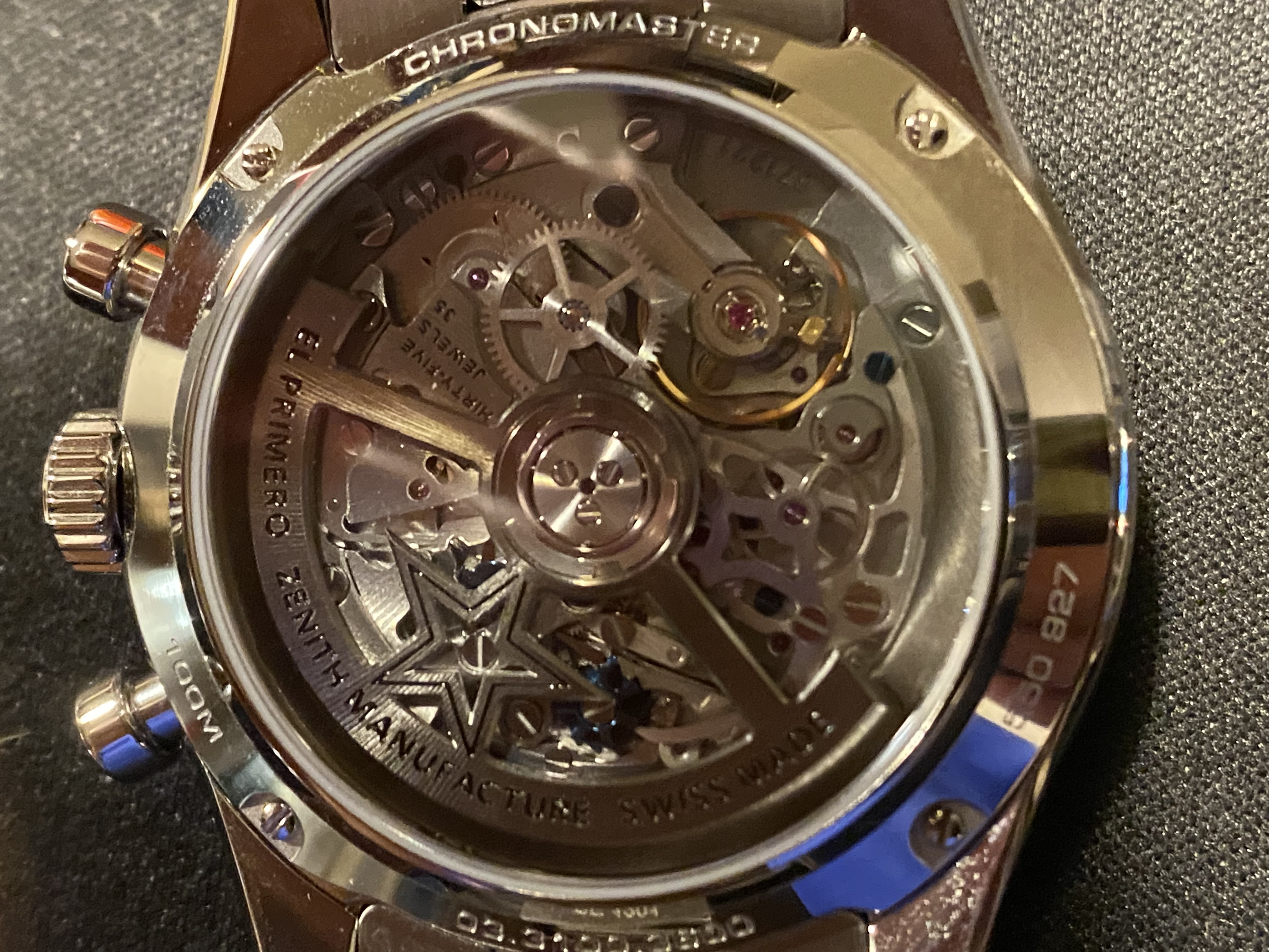 It incorporates the latest generation of the El Primero "Striking 10th" movement, the 3600 Caliber, which was released in 2019. Although utilized in limited edition pieces, this is the first time Zenith has used it in a regular production model. This high frequency mechanism beats at 36,000 vph (5 Hz) and offers 60 hours of power reserve. Despite this being a sport chronograph, Zenith was not shy about showing off their latest accomplishment by providing us with an awesome view of the engine room: