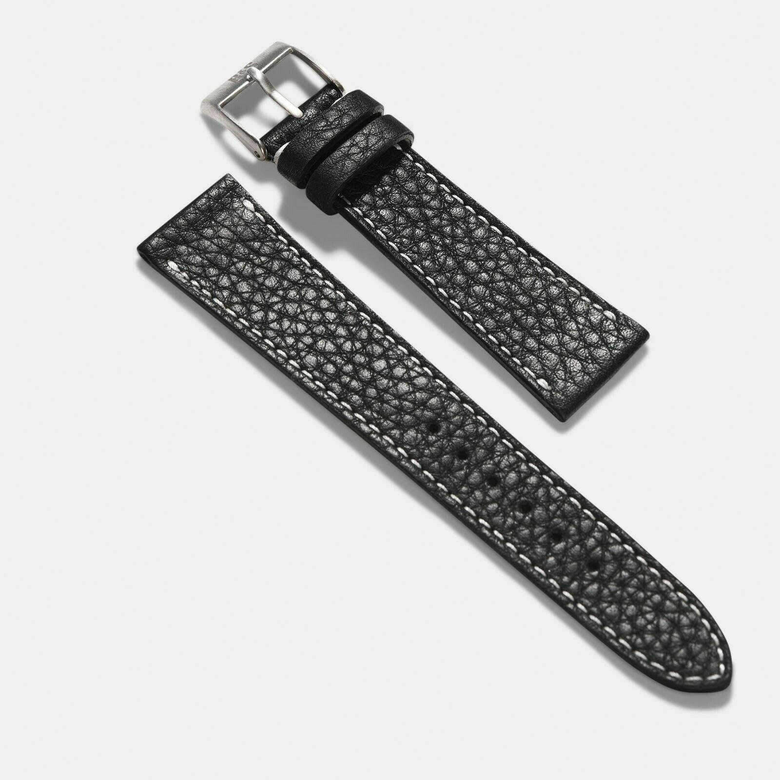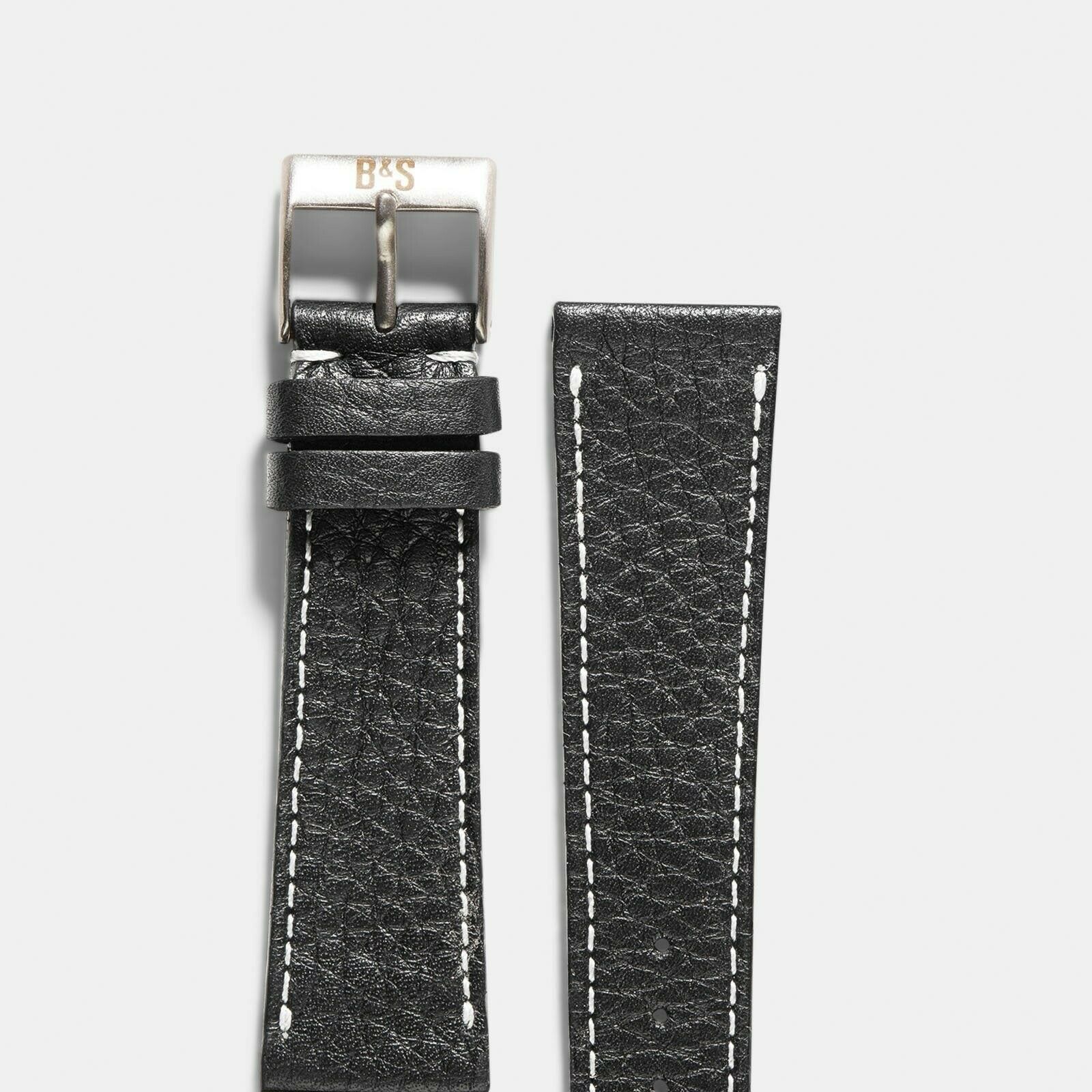 With a deep tone and a glistening creasy surface, this leather watch strap carries character and self-confidence in numbers, further enhanced by the angular white box stitch.