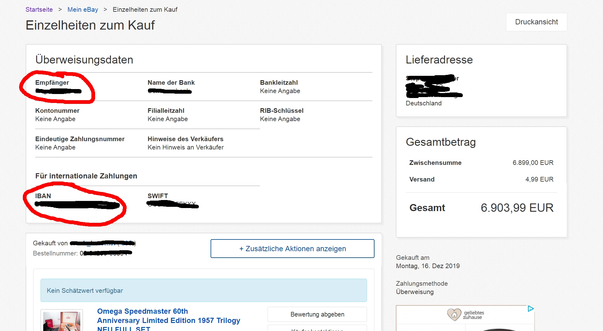 ·I try to explain how it worked: The scammer bought the watch with BUY IT NOW Option. After that he received the following information from ebay with my Name and bank details: