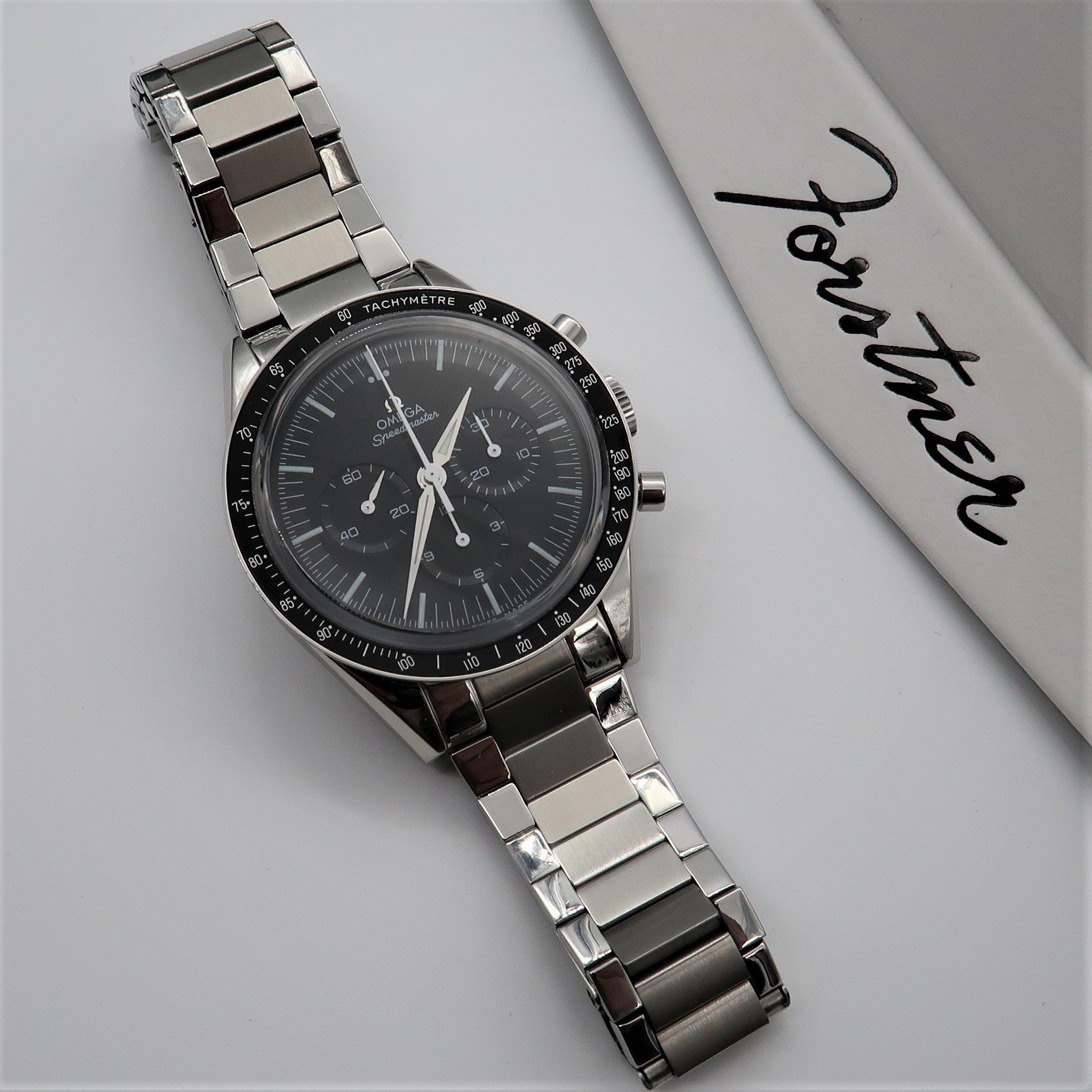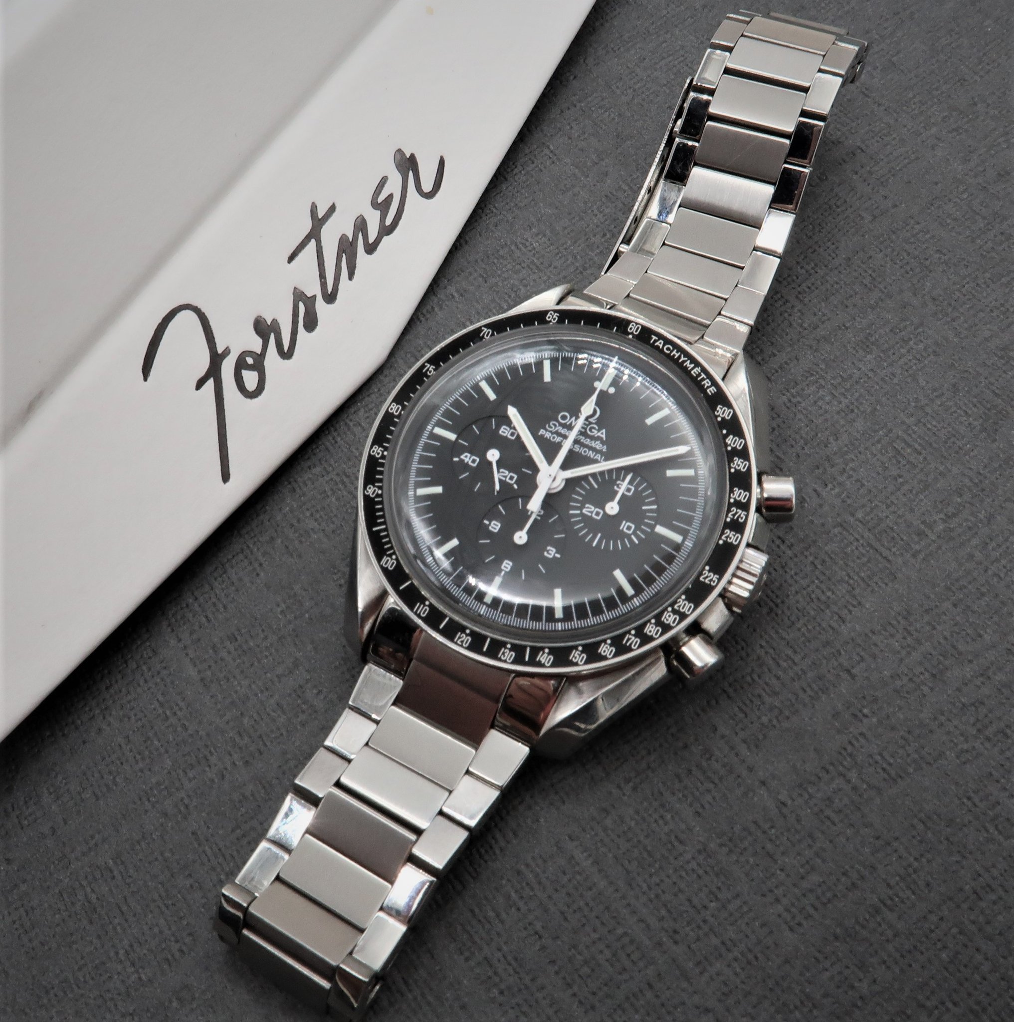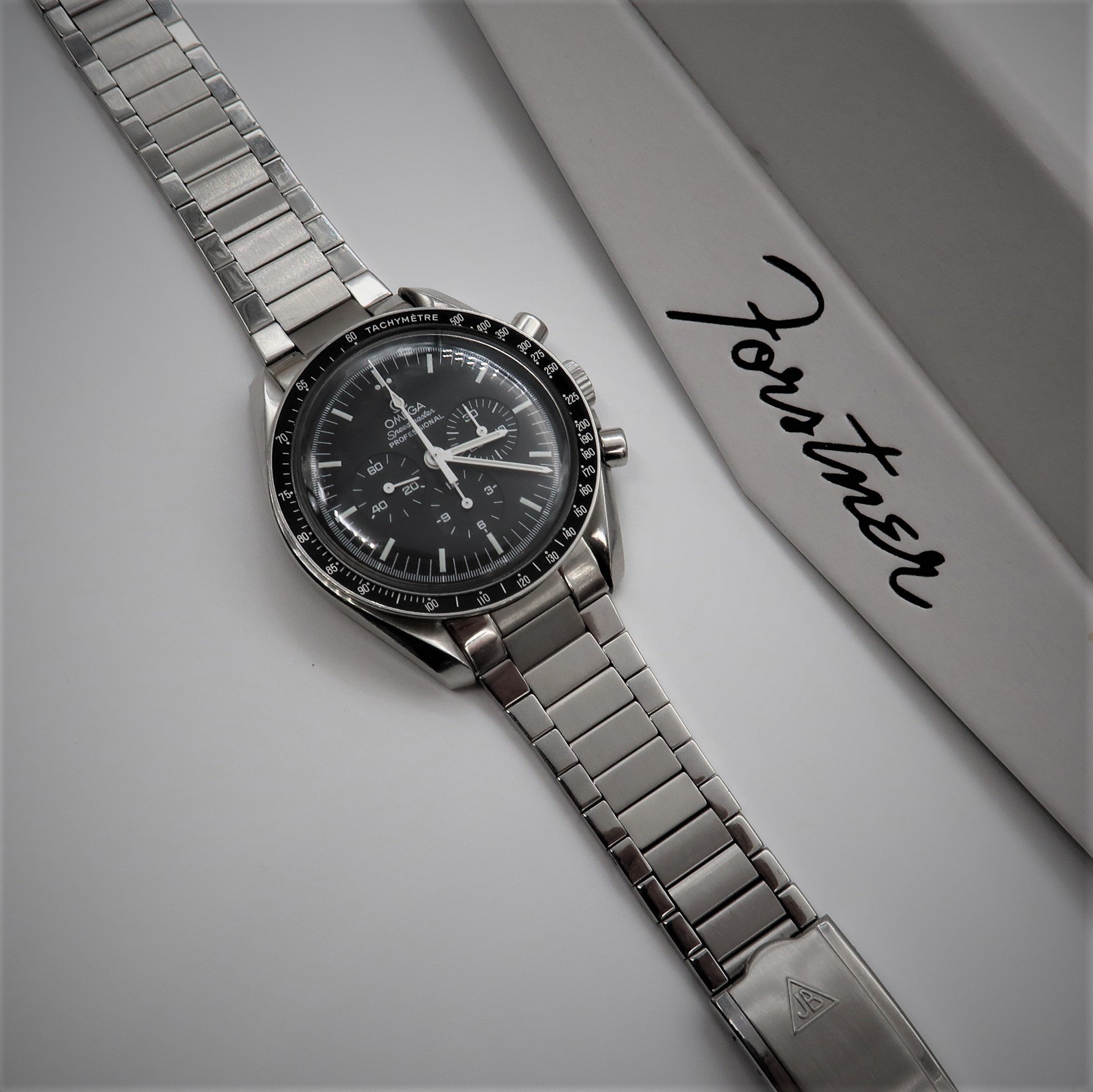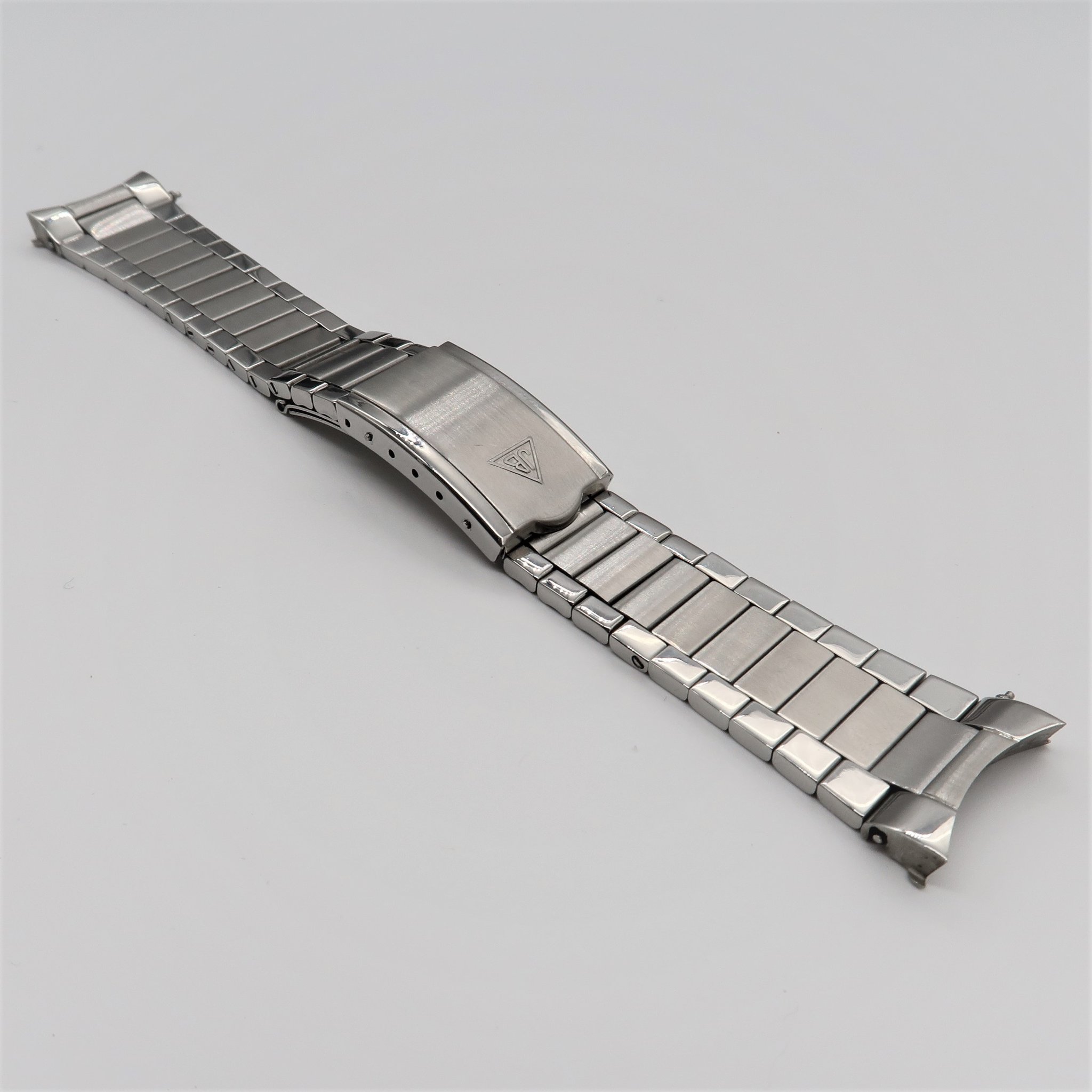 The Forstner flat link bracelet is designed for the Speedmaster Professional case (with its 20mm lug width) and the First Omega in Space case (with its 19mm lug width). The bracelet links are solid stainless steel, including the end piece (to provide a more flush fit to the case), unlike the vintage versions which had hollow links and end pieces.