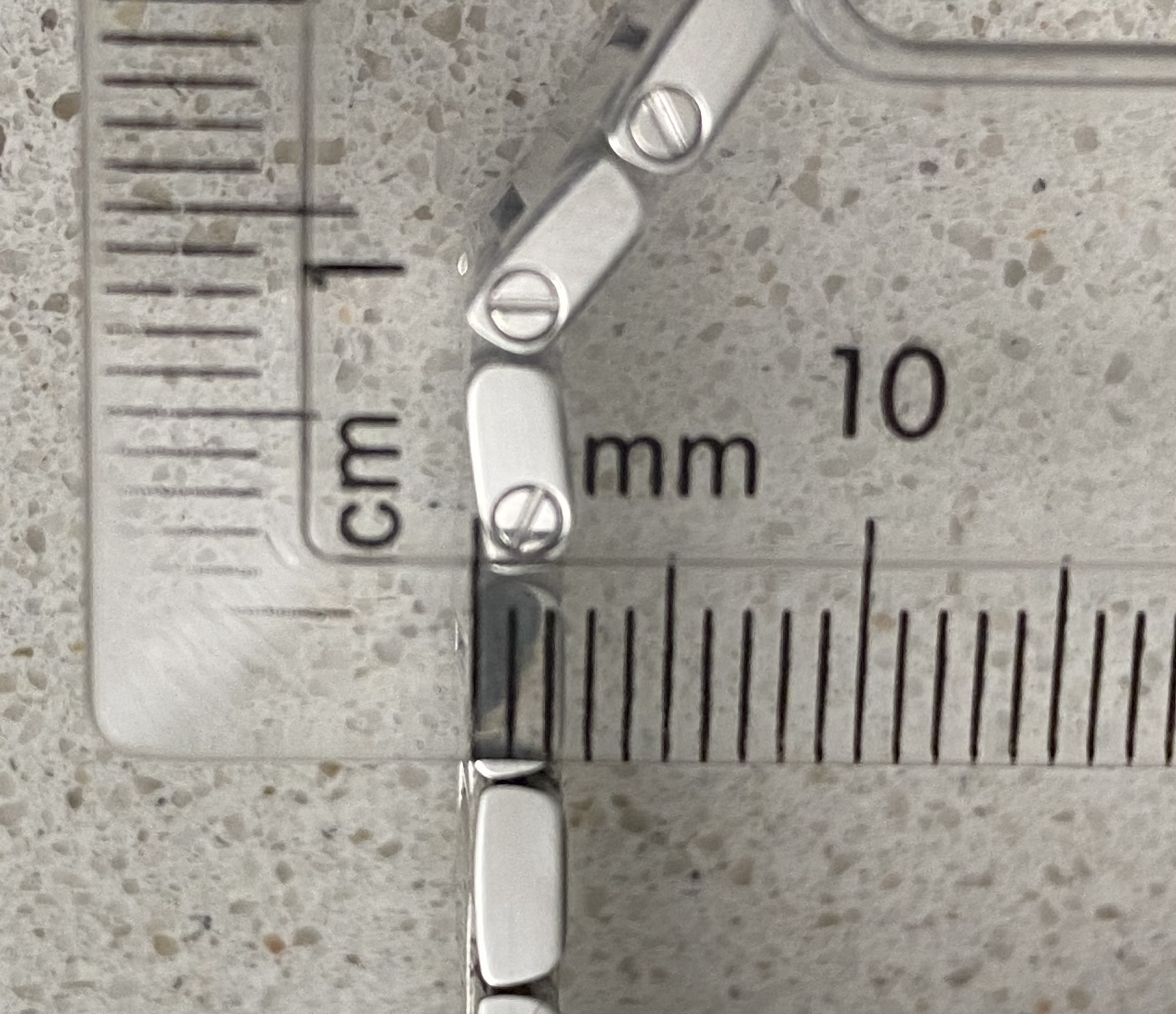 Confirmed it’s about 2mm, perhaps a hair over 2mm. See pic of my Apollo 11 bracelet below. Unfortunately I don’t have a caliper so this is the best I can do.