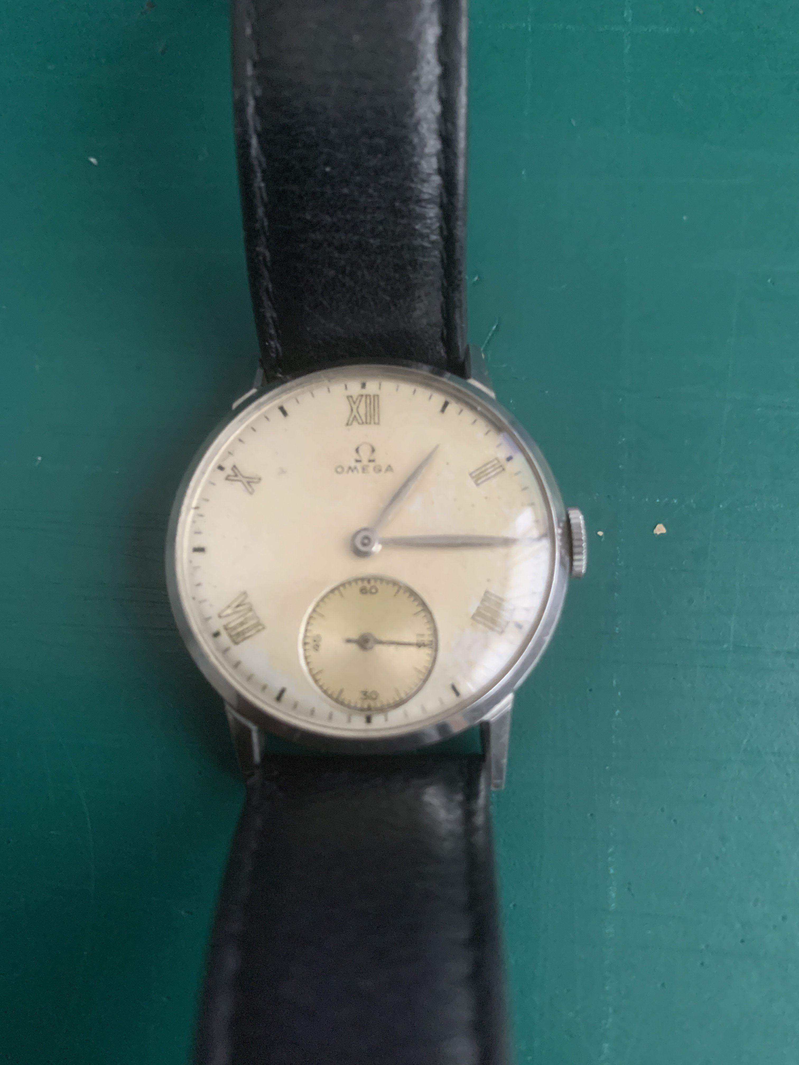 You have a Gents Omega Watch, reference 2214 which was introduced an about 1940. Your movement is a caliber 30T2 PC AM, which was introduced in 1941.