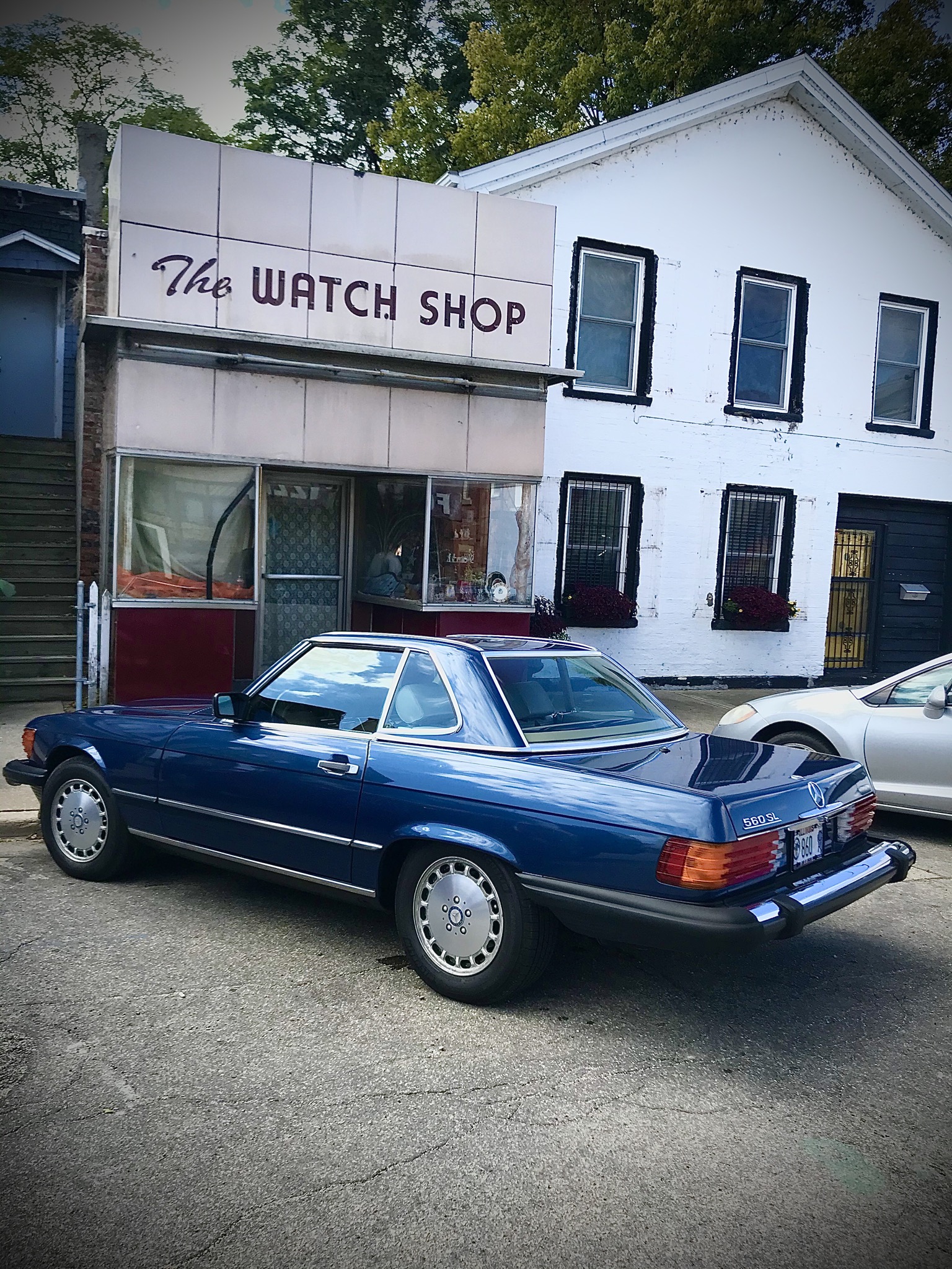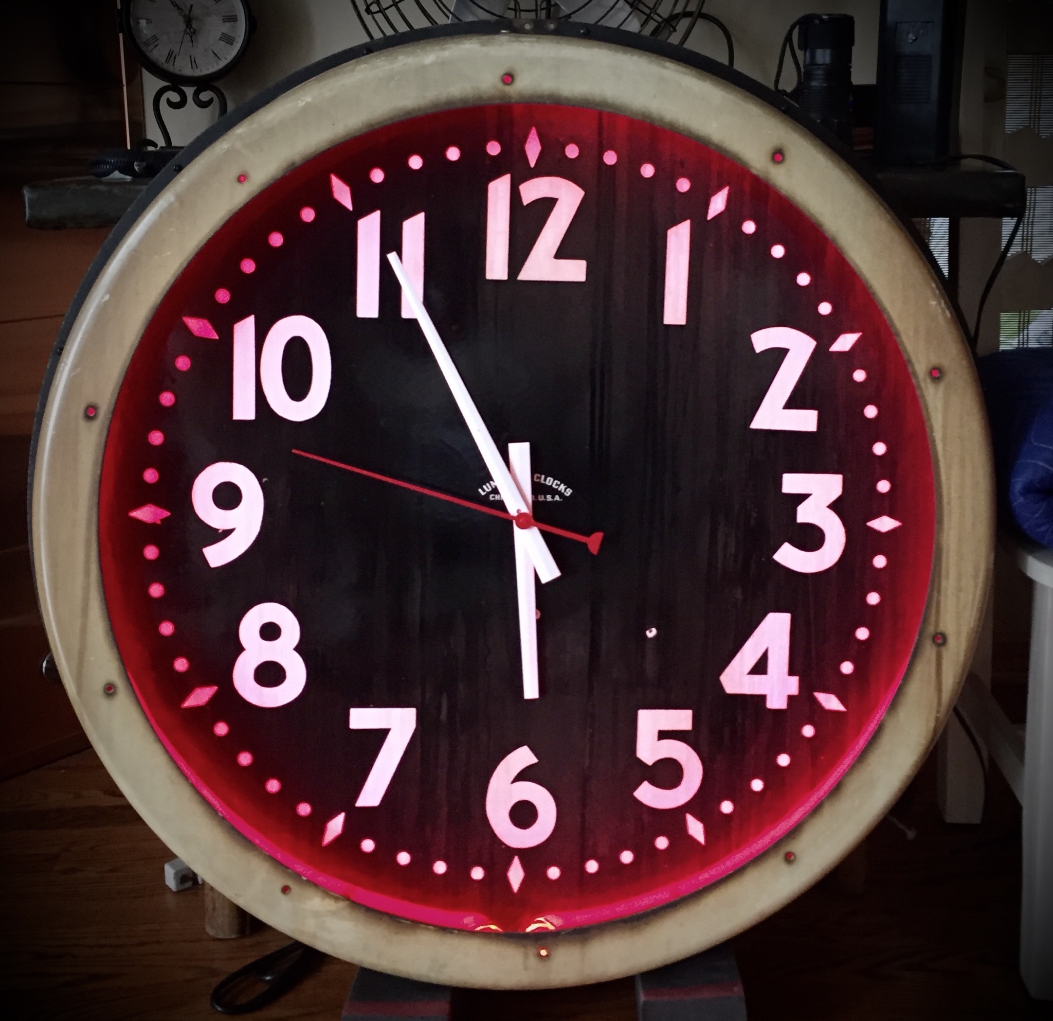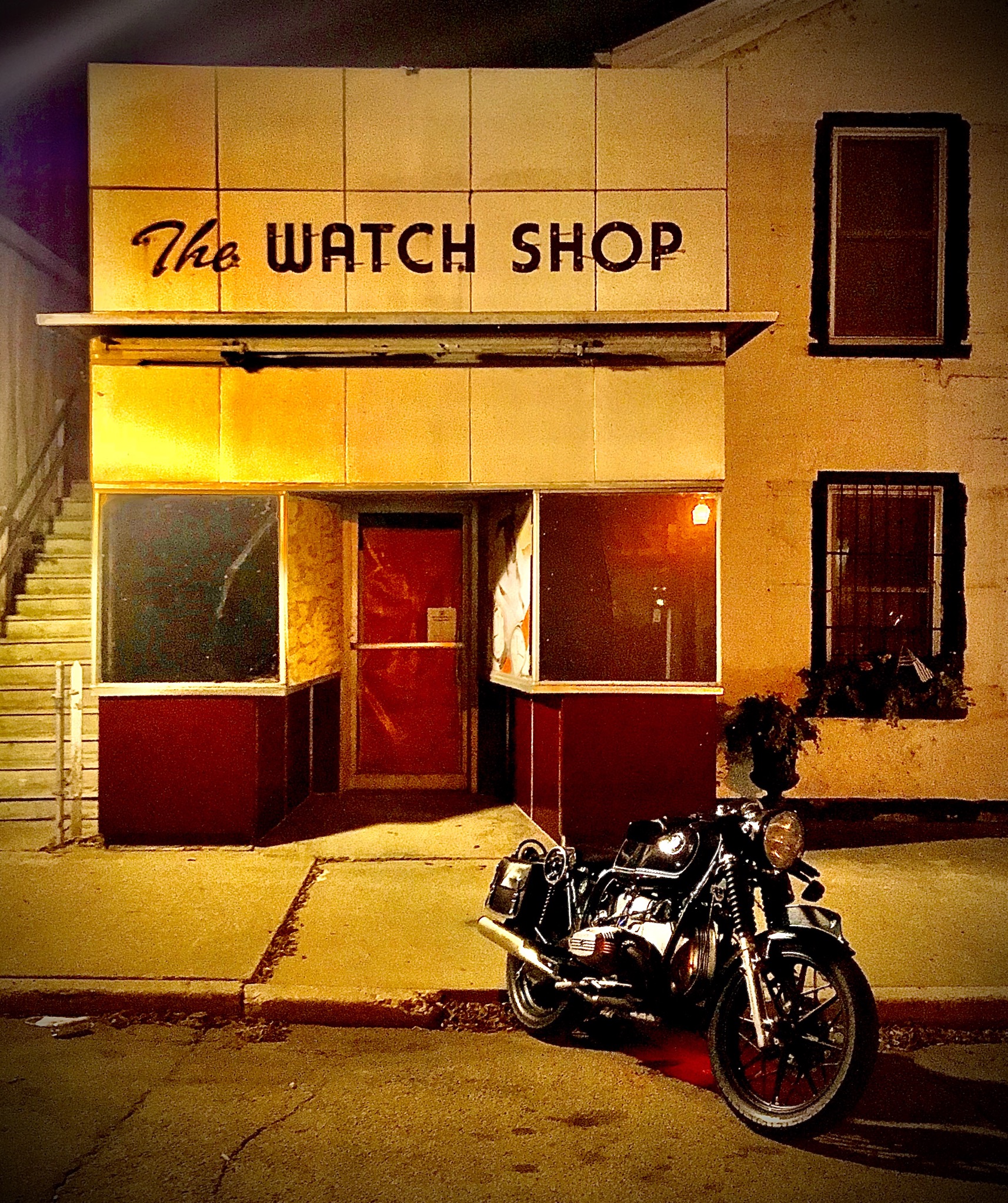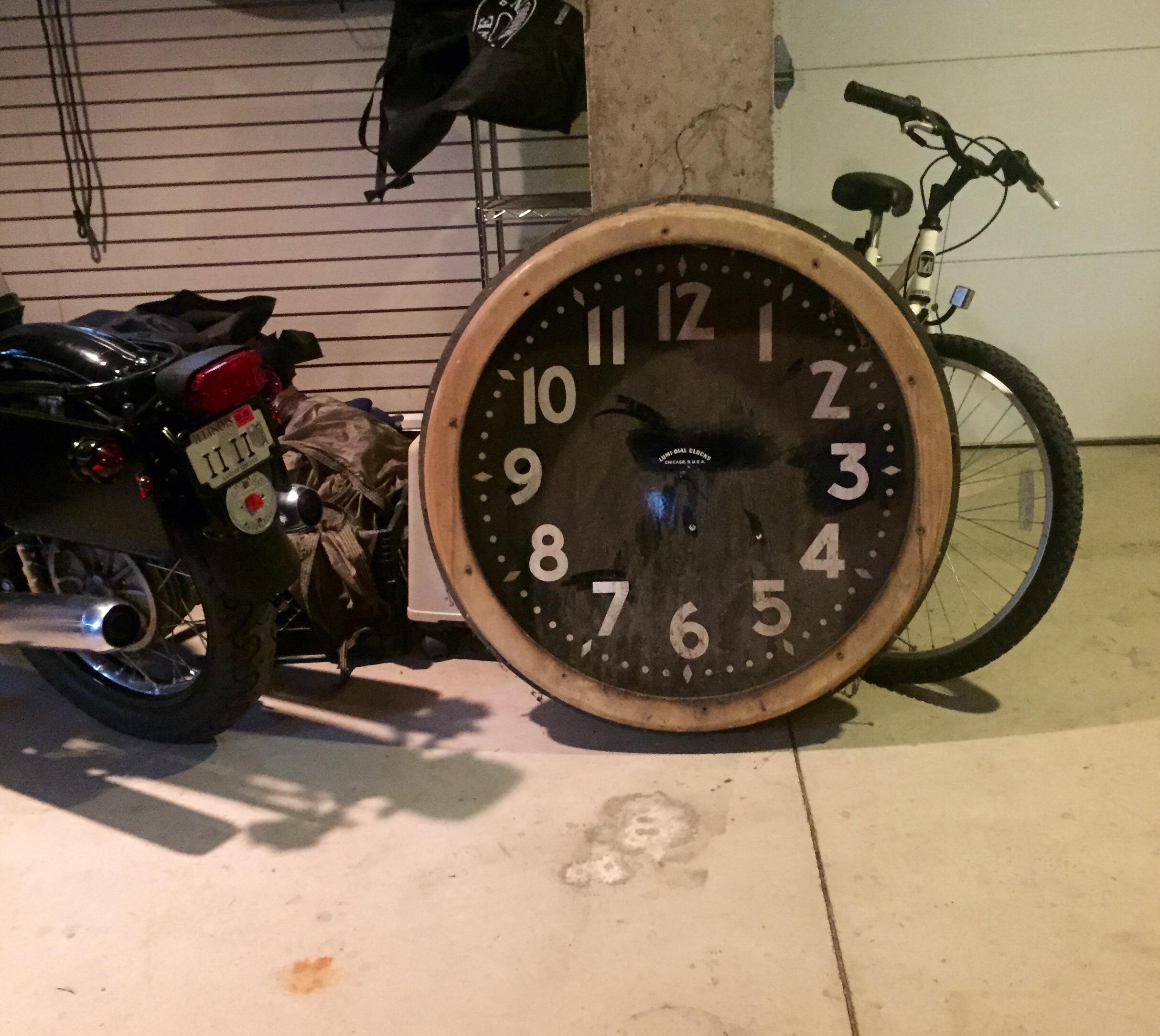 I’ve been making good progress on the old watch shop. New (complete) roof timber’s and all. The building was completely gutted and steam cleaned. New electric service and all. Now the hard part comes. Removing all the porcelain facade panels off the front. Carefully clean each one. Rebuild the structure using box tube steel. And then Re-install all of the panels and new glass and frames. Instal neon. Etc. Some before and after pictures here. Also as an added bonus an old clock was found in the basement. It just look like a dirt covered gig circle. I wiped a bit with water and was amazed to see porcelain. I’ve already cleaned what turned out to be a 1940’s 36” lumidial clock made in Chicago. Very rare because of its size. The movement is a lumicron 10. I’m looking for another. In the meantime I’ve put a high torc quartz mudder in it for display in my home. I just love the clock. Turns out it’s worth more than what I paid for the old watch shop. $10.000. Cool. Another pic unrealated, my old bike with a 1915 car clock. Time is more important than speed to me.