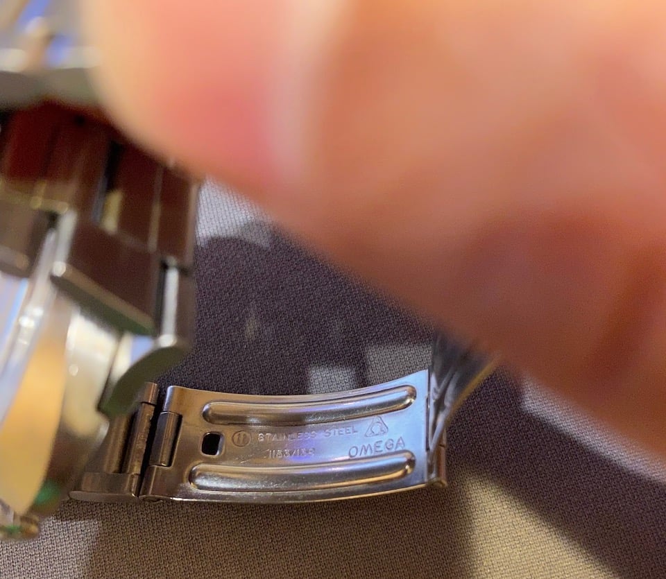 As far as I can tell, this looks like a reference 166.0079 (also seen it as 166.079 in many places) with the 752 calbre day-date movement. Again purely based on what I've read and what I can see on the exterior of the watch, it looks all original (but certainly if anyone sees anything that stands out, please point it out!). My dad said it came with both the "leather" (Corfam) and steel bracelet; he has no idea what happened to the Corfam one over the years, so it just has the steel one. The watch winds easily using the crown or via the automatic mechanism as I wear it, and setting the date/time seems to work consistently with how I've seen the 752 described (pull out one position to set time, no hacking, need to move forward 24 hours at a time to get the day of the week to advance, pulling out to the next position advances the day of the month by one number each time). The dial says T SWISS MADE T, and there is lume on the hands and hour markers that is very very dim, consistent with 50 year old tritium (gone through 4 half-lives at this point). If I shine a bright flashlight on the face, the lume will glow for just a few seconds before fading back to its very dim level. The crystal has the Omega logo in the center; not sure if it was replaced when it was serviced. It "looks" old to me, with some scratches and such, but I have no way of knowing. Similarly, the crown has the Omega logo on it, but I have no idea if it was replaced on servicing. The case and bracelet overall have a number of scratches and wear on them as well, but the sunburst finishing on the bezel is still there, so whoever did do the servicing didn't do any polishing as far as I can tell. Heck, all of the scratches could have just come from rolling around in the box with the other watches - all the wear on the caseback looks like it just came from the bracelet rubbing against it. 馃榾