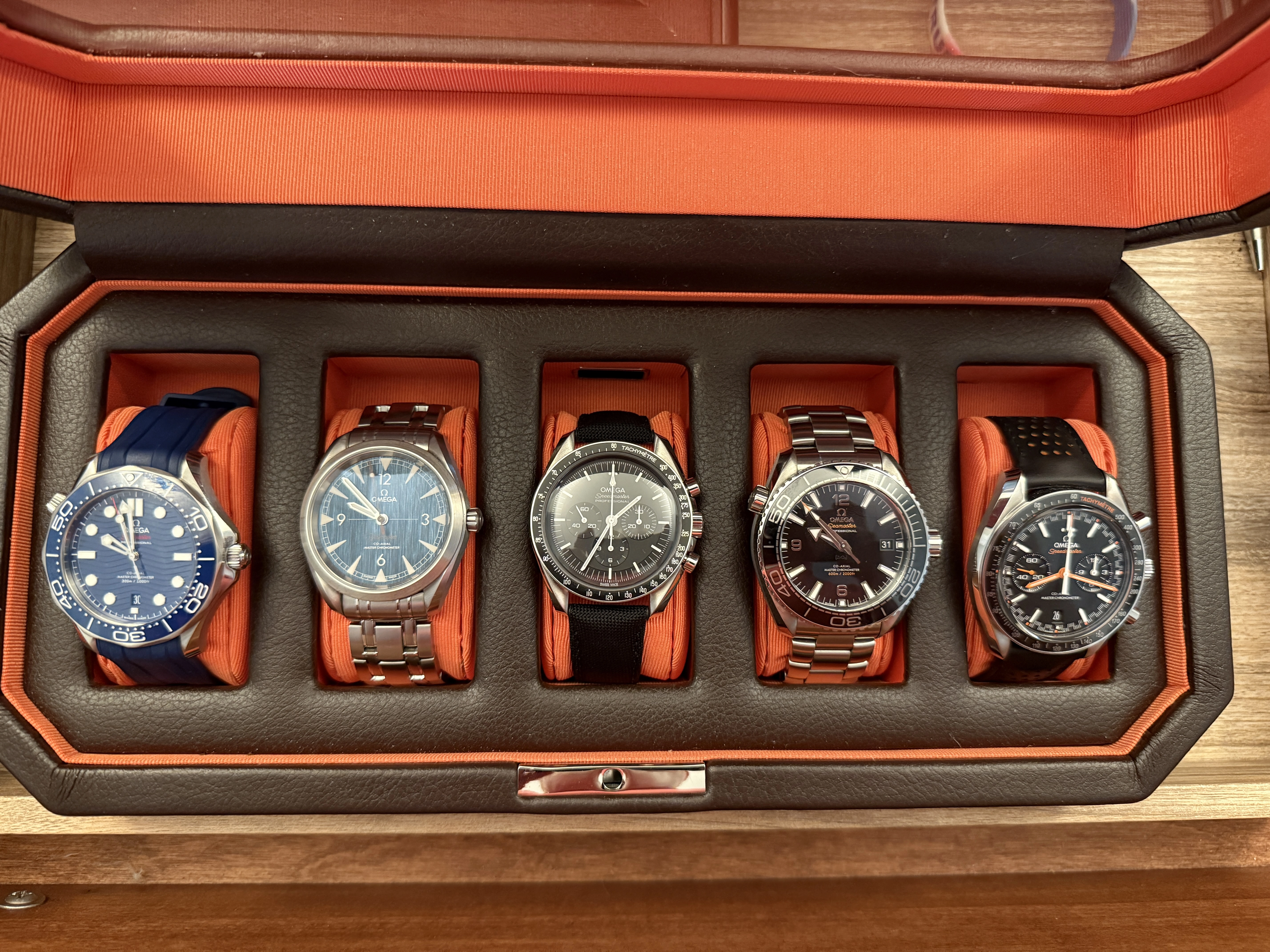 ·Hello. New member here. Unabashed Omega fan. I currently own five of them but I’m strongly considering adding a Seaweed Diver 300 to my collection.. Here’s a family photo. (L-R) Diver 300, Railmaster, Speedmaster, Planet Ocean, Speedmaster Racing. Eagle-eyed observers may notice the Railmaster is wearing a Diver 300 bracelet. I bought the bracelet to use on the blue Diver 300 but I went back to the rubber strap. The Diver 300 bracelet is more comfortable than the Railmaster bracelet plus it has micro adjust. It looks a little weird though on the Railmaster. The jury is still out on whether or not I’ll leave it on. I‘ve had the blue rubber strap on the Railmaster before and it really works well. I might just order another one and sell the Diver 300 bracelet. We’ll see. I also own a Breitling Colt SuperQuartz and the obligatory G-Shock. Nice to meet you.